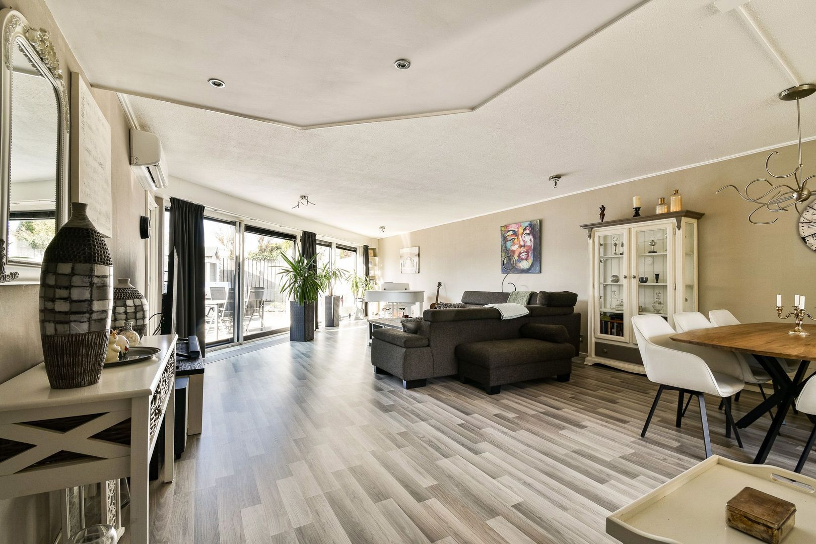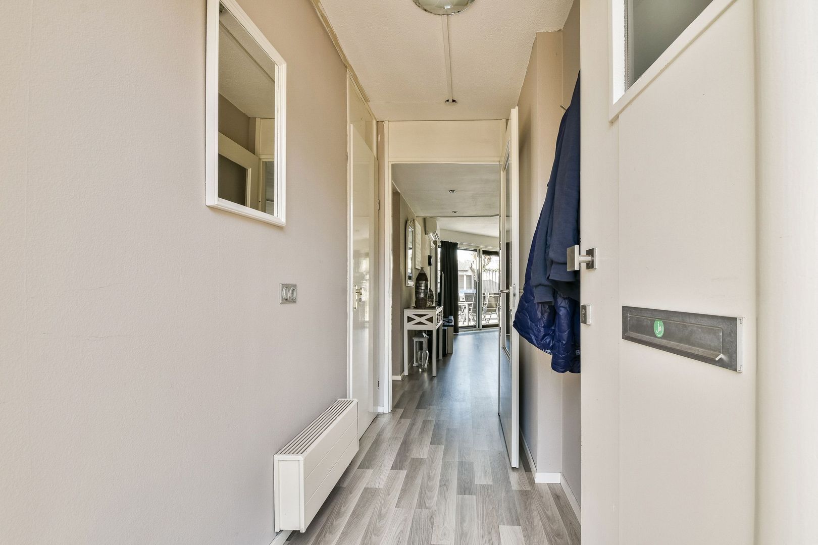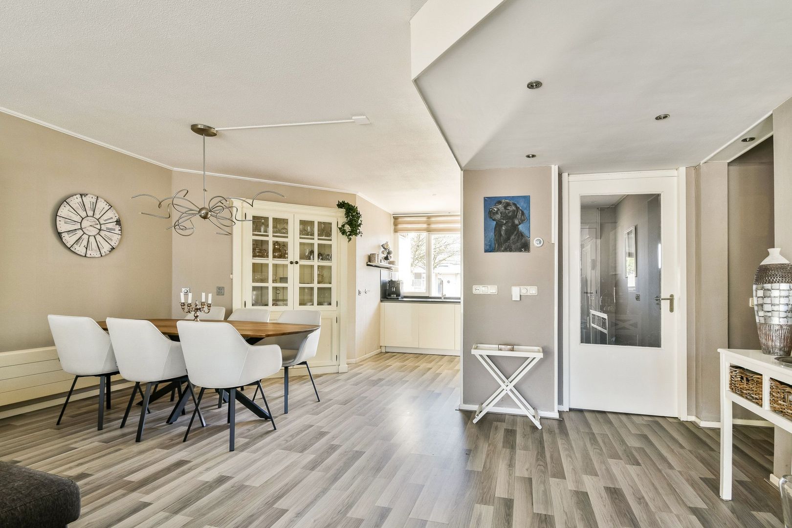 Entree, nieuwe voordeur, hal voorzien van een laminaatvloer die doorloopt naar de meterkast en de zeer royale living met open keuken van totaal 58 m2 met een bijzondere vormgeving.