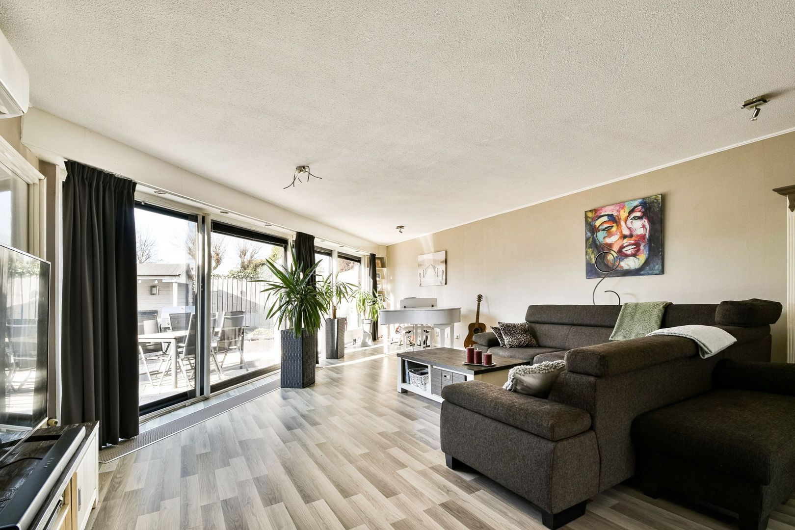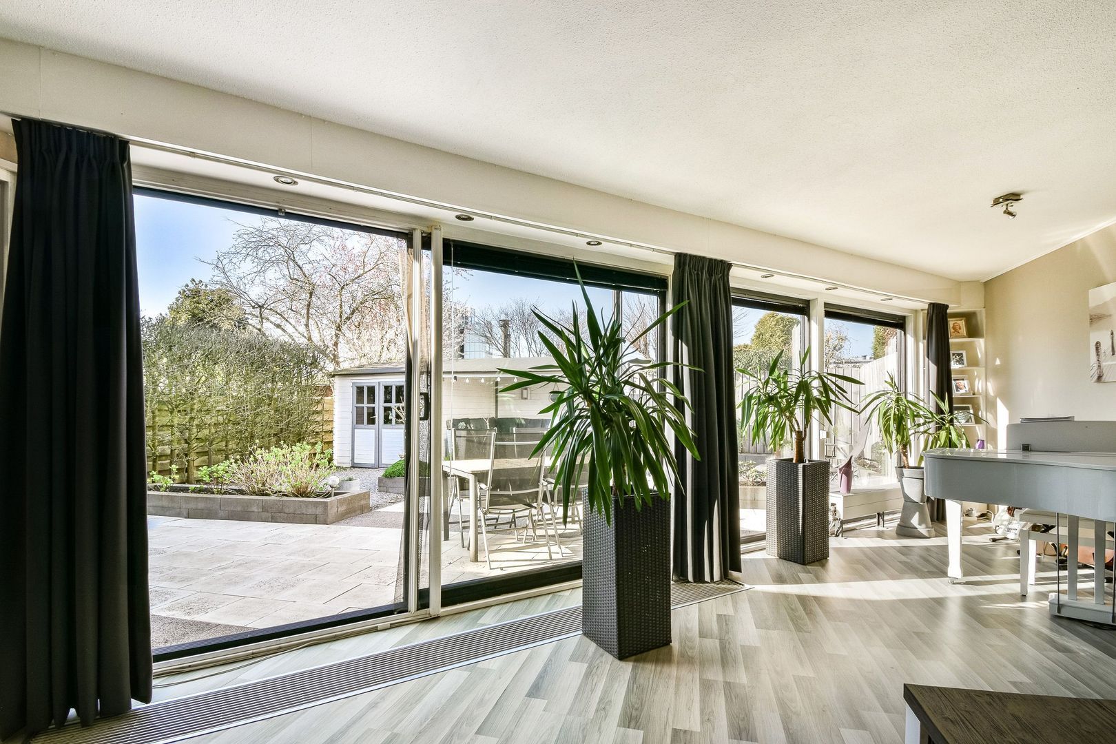 De woonkamer is uitgevoerd met een dubbele, nieuw geplaatste aluminium schuifpui met HR++ dubbel glas en biedt een mooi zicht op de tuin. De woonkamer heeft veel glasoppervlakte en daardoor een prettige lichtinval.