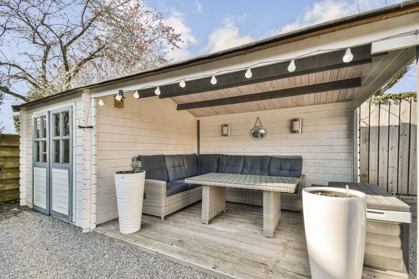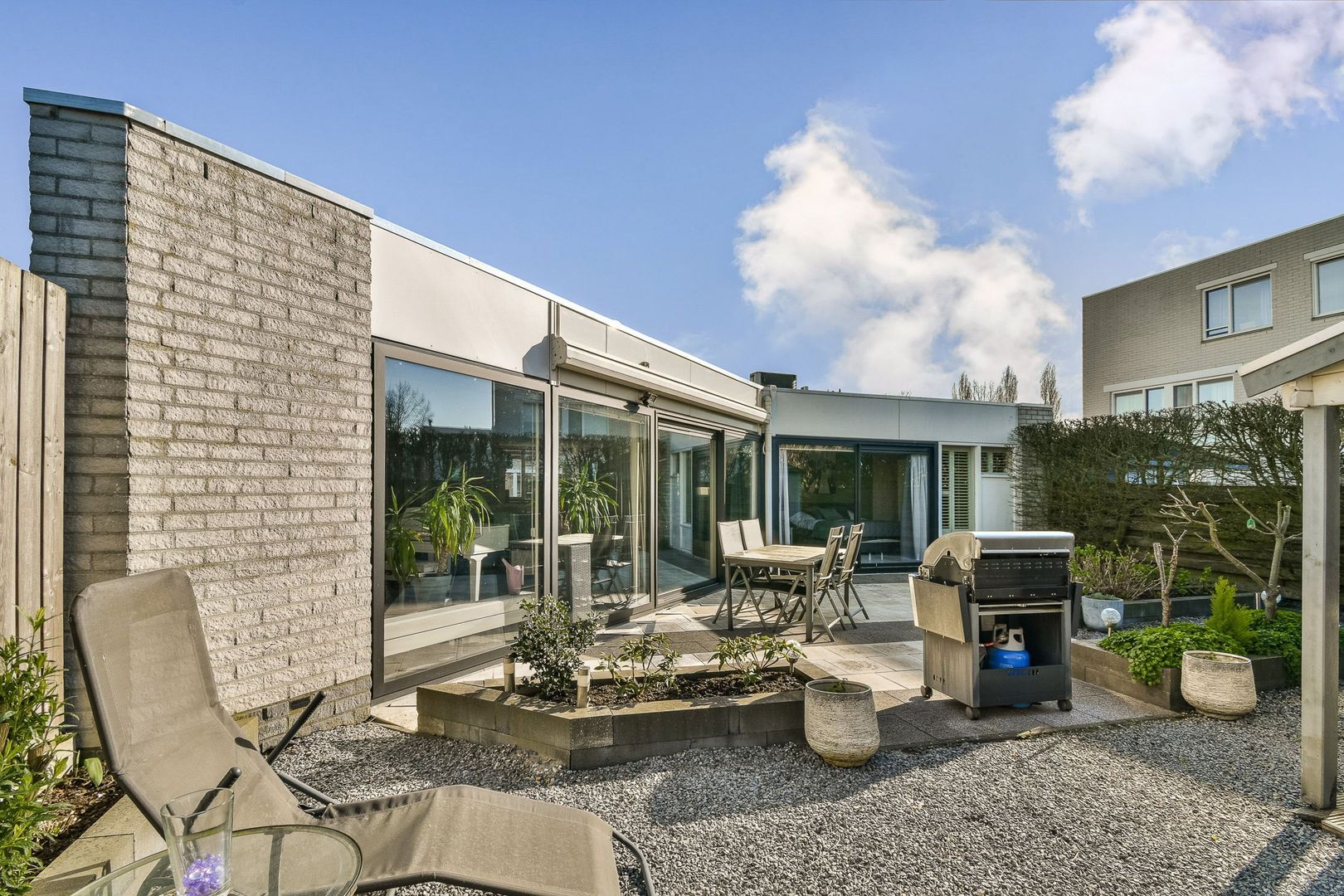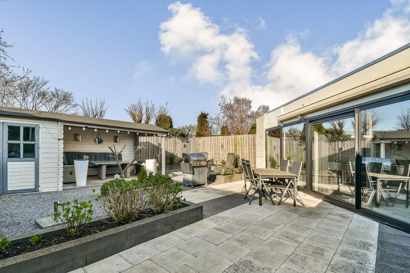 De woning heeft een ruime patiotuin van gedeeltelijk 10 m diep en 11 m breed, gelegen op het noordwesten. Grote chaletschuur van ca 6 m2 met sfeervolle overkapping. De tuin is verzorgd aangelegd met diverse terrassen en veel groen. Ook zijn er elektrische zonwering en rolluiken aan de straatzijde. Inpandige berging van ca. 6,5 m2 aan de voorzijde, voorzien van elektra.