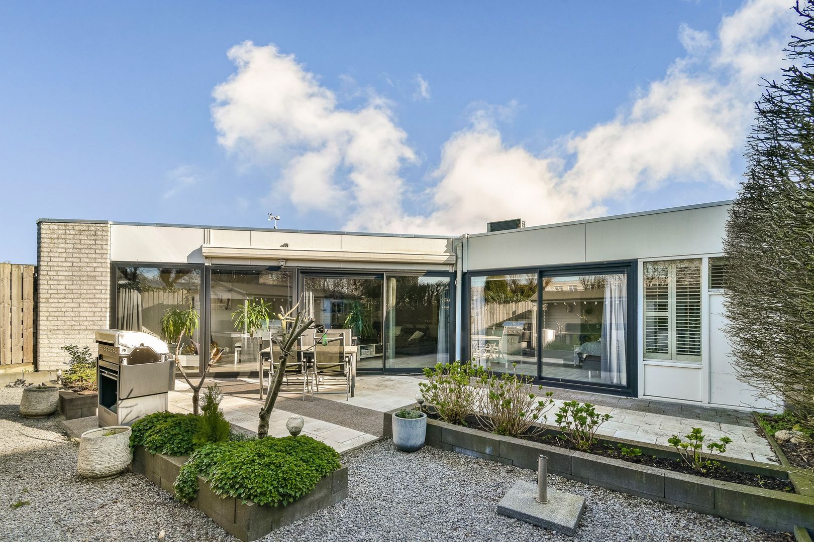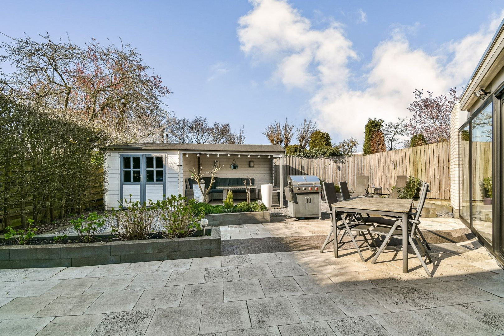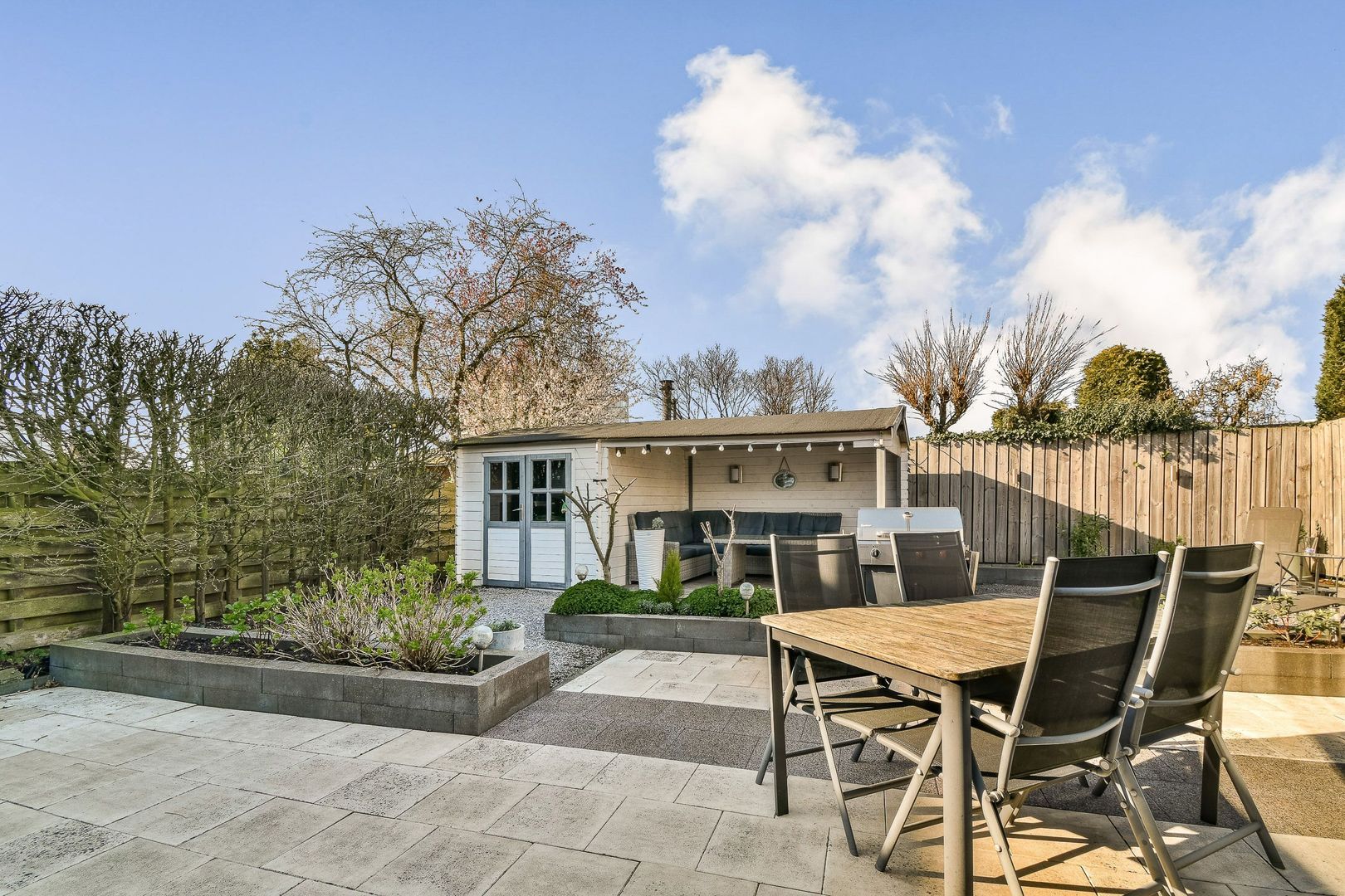 De woning heeft een ruime patiotuin van gedeeltelijk 10 m diep en 11 m breed, gelegen op het noordwesten. Grote chaletschuur van ca 6 m2 met sfeervolle overkapping. De tuin is verzorgd aangelegd met diverse terrassen en veel groen. Ook zijn er elektrische zonwering en rolluiken aan de straatzijde. Inpandige berging van ca. 6,5 m2 aan de voorzijde, voorzien van elektra.