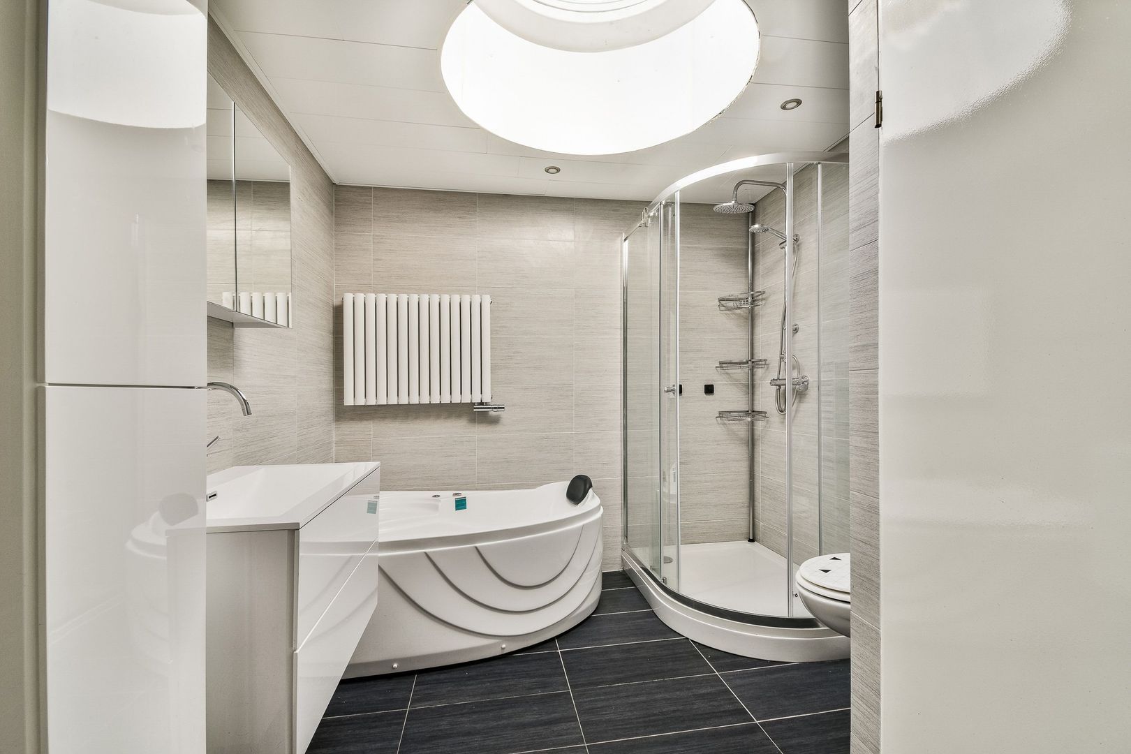 Ruime, vergrote badkamer met douchecabine, thermostaatkraan, 2e toilet, whirlpoolligbad, ruim wastafelmeubel, badkamerkast, handdoekradiator, te openen lichtkoepel en systeemplafond met ingebouwde verlichting.