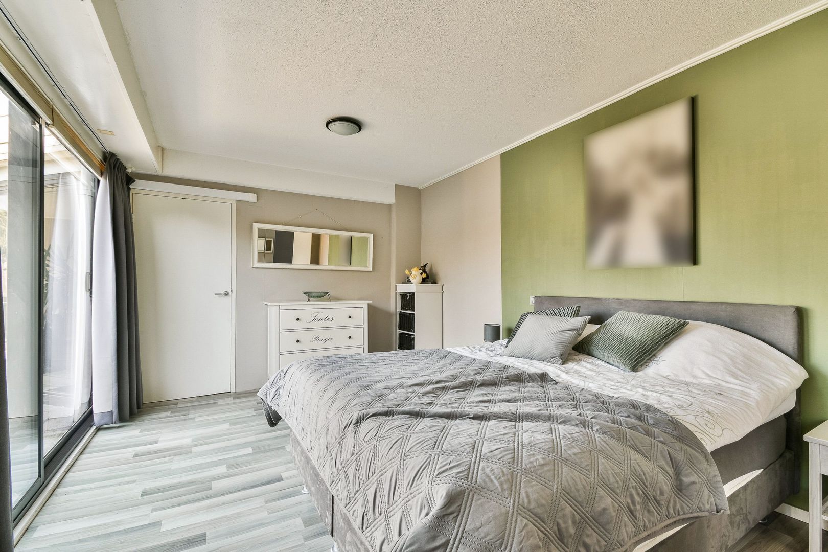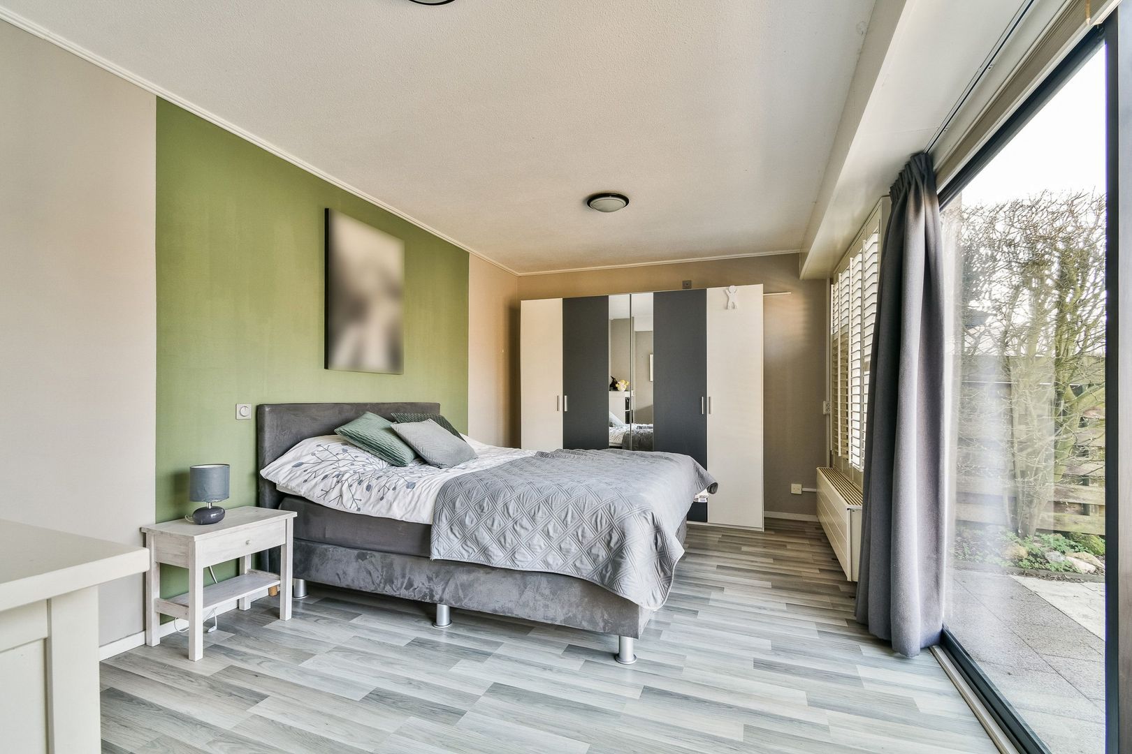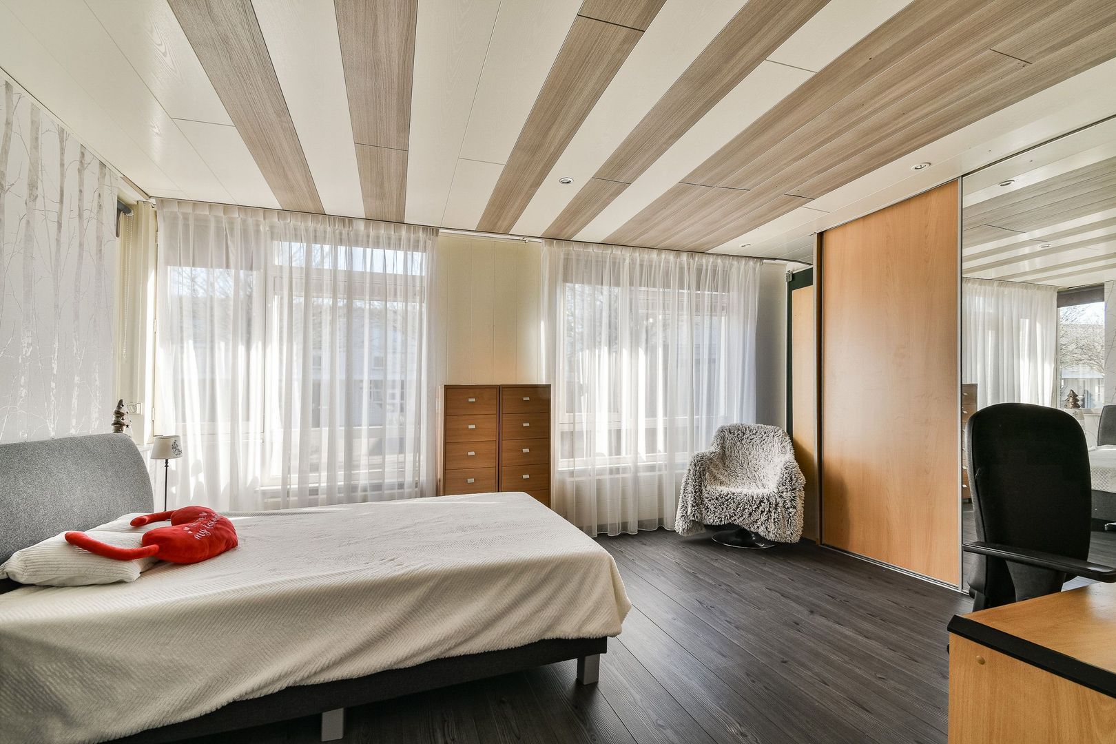 Via de gang is de hoofdslaapkamer bereikbaar. Deze grote kamer (voorheen 2 kamers) heeft een oppervlakte van 21 m2 en is voorzien van een mooie laminaatvloer, systeemplafond, kastenwand en rolluiken.