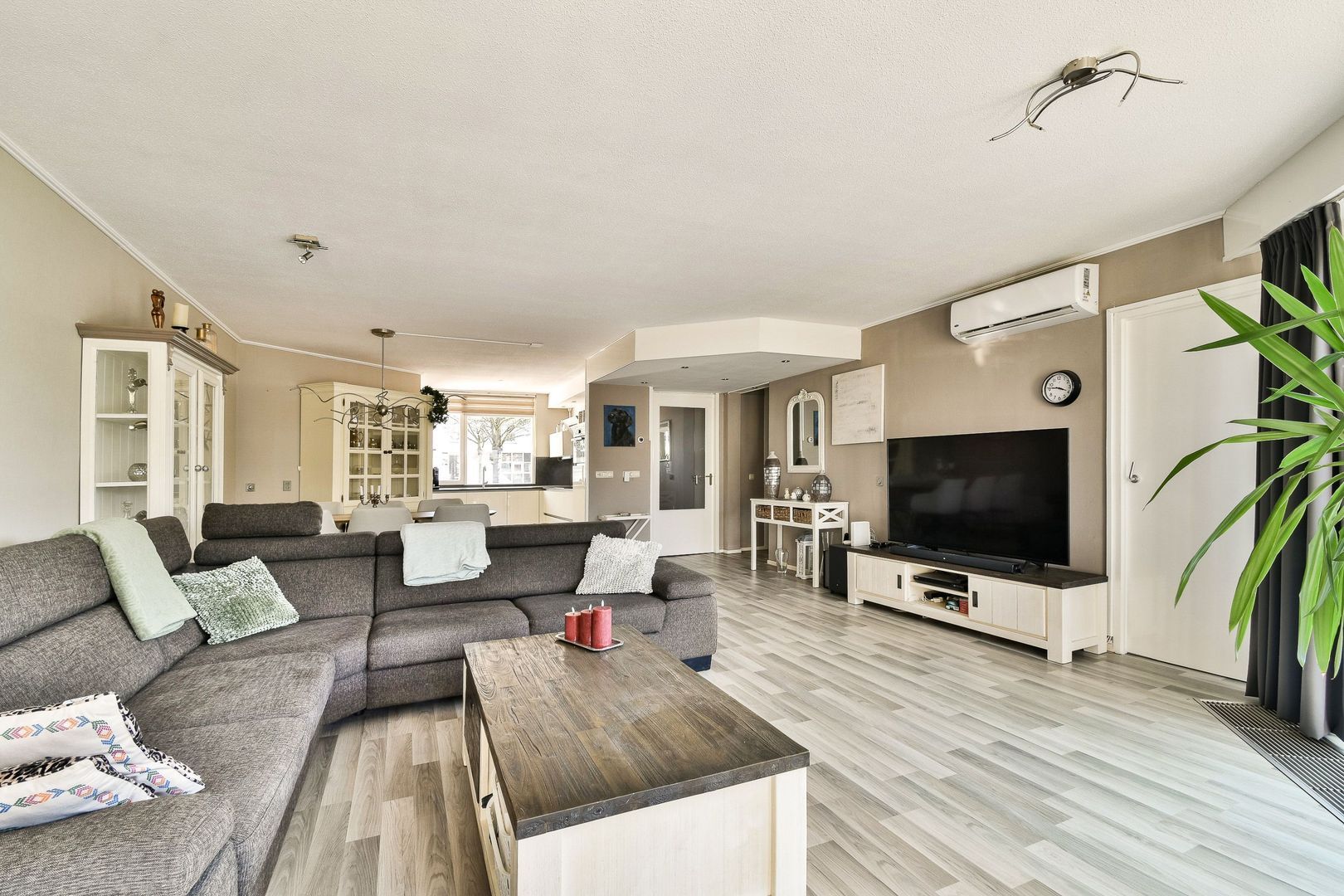 • Laminaatvloer in woonkamer en keuken gelegd over wit marmeren vloer;