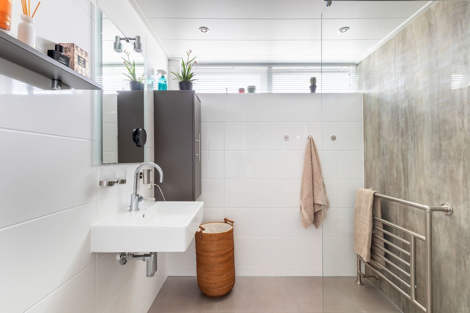 Overloop met apart 2e toilet met fonteintje. Voorslaapkamer van 16,5 m2, aan de achterzijde een slaapkamer van ca. 16 m2 en een slaapkamer van ruim 8 m2. De twee grootste slaapkamers zijn voorzien van een laminaatvloer met V-groef. De badkamer van ca. 5 m2 uit december 2016 is gedeeltelijk betegeld en gedeeltelijk voorzien van MDF-wandafwerking met een PVC toplaag. Het plafond is verlaagd met inbouwspots en er is mechanische ventilatie en elektrische vloerverwarming aanwezig. De badkamer is uitgevoerd met een inloopdouche met glazen scherm, wastafel met bijbehorend meubel en een fraaie RVS-designradiator.