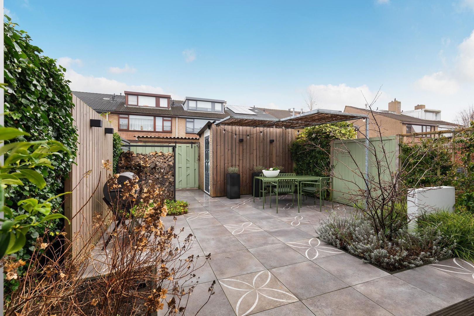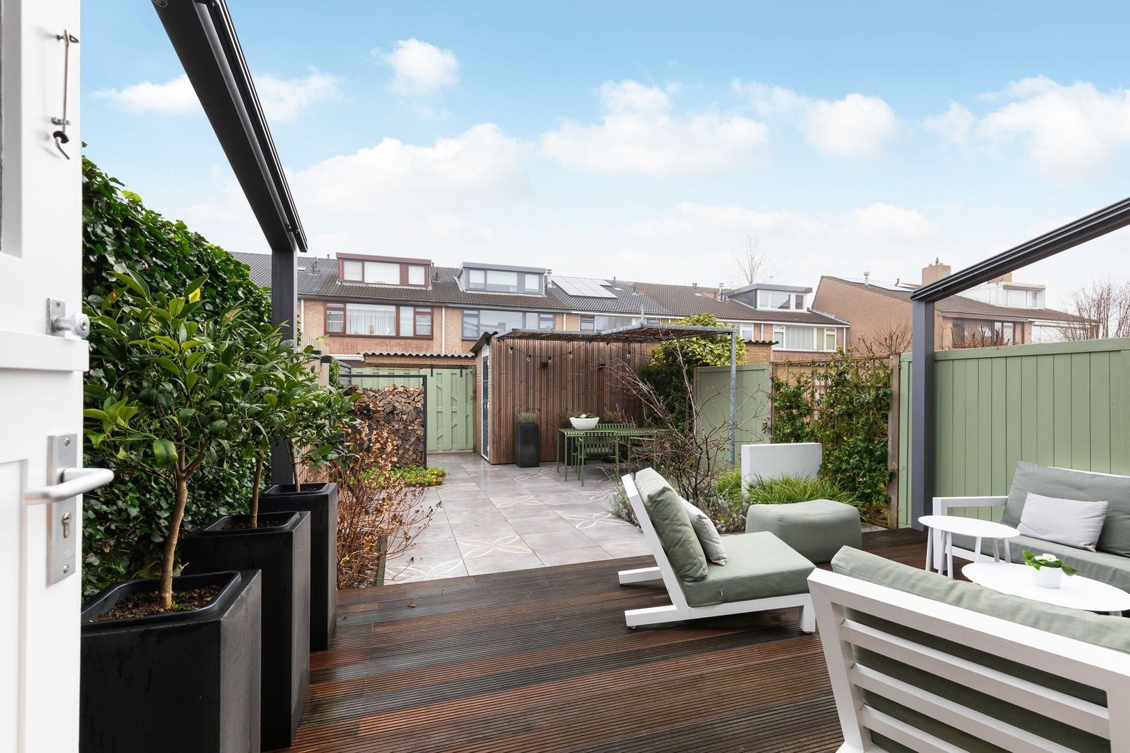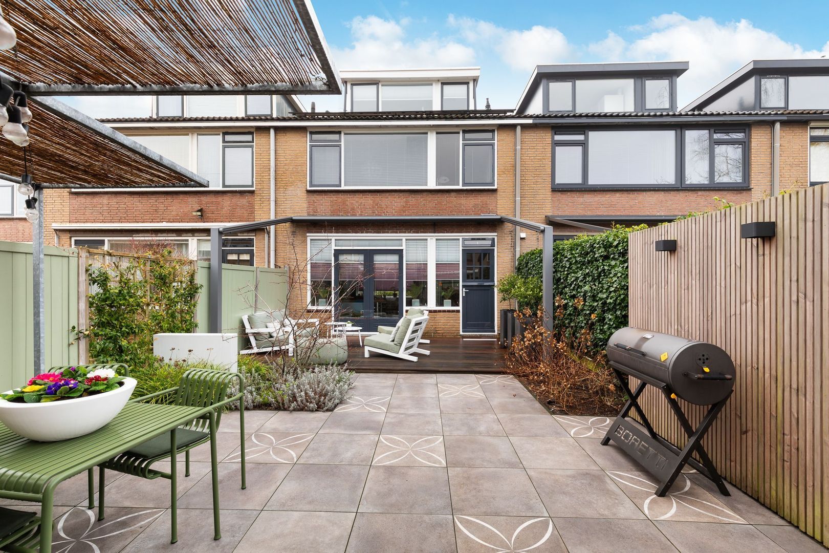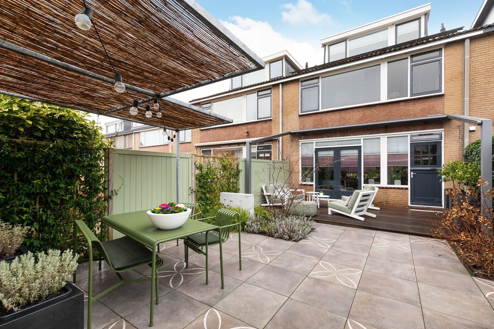 Fraai in 2023 aangelegde achtertuin met achterom op het zuid-westen van ongeveer 70 m2. Het terras is uitgevoerd met Bankirai vlonders, aansluitend is er sierbestrating met keramische tegels, afgewisseld met groenborders. Er is een buitenkraan aanwezig en achterin de tuin staat de berging van ca. 6,5 m2. Aansluitend aan de berging is een mooie zonoverkapping. Extra bijzonder is het elektrisch bedienbare, weersbestendige zonnescherm met een uitvaldiepte van ca. 3,5 m2 en daarmee een oppervlakte van 18,5 m2.
