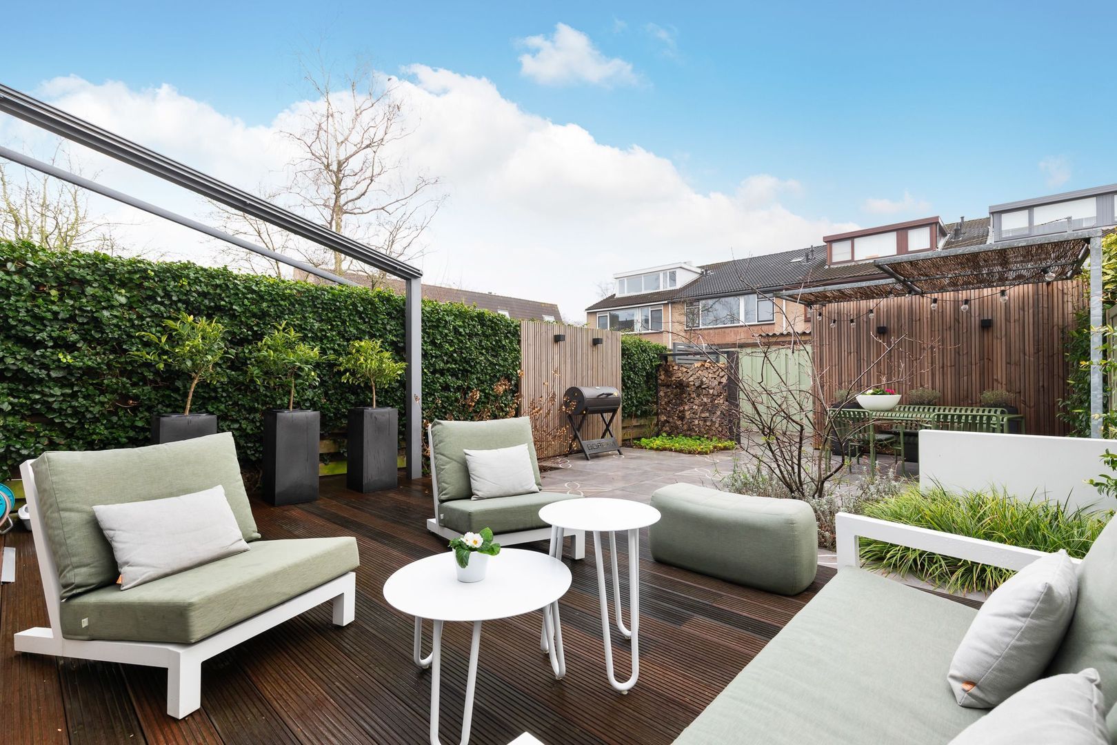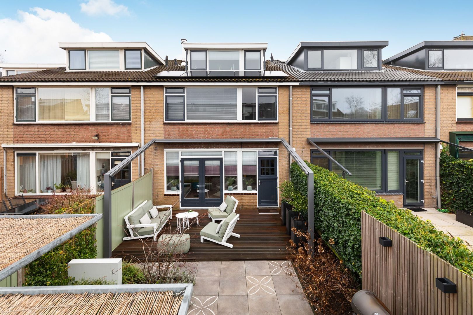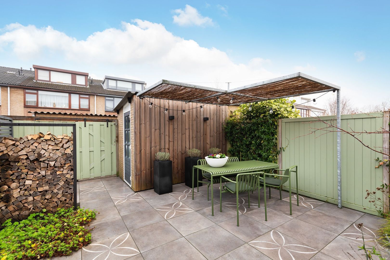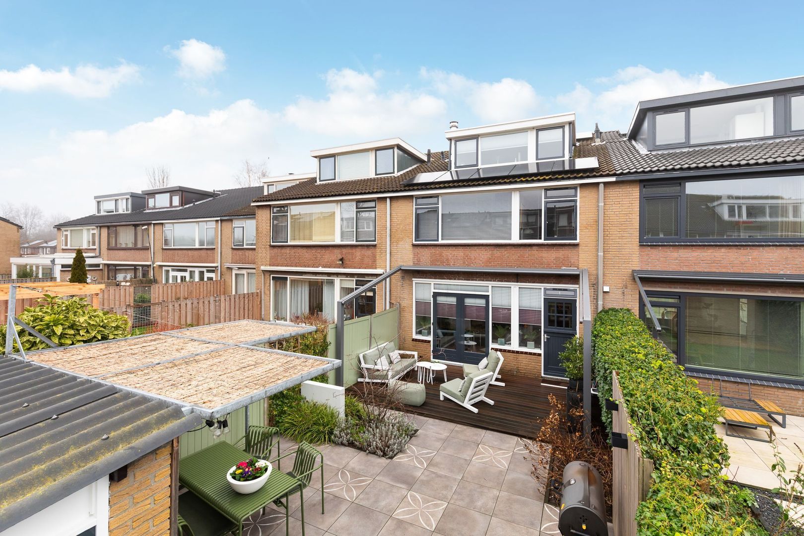 Fraai in 2023 aangelegde achtertuin met achterom op het zuid-westen van ongeveer 70 m2. Het terras is uitgevoerd met Bankirai vlonders, aansluitend is er sierbestrating met keramische tegels, afgewisseld met groenborders. Er is een buitenkraan aanwezig en achterin de tuin staat de berging van ca. 6,5 m2. Aansluitend aan de berging is een mooie zonoverkapping. Extra bijzonder is het elektrisch bedienbare, weersbestendige zonnescherm met een uitvaldiepte van ca. 3,5 m2 en daarmee een oppervlakte van 18,5 m2.