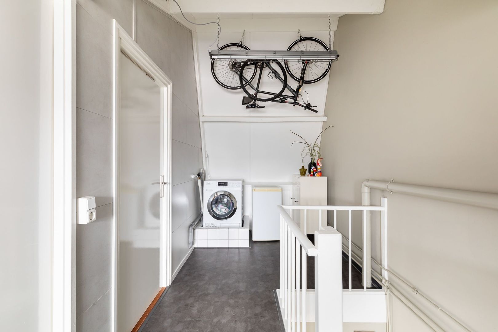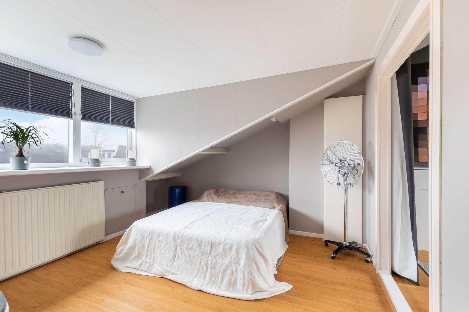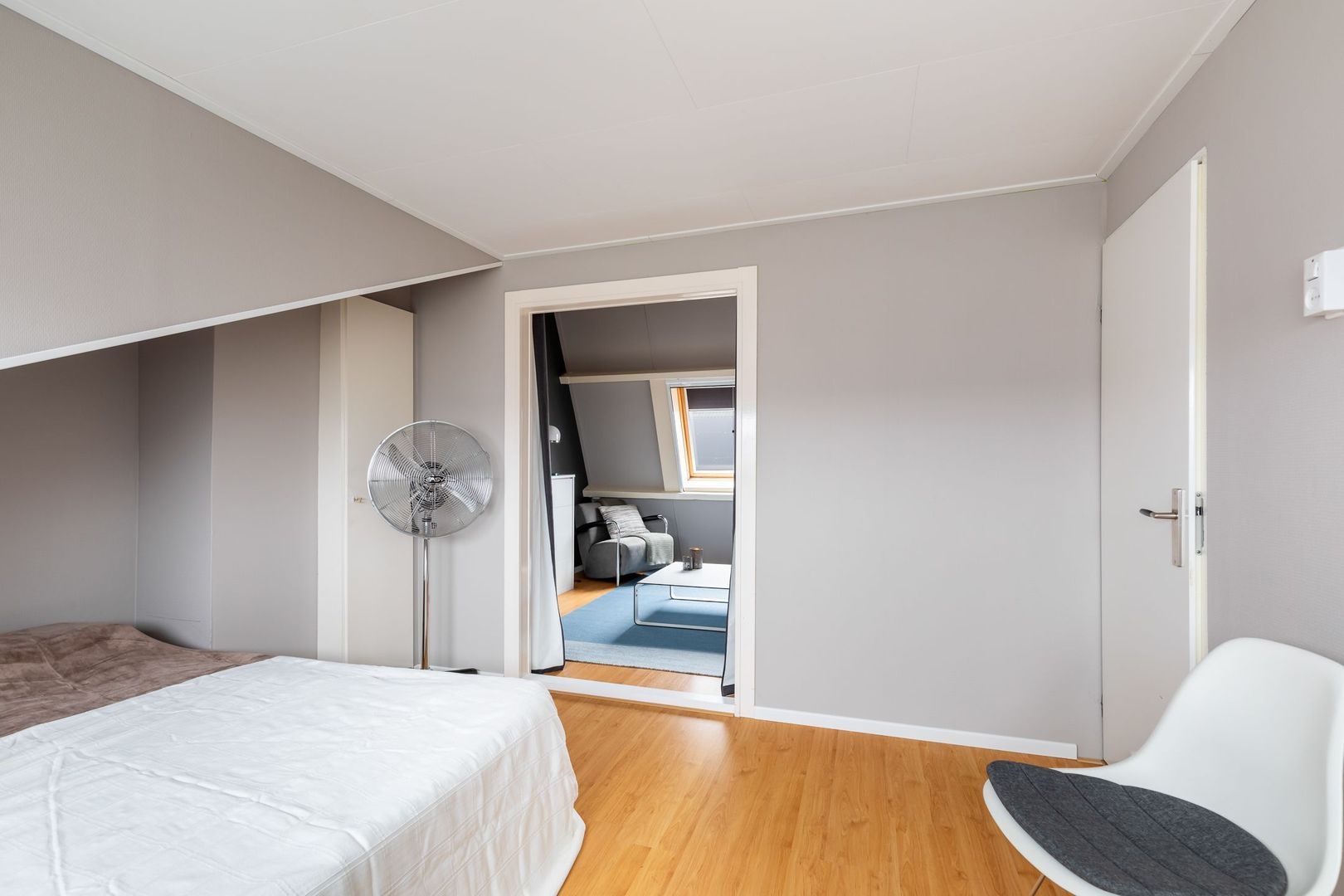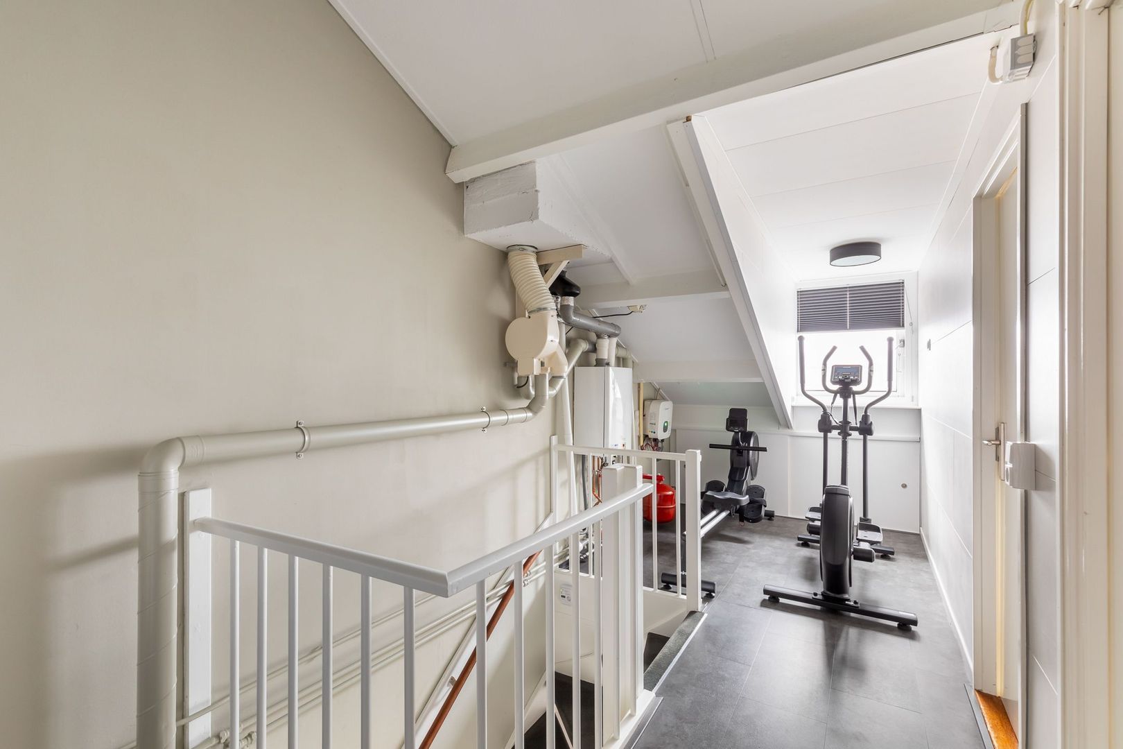 Vaste trap naar ruime overloop/voorzolder met dakkapel, opstelling combi CV-ketel (Remeha Avanta 2017), unit mechanische ventilatie en wasmachine. De dakkapel loopt door in de slaapkamer aan achterzijde die ongeveer 12,5 m2 groot is en ook bergruimte achter knieschotten heeft. De slaapkamer aan voorzijde heeft een oppervlakte van bijna 14 m2 en heeft een Velux dakraam. Momenteel is er een doorgang tussen de twee kamers. Deze is eenvoudig dicht te maken.