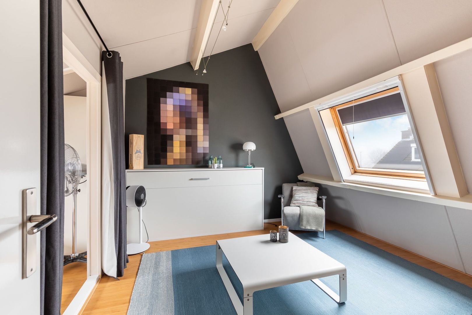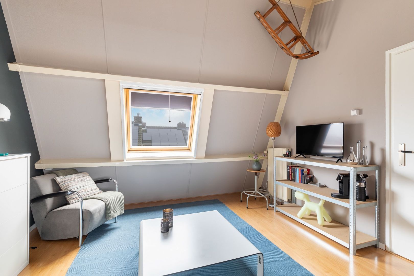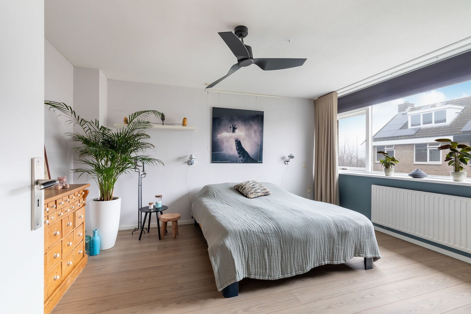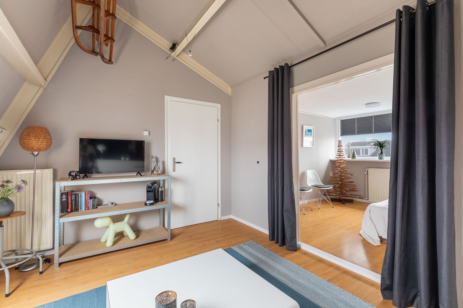 Vaste trap naar ruime overloop/voorzolder met dakkapel, opstelling combi CV-ketel (Remeha Avanta 2017), unit mechanische ventilatie en wasmachine. De dakkapel loopt door in de slaapkamer aan achterzijde die ongeveer 12,5 m2 groot is en ook bergruimte achter knieschotten heeft. De slaapkamer aan voorzijde heeft een oppervlakte van bijna 14 m2 en heeft een Velux dakraam. Momenteel is er een doorgang tussen de twee kamers. Deze is eenvoudig dicht te maken.