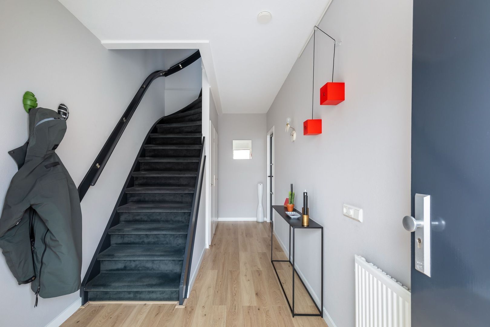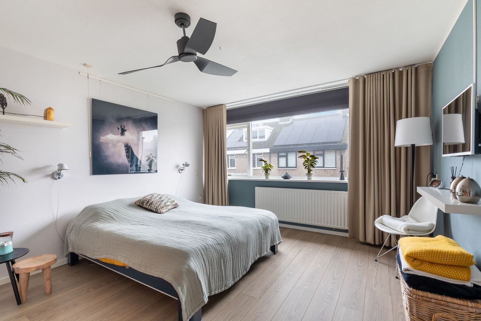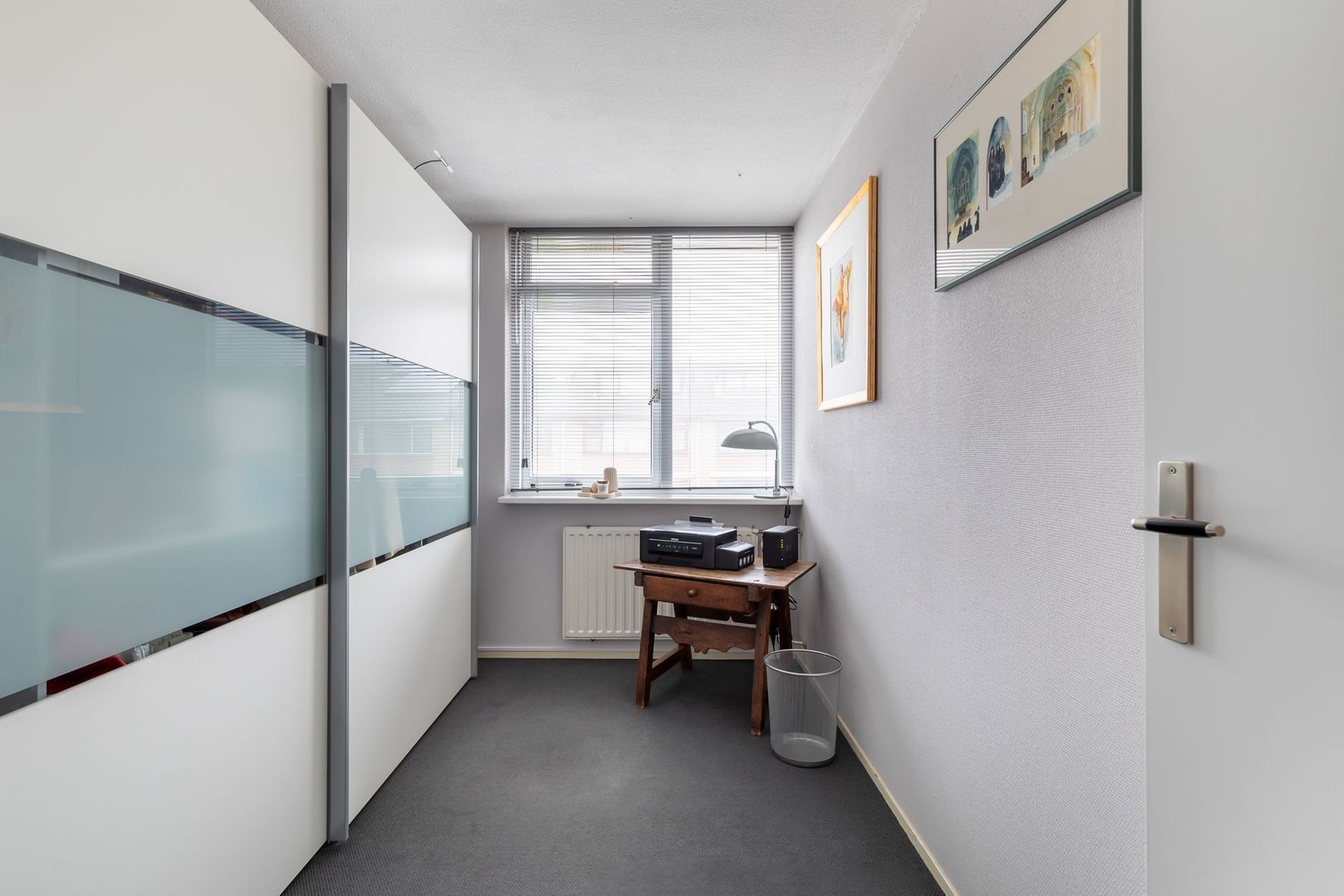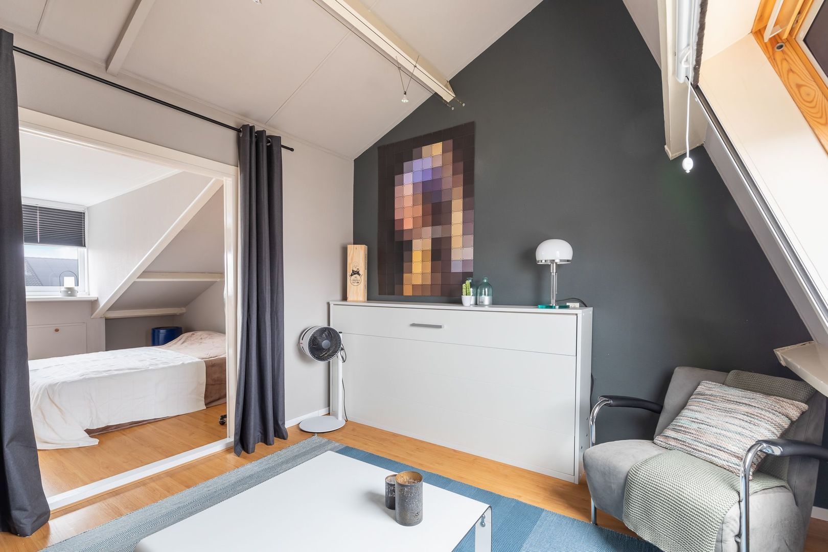 Vaste trap naar ruime overloop/voorzolder met dakkapel, opstelling combi CV-ketel (Remeha Avanta 2017), unit mechanische ventilatie en wasmachine. De dakkapel loopt door in de slaapkamer aan achterzijde die ongeveer 12,5 m2 groot is en ook bergruimte achter knieschotten heeft. De slaapkamer aan voorzijde heeft een oppervlakte van bijna 14 m2 en heeft een Velux dakraam. Momenteel is er een doorgang tussen de twee kamers. Deze is eenvoudig dicht te maken.