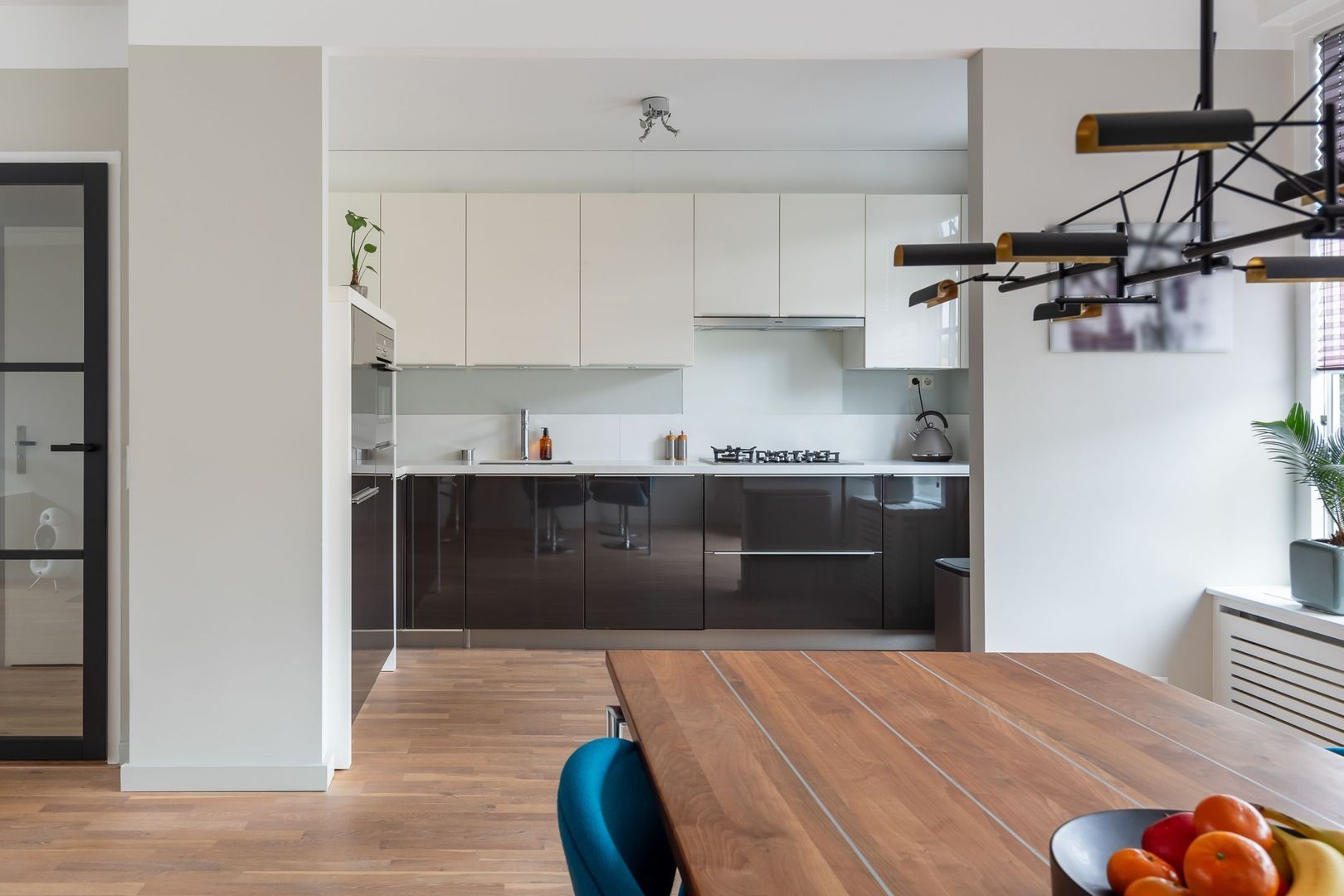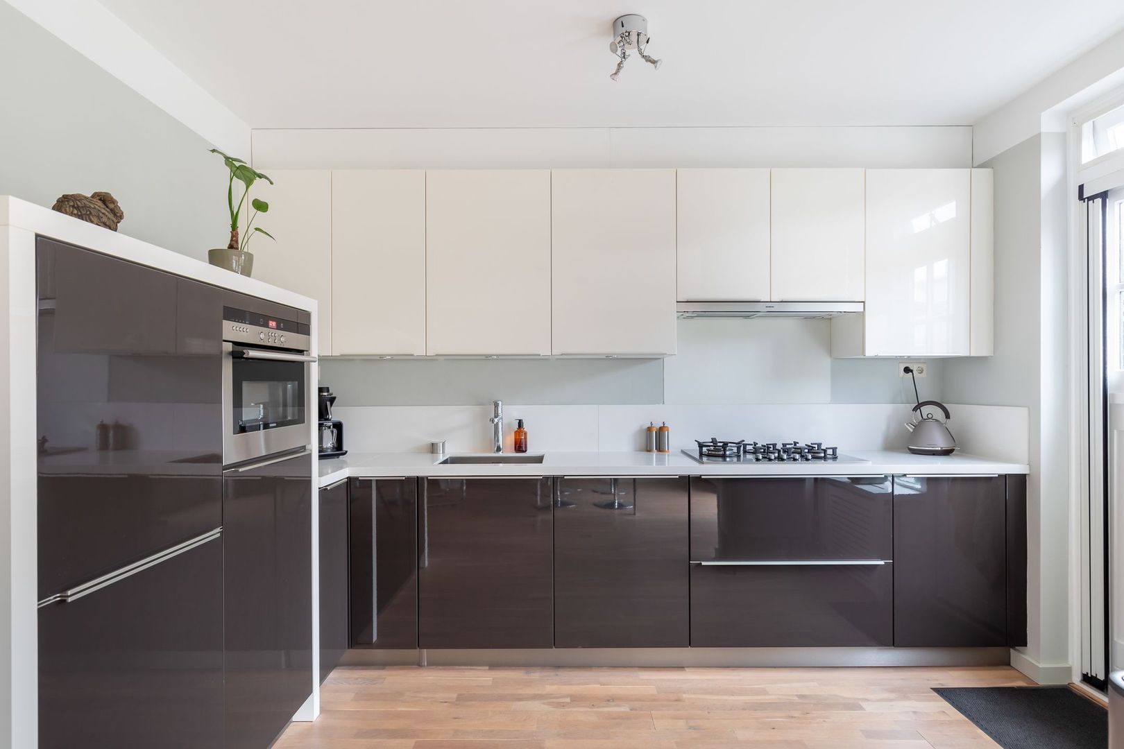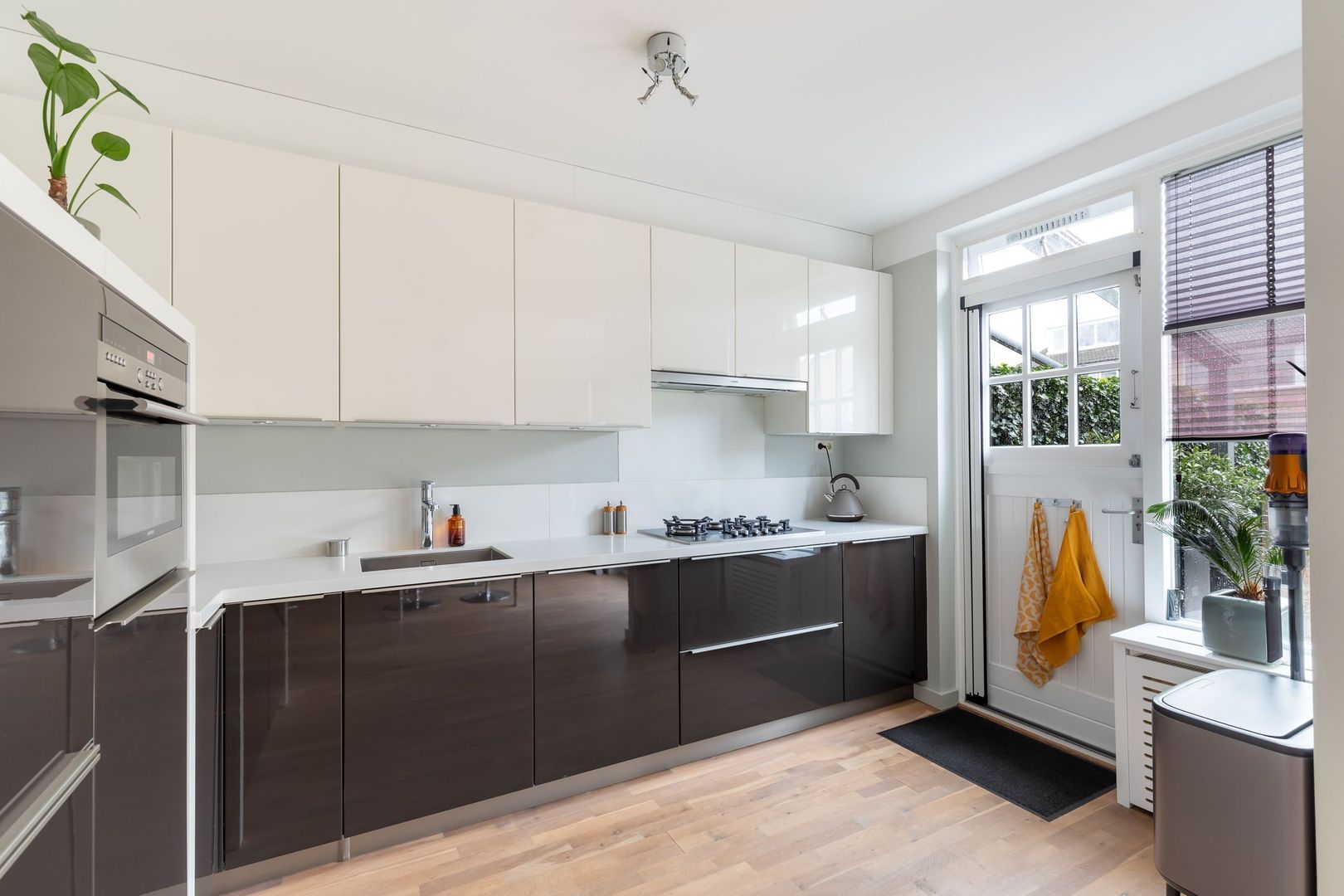 Entree via de keurig aangelegde voortuin. Ruime hal met meterkast, trapkast en toilet met PVC wandafwerking en fonteintje. Royale woonkamer met halfopen keuken van totaal ca. 42 m2. De woonkamer is uitgevoerd met design open haard, radiatorbekleding, en openslaande deuren naar de tuin. De keuken is uitgevoerd met een modern hoogglans keukenblok in hoekopstelling met carrouselkast, inbouwspots, composiet aanrechtblad en de navolgende apparatuur: 5-pits gaskookplaat, afzuigkap, koelkast, grote vriezer, combi magnetron/oven en vaatwasser. Een deur vanuit de keuken heeft eveneens toegang tot de achtertuin. De begane grond is voorzien van een mooie parketvloer en de wanden en plafonds zijn gestuct.