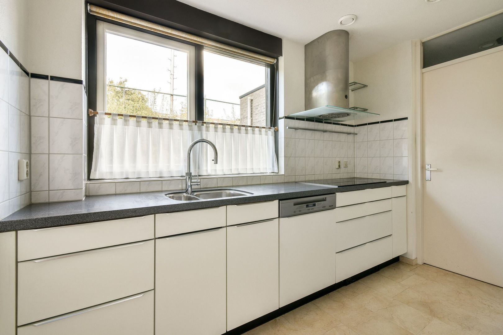Ruime hal met meterkast, en trapkast. Gedeeltelijk betegeld toilet met hangend closet en fontein. L-vormige woonkamer met een totale oppervlakte van ca. 44 m2 en openslaande deuren naar de tuin. Vanuit de woonkamer ook toegang tot de keuken van ca. 7,5 m2 met keukenblok aan twee zijden. De keuken is uitgevoerd met inductie kookplaat, afzuigkap, Quooker, vaatwasser, koelkast, oven en magnetron. Aansluitend aan de keuken ligt de bijkeuken van ca. 3,5 m2 met wasmachine aansluiting en daarachter geeft een deur toegang tot de garage.