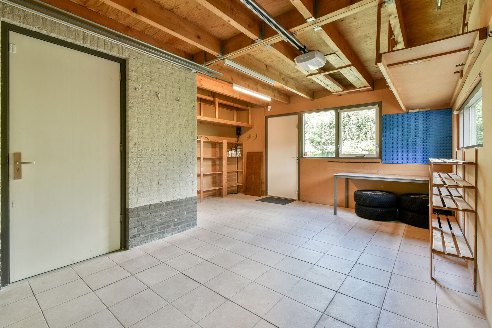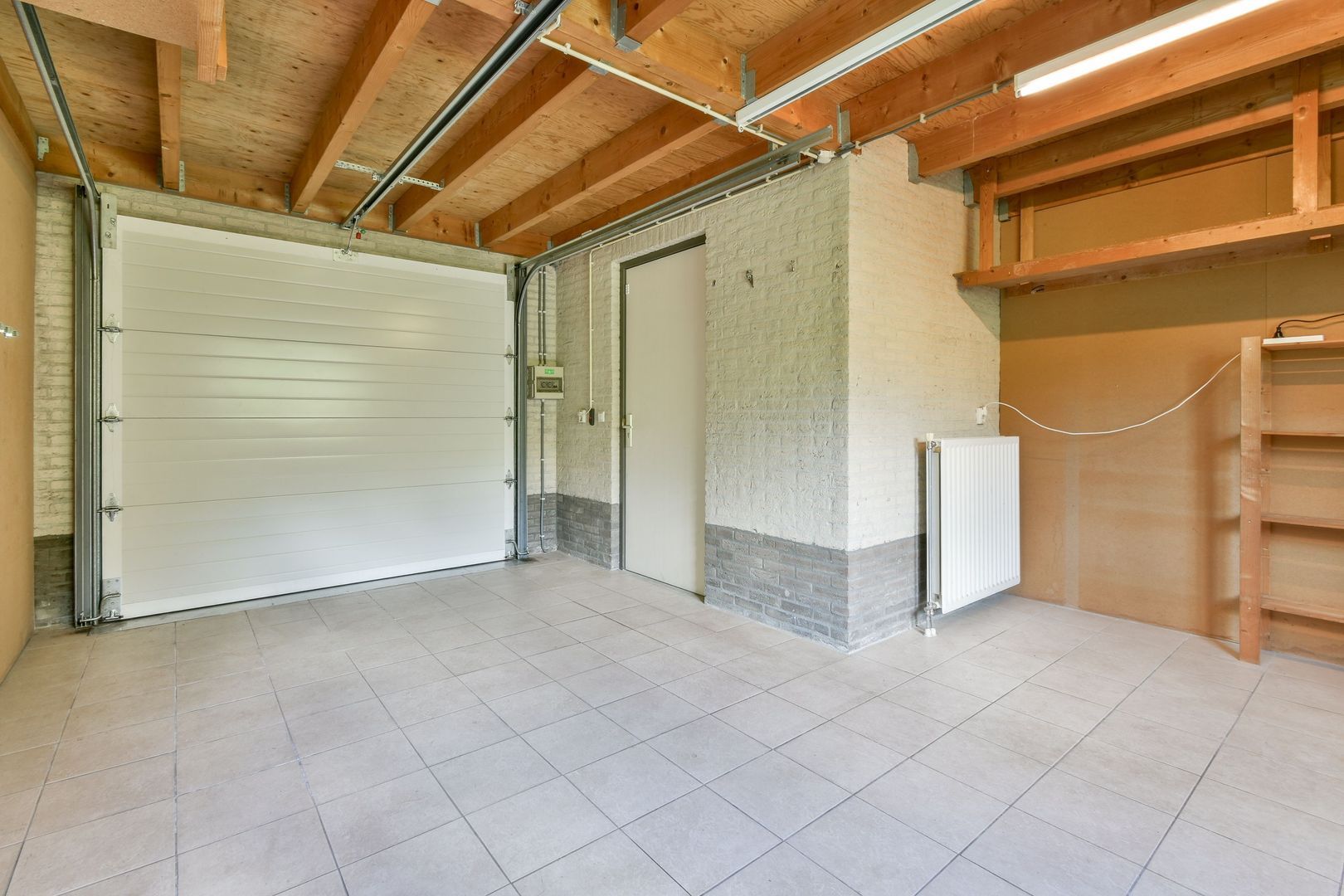 De garage meet bijna 23 m2 en is aan de achterkant breder dan aan de voorzijde. Er is een elektrische garagedeur en aan de achterzijde is een toegangsdeur naar de tuin. In de garage ligt een plavuizen vloer en is er elektra en verwarming aanwezig. Water is eenvoudig te realiseren. Naast het stallen van een auto is de garage ook eenvoudig om te bouwen tot praktijkruimte of andere combinaties van wonen en werken aan huis. Daarnaast is de woning voorzien van zonwering (zonneschermen).
