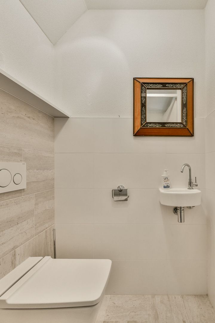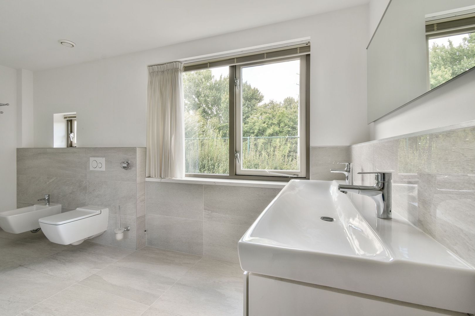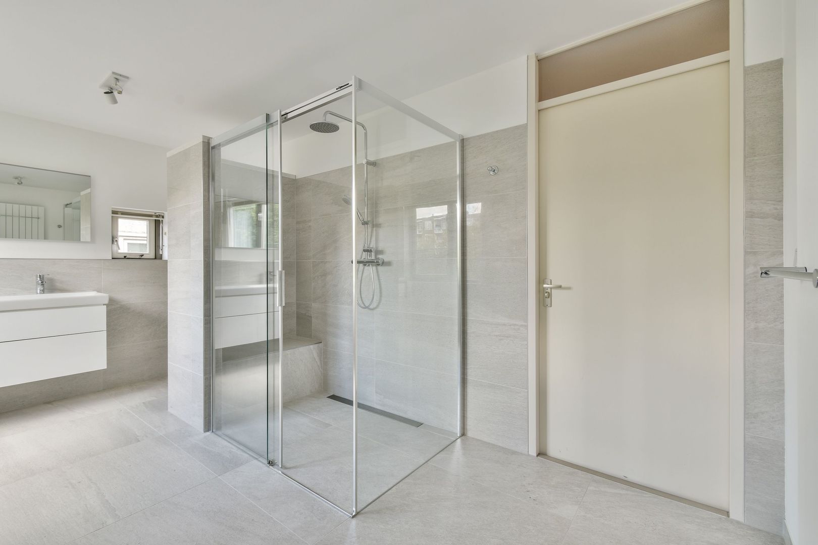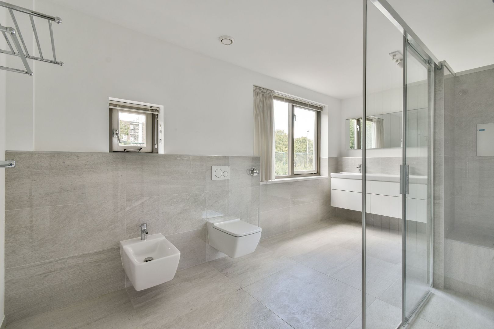 De moderne badkamer uit ca. 2019 is enorm, maar liefst ca. 13 m2. De badkamer met elektrische vloerverwarming is grotendeels betegeld en uitgevoerd met een brede inloopdouche met glazen schuifdeur, dubbel wastafelmeubel, toilet en bidet.