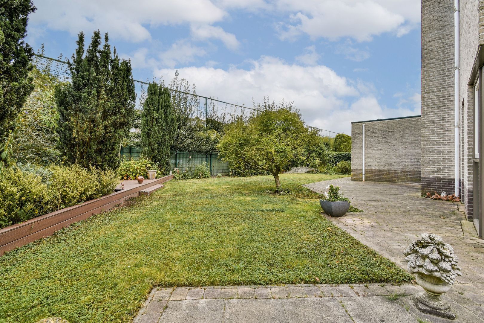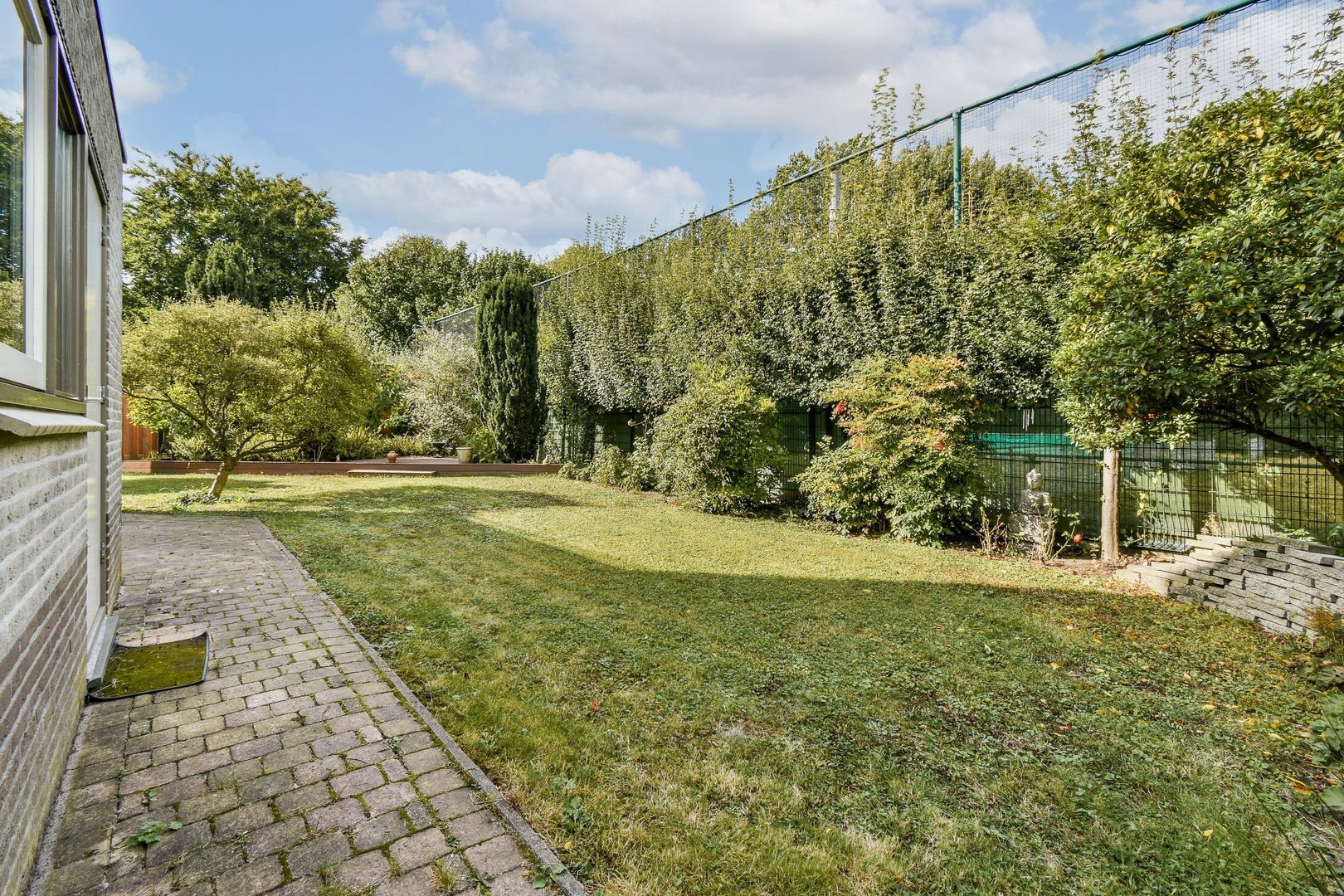 De tuin ligt rondom de woning, aan voorzijde afgeschermd door een stalen hekwerk. Er kunnen twee auto's op eigen terrein geparkeerd worden. De tuin bestaat verder uit verschillende keurig aangelegde groenborders, gras, bestrating en een bankirai vlonderterras. Zowel aan voor- als achterzijde zijn een buitenkraan aanwezig.