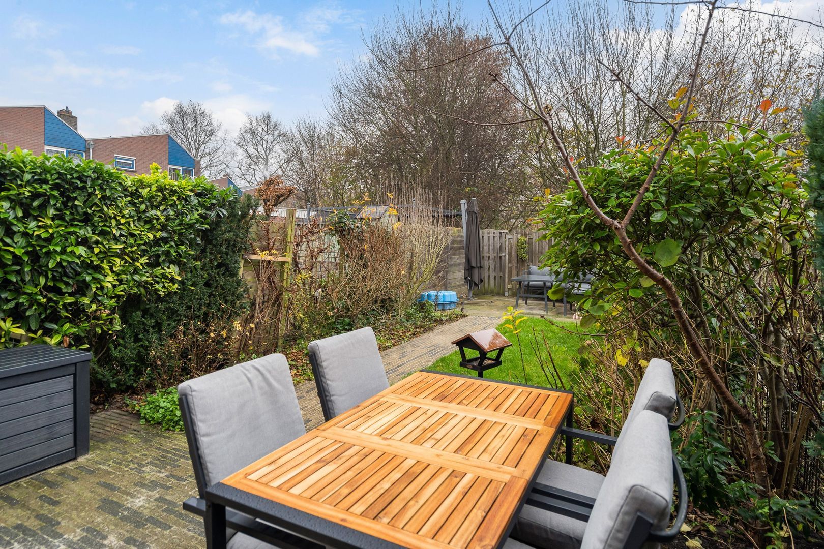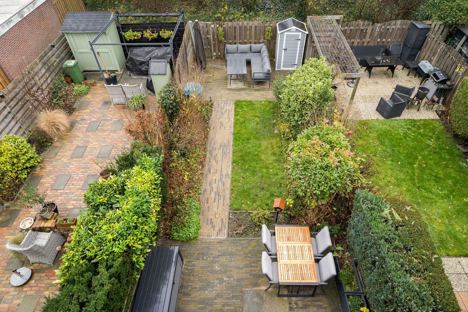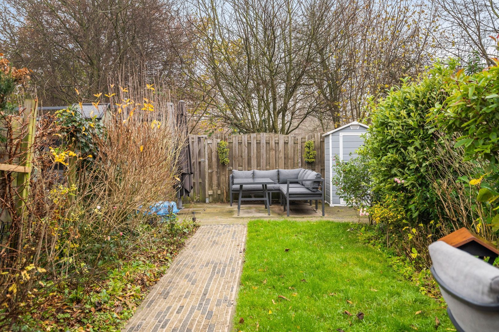 Vanuit de woonkamer is de achtertuin toegankelijk. De tuin heeft een terras direct aan de woning alsmede een terras aan de achterzijde. Tussen de twee terrassen in is een mooie siertuin aangebracht met veel groen.