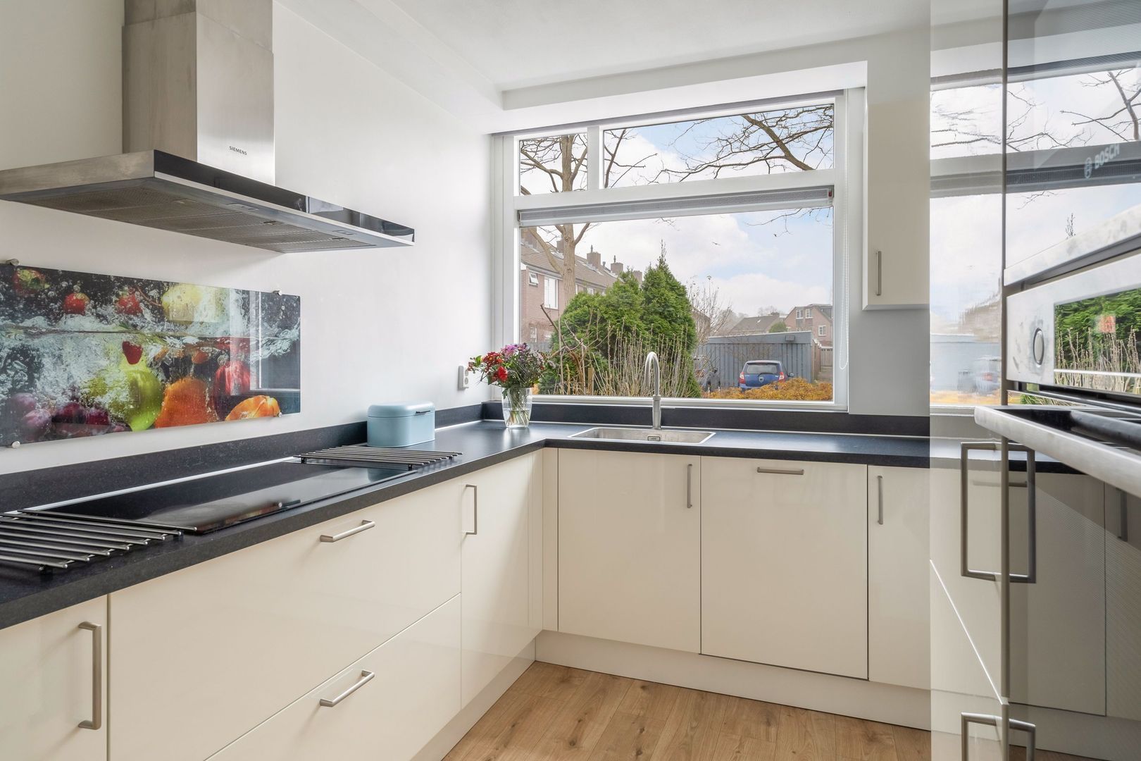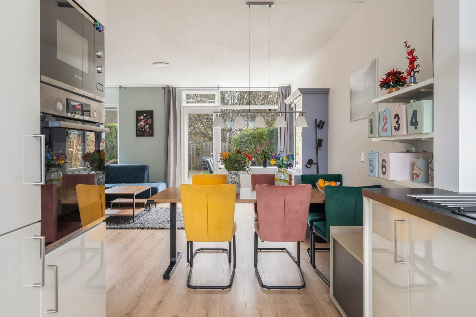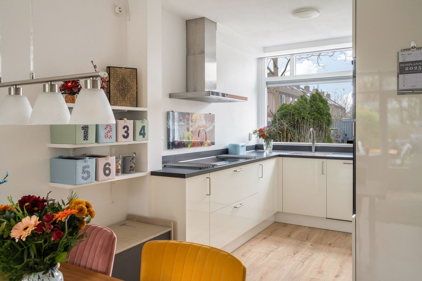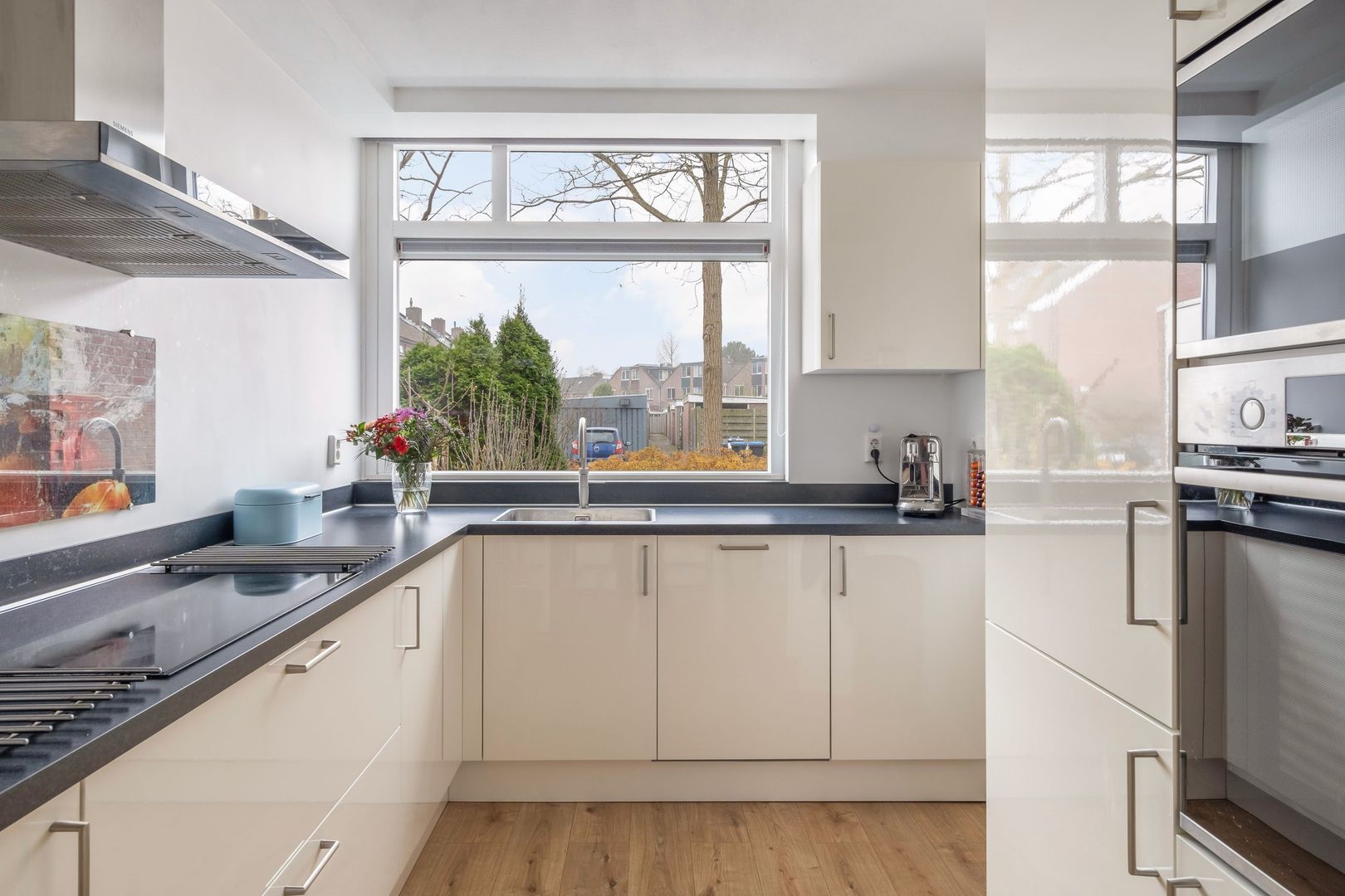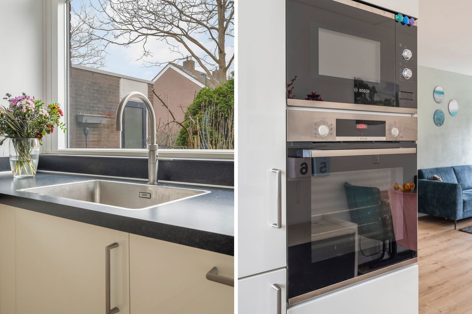 De ruime keuken aan de voorzijde is in 2020 geplaatst. Het keukenblok staat in een hoek opstelling met losse hoge kasten en de navolgende inbouwapparatuur; vaatwasser, inductiekookplaat, afzuigkap, koel-/vriescombi, combi Quooker, oven en magnetron.