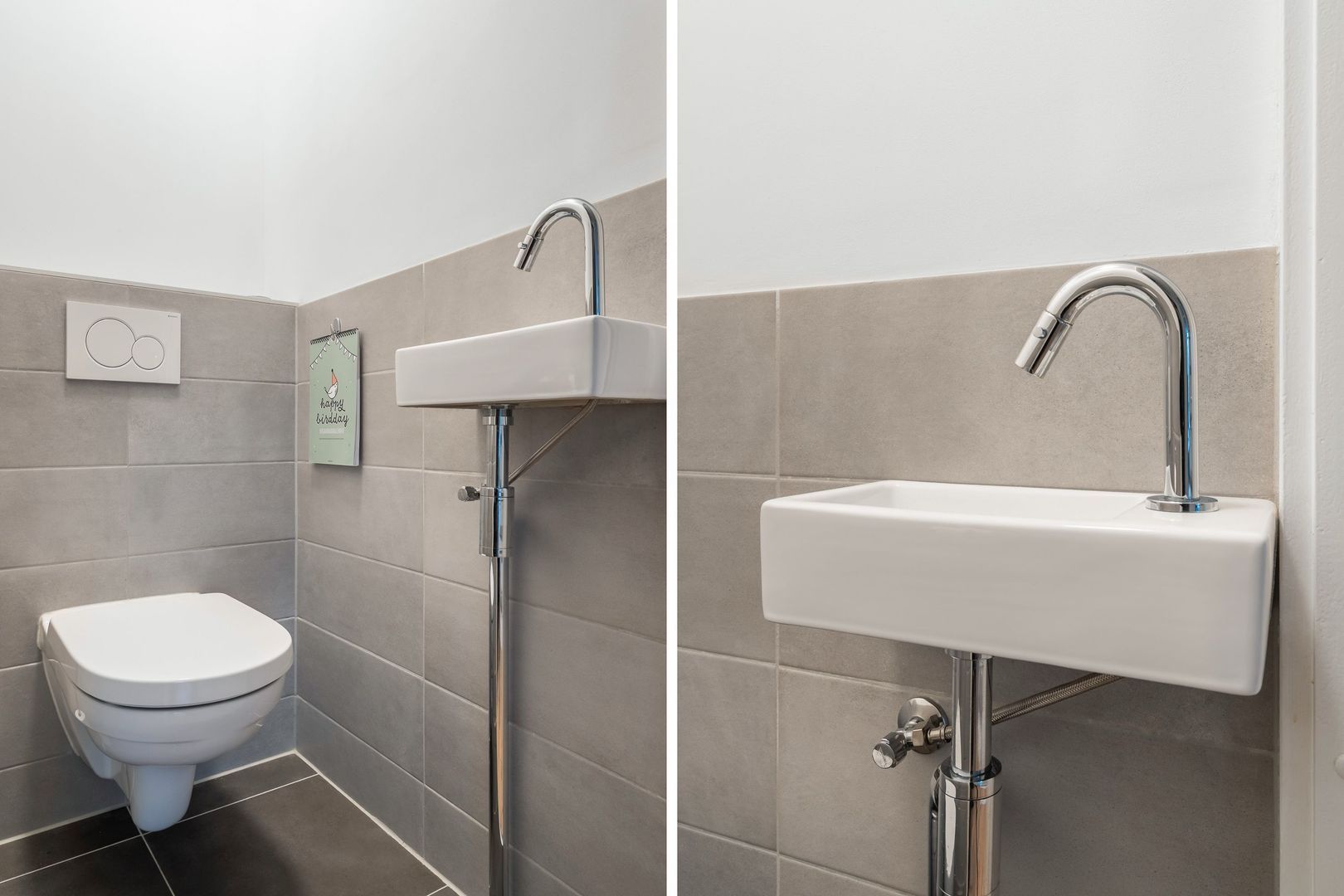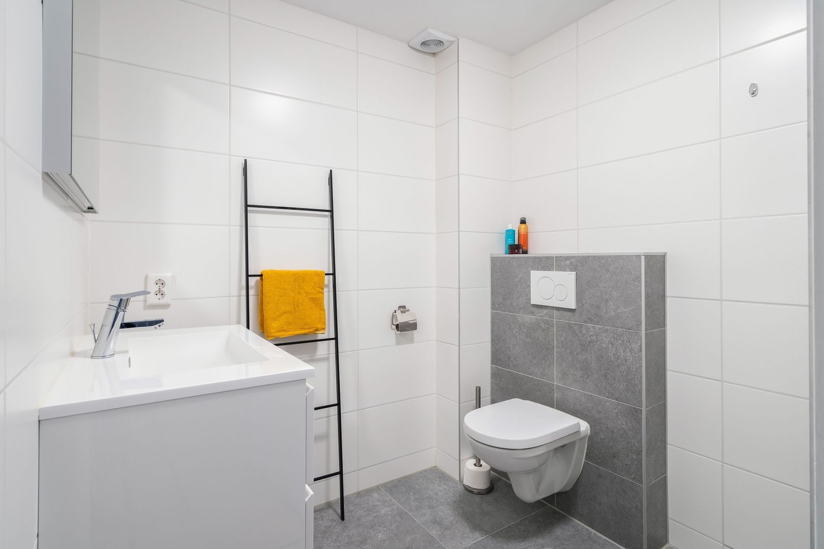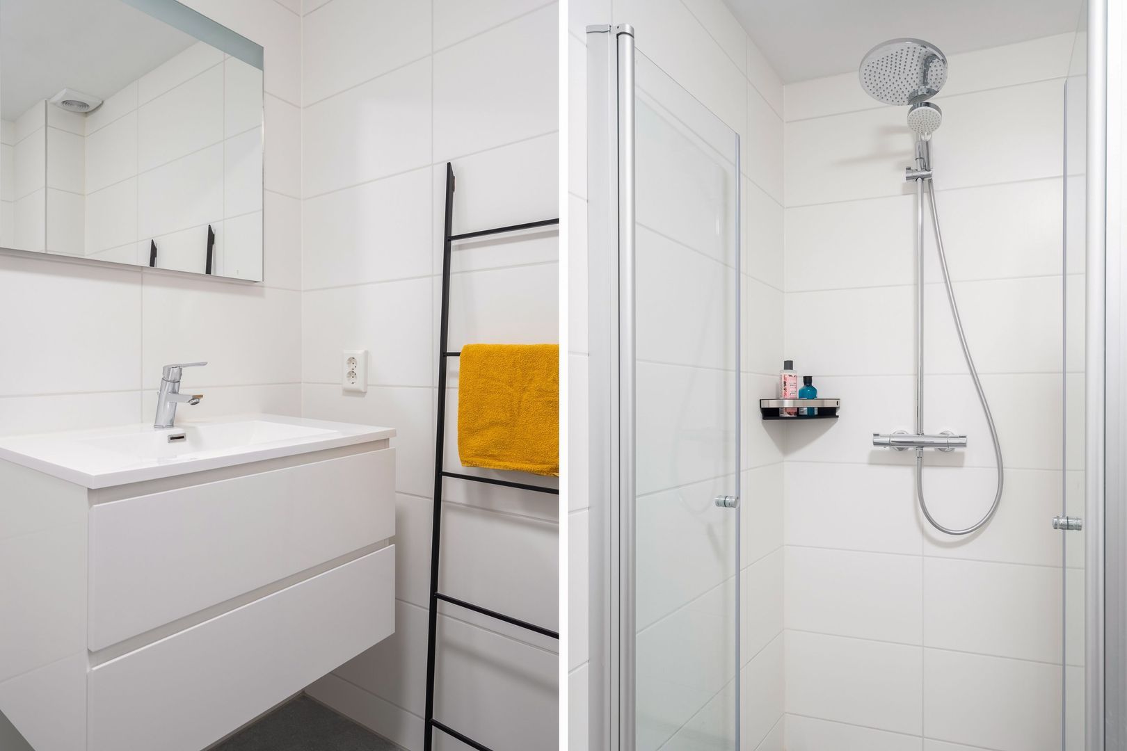Inpandige badkamer welke volledig betegeld is met gemêleerd witte tegels en grijs/antraciet tegels. Er is een zwevend toilet, wastafel in luxe meubel en een inloopdouche met regendouche, thermostaatkraan en glazen spatscherm.