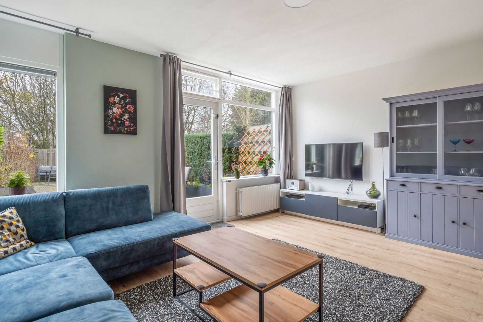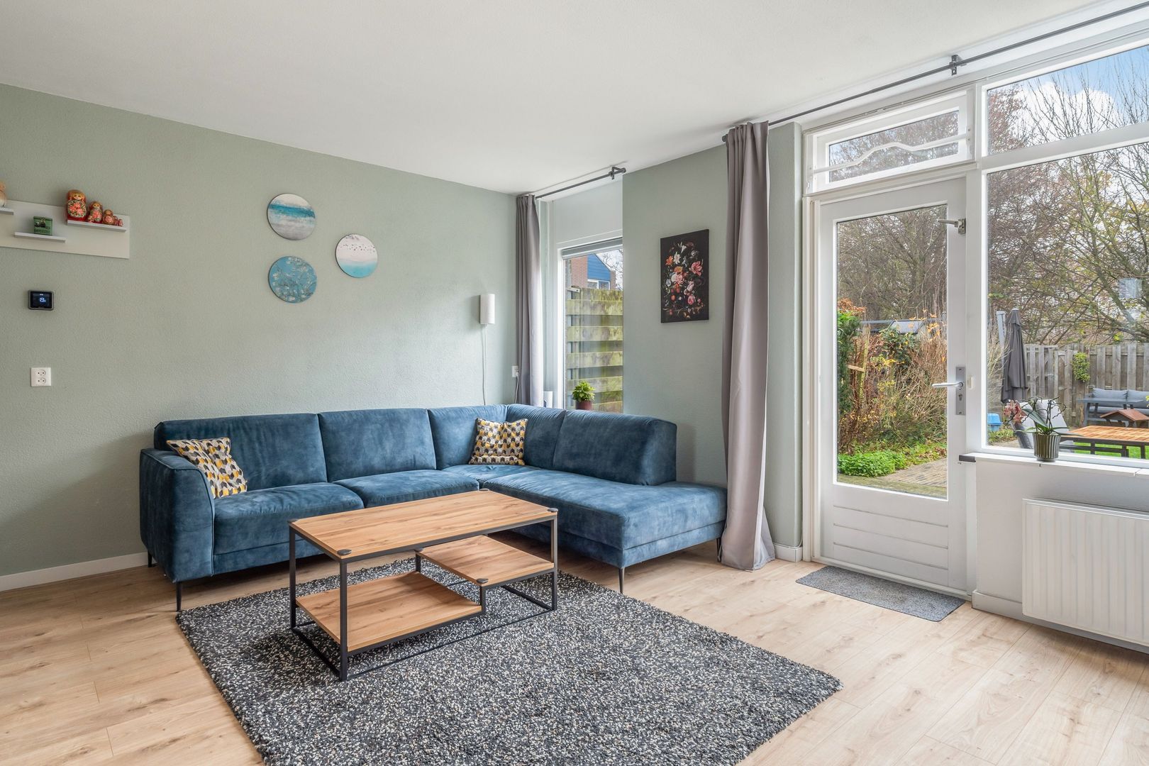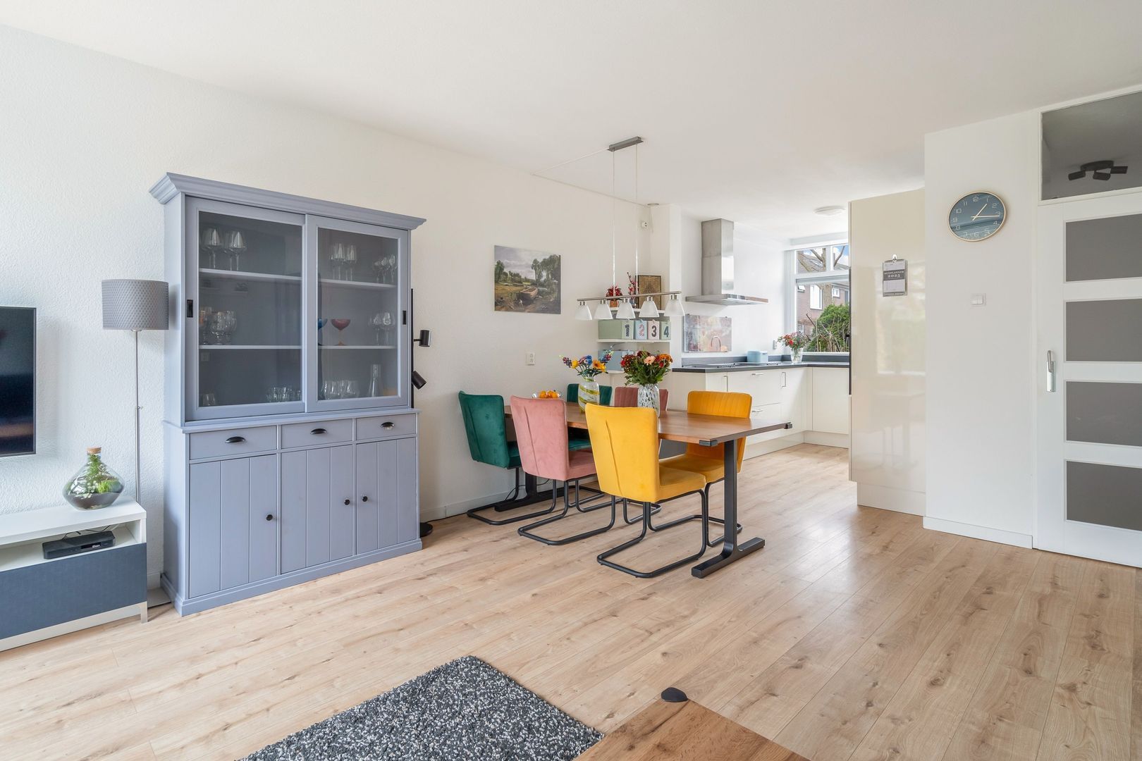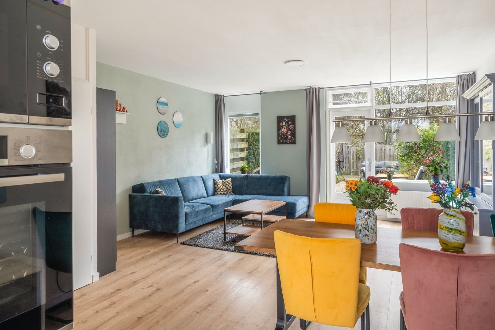 Ruime, tuingerichte woonkamer met open keuken van totaal ca. 37 m2. De woonkamer is voorzien van een fraaie houtlook laminaatvloer, provisietrapkast, gespachtelde wanden en gestuukt plafond.