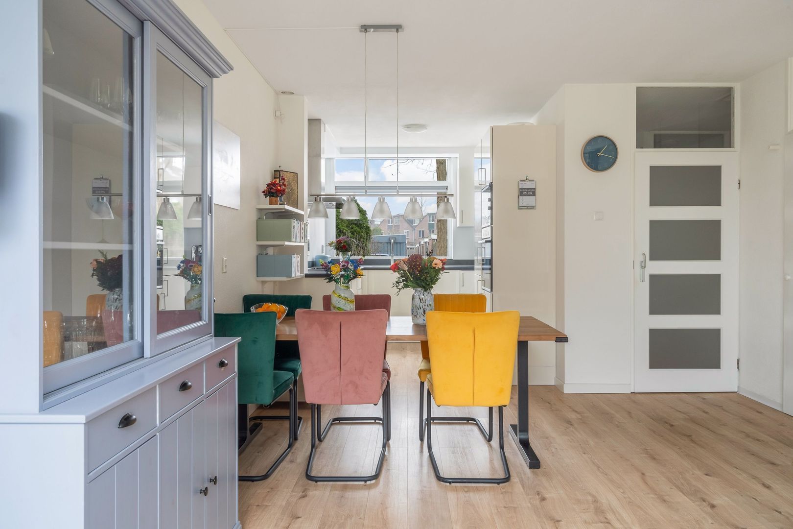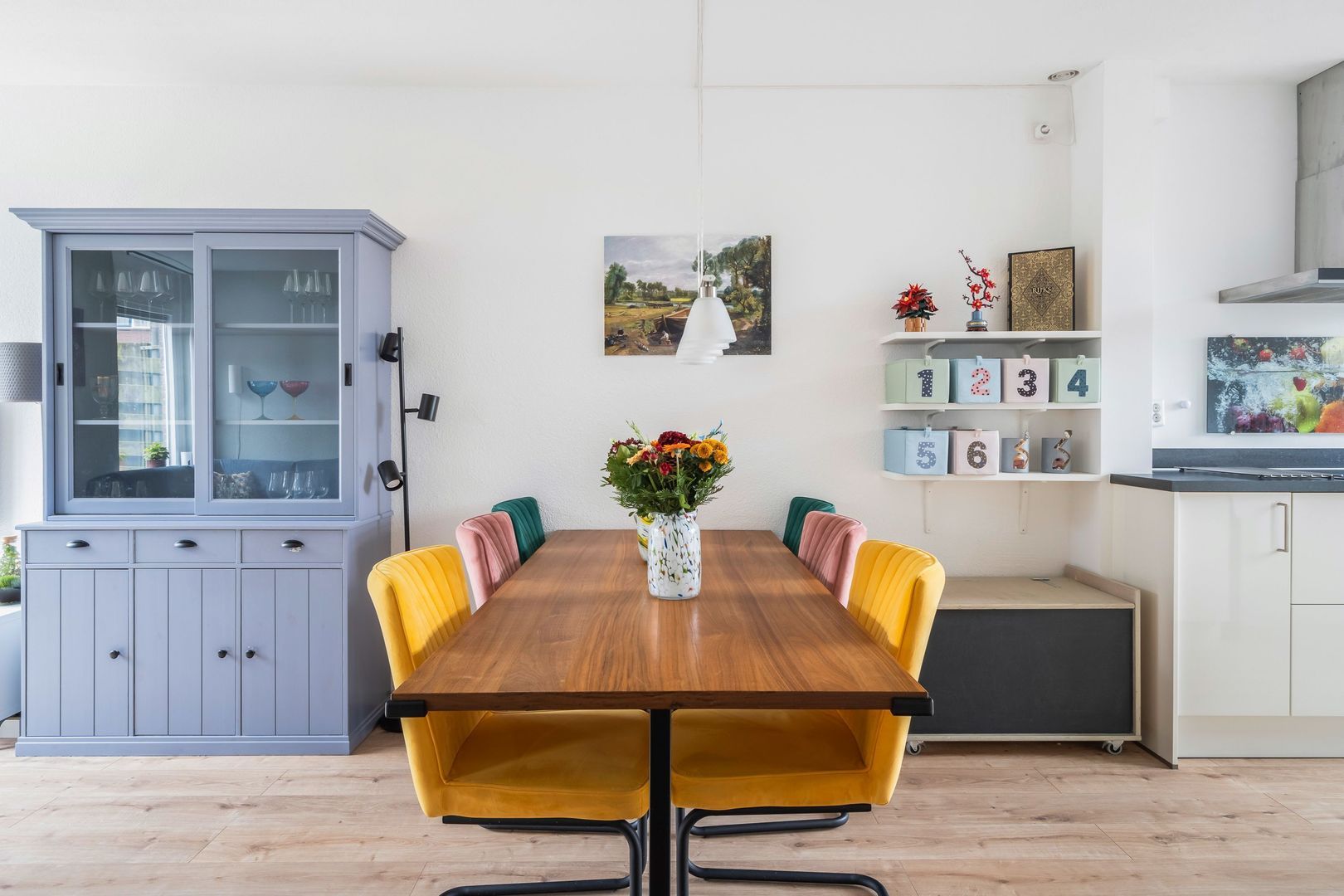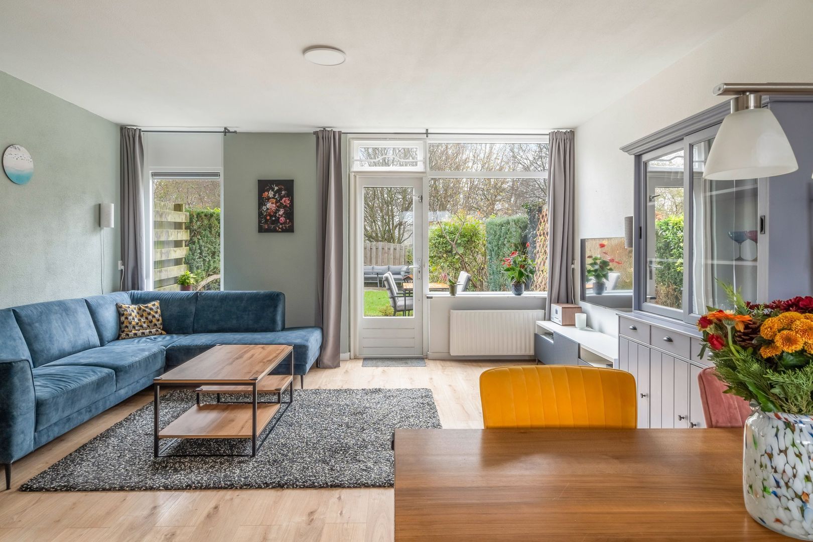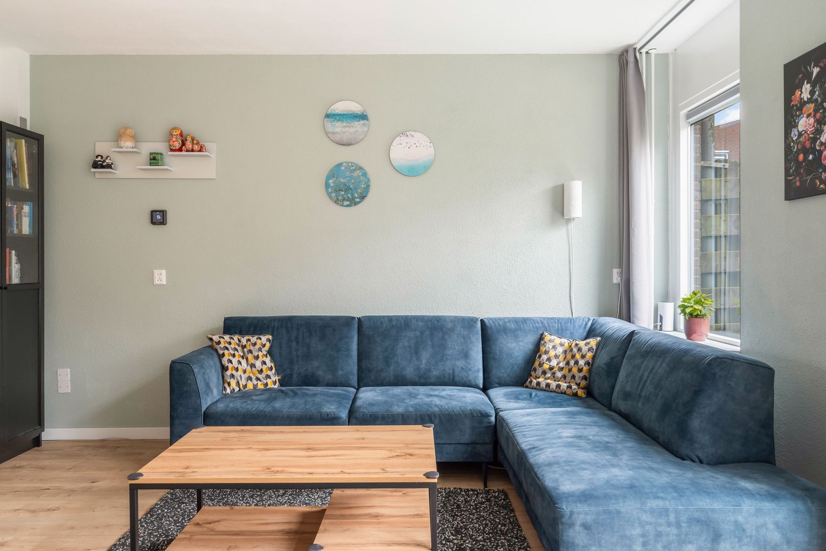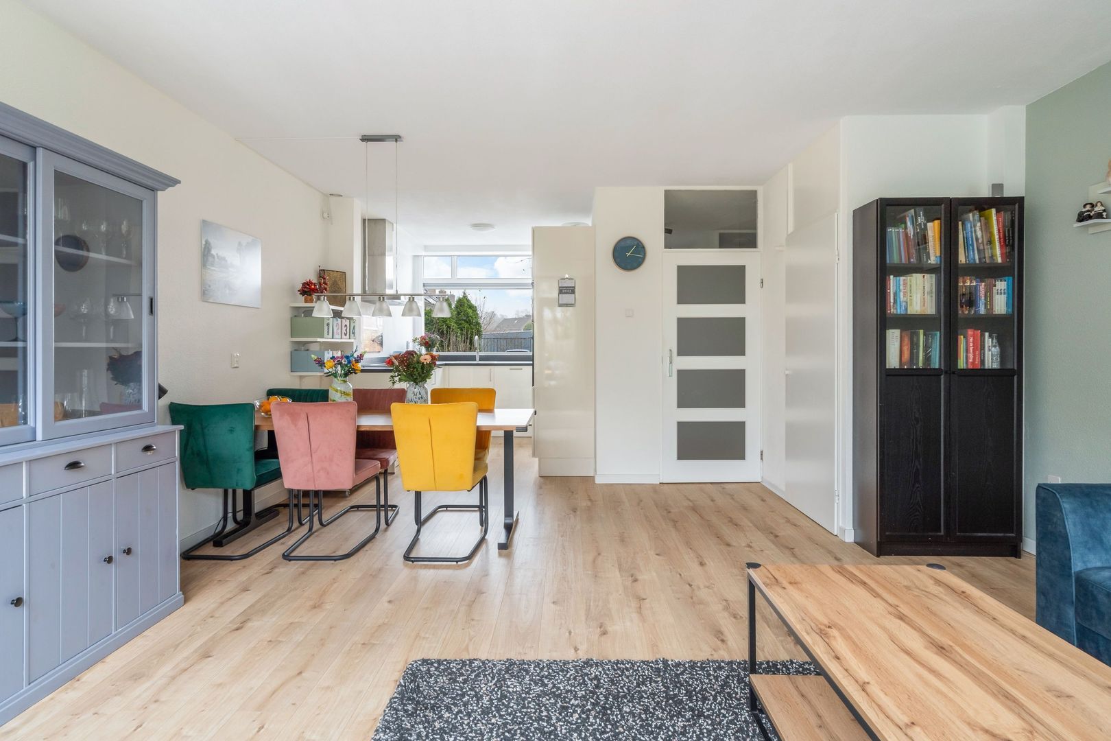 Ruime, tuingerichte woonkamer met open keuken van totaal ca. 37 m2. De woonkamer is voorzien van een fraaie houtlook laminaatvloer, provisietrapkast, gespachtelde wanden en gestuukt plafond.