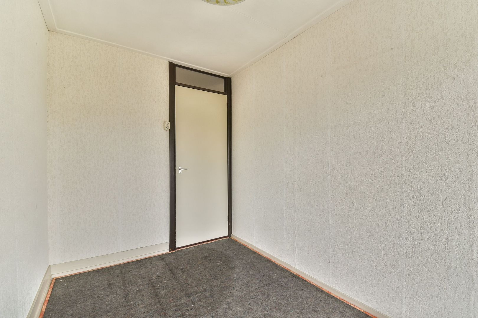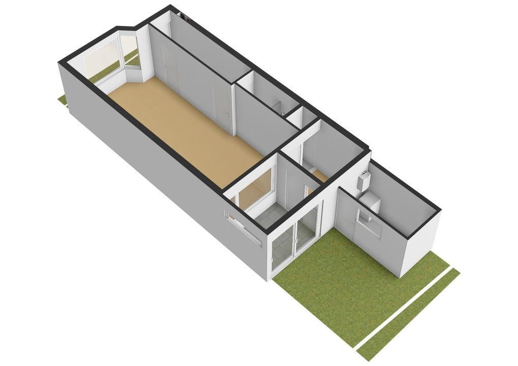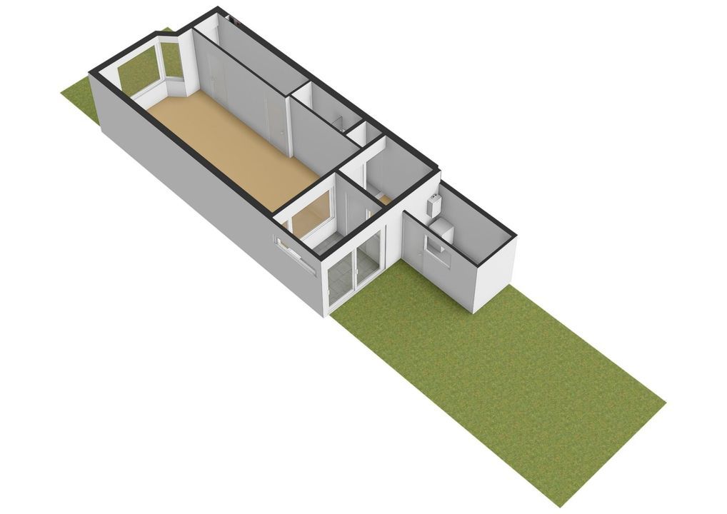 Keuken van ca. 5 m2 in de uitbouw met vaste kast en deur naar serre van ca 6 m2, vanuit de serre via schuifpui toegang tot de achtertuin. Portaal met trapkast en toegang naar eenvoudige toiletruimte/badkamer, met elektrische kachel, wastafel en douche.
