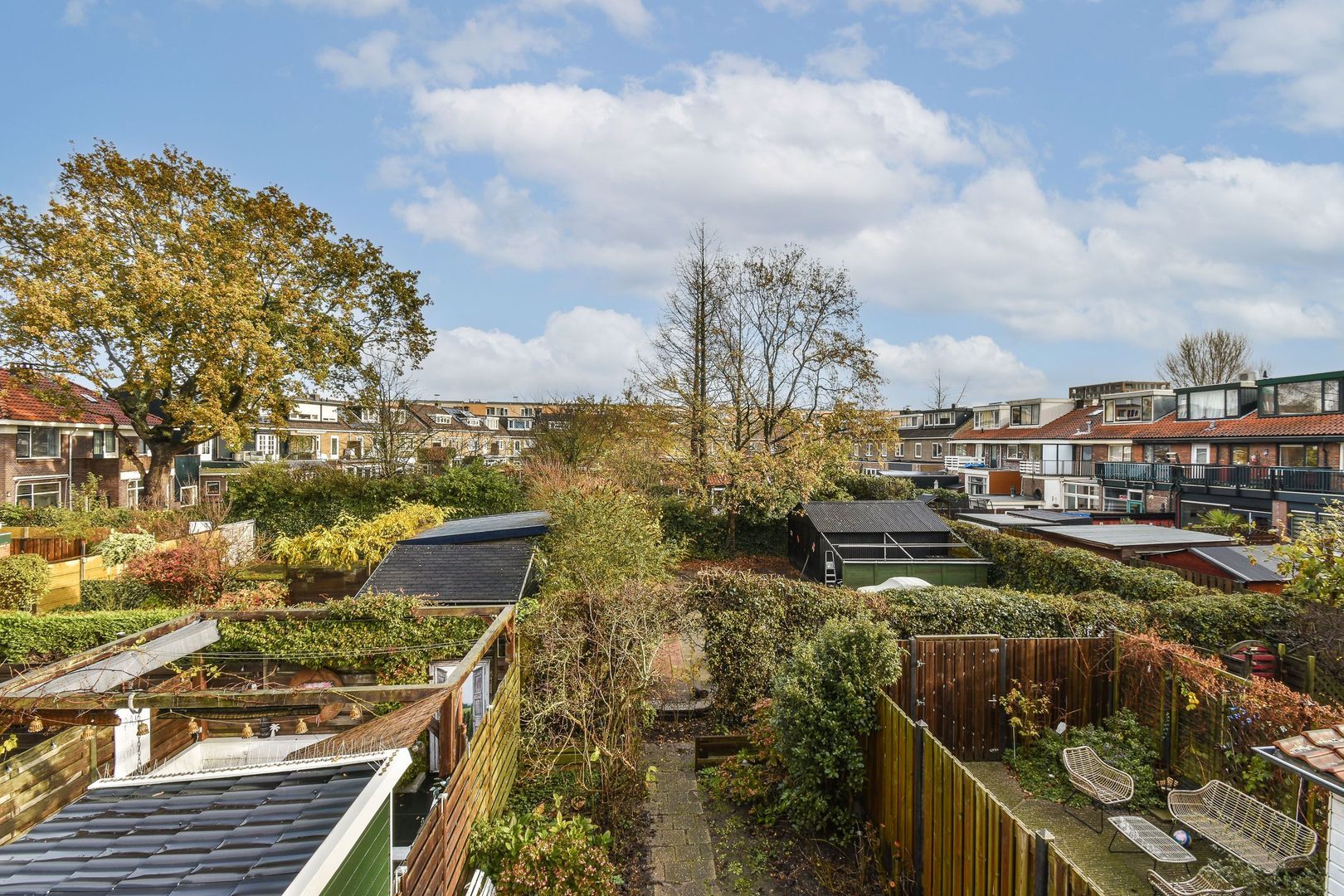 Achtertuin van ruim 9 meter diep op het oosten, waar je ’s ochtends en ’s middags heerlijk in de zon zit. Uitzicht achter op een groene heg, er is een achterom en er zijn geen achterburen.