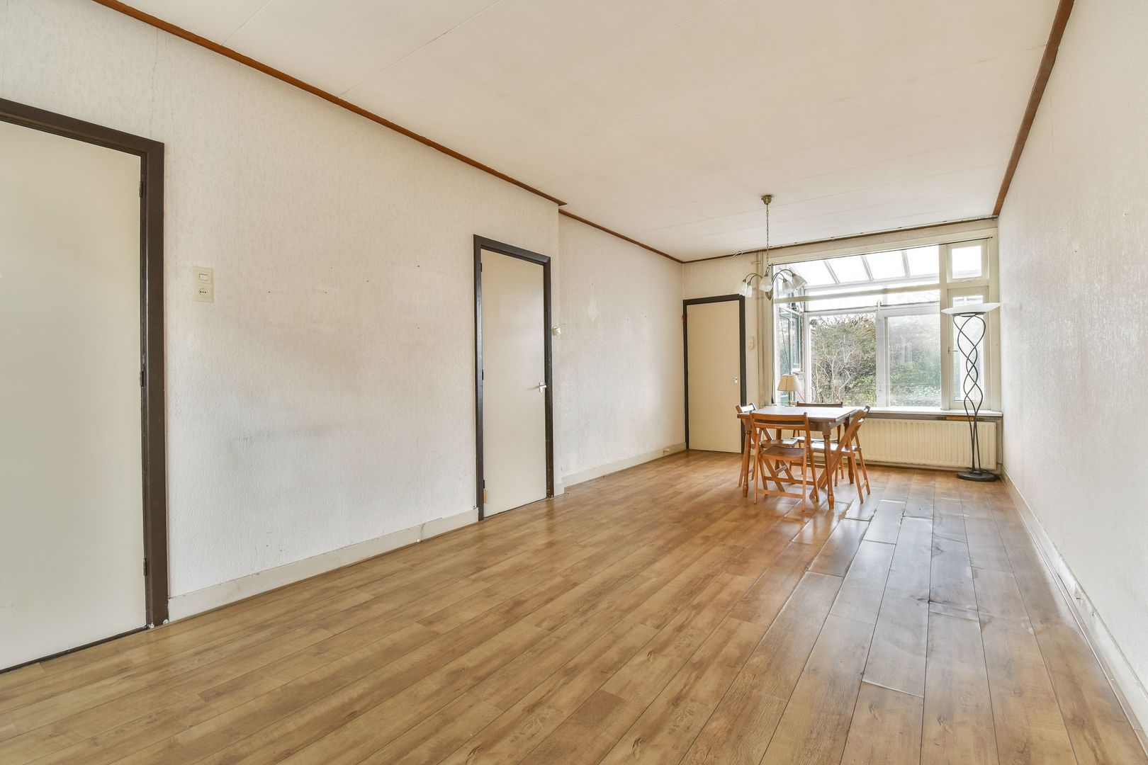 Woonkamer van bijna 30 m2 met laminaatvloer en gipsplaten plafond, aan de voorkant een erker en aan de achterzijde van de woning een verhoogd terras met serre. Toegang tot keuken.