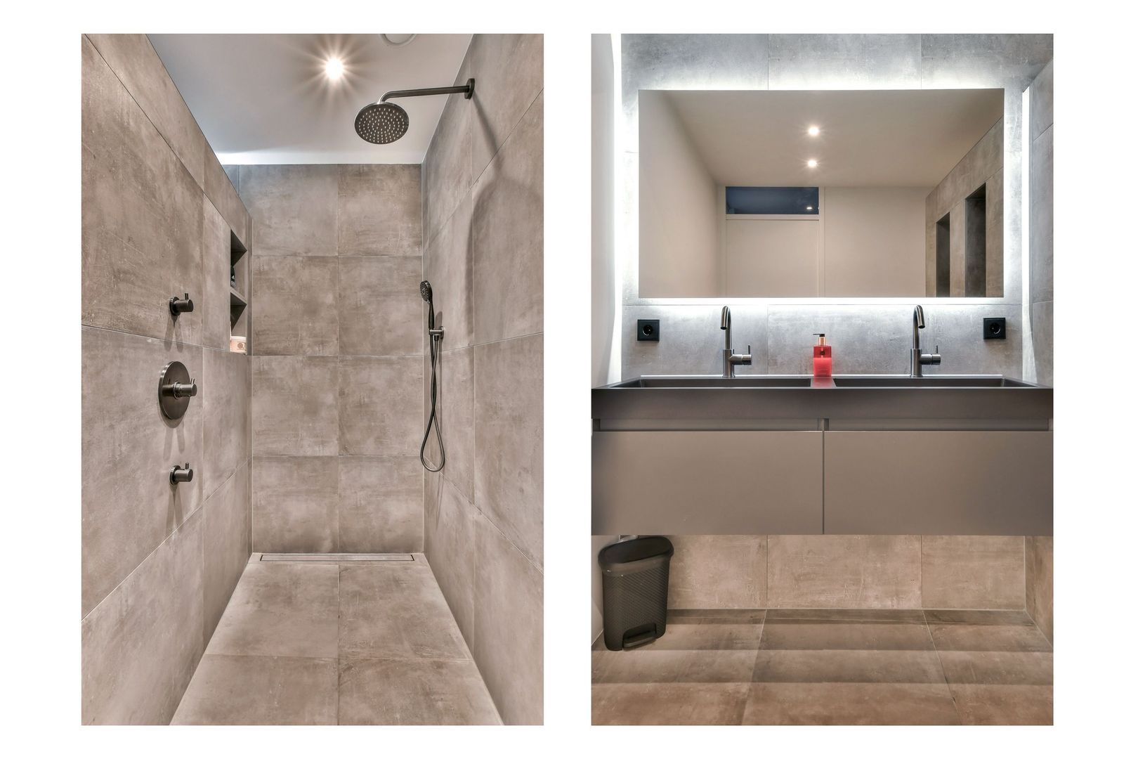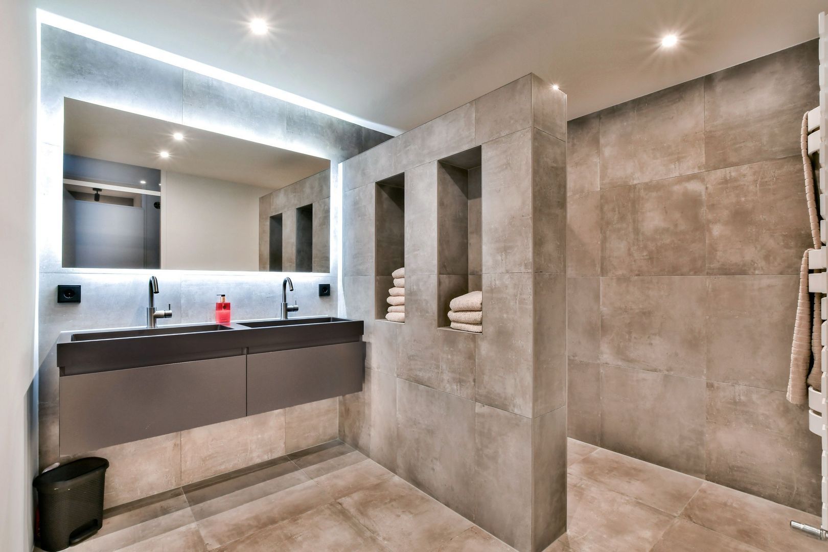 Het dubbele wastafelmeubel heeft twee laden en de grote spiegel is voorzien van verlichting en spiegelverwarming. Ook een designradiator is aanwezig.