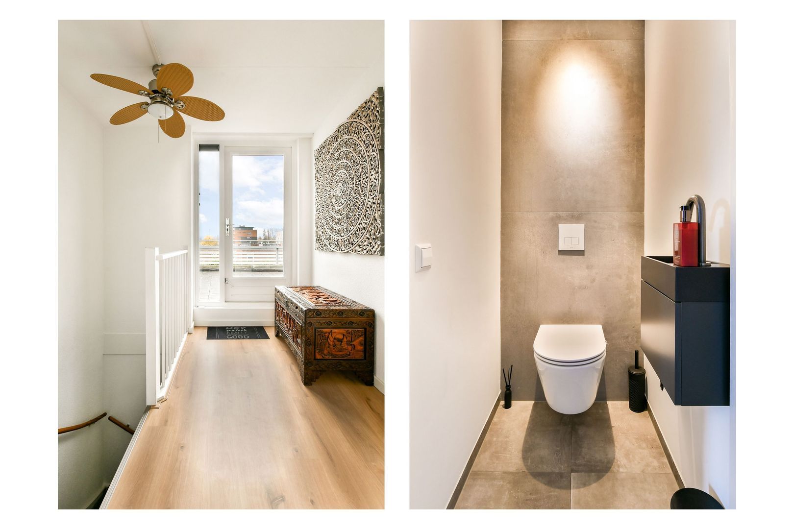 Hal met garderobe, meterkast en trapkast. Modern hangend toilet waarbij de vloer en achterwand betegeld zijn. Het toilet is uitgevoerd met een fonteintje met onderkastje. Een brede schuifdeur geeft toegang tot de uitgebouwde woonkamer met open keuken. De woonkamer ligt aan tuinzijde en heeft opslaande deuren naar de achtertuin. Aan de gevel hangt een elektrisch zonnescherm uit 2025 en er zijn inbouwspots aangebracht bij de uitbouw.