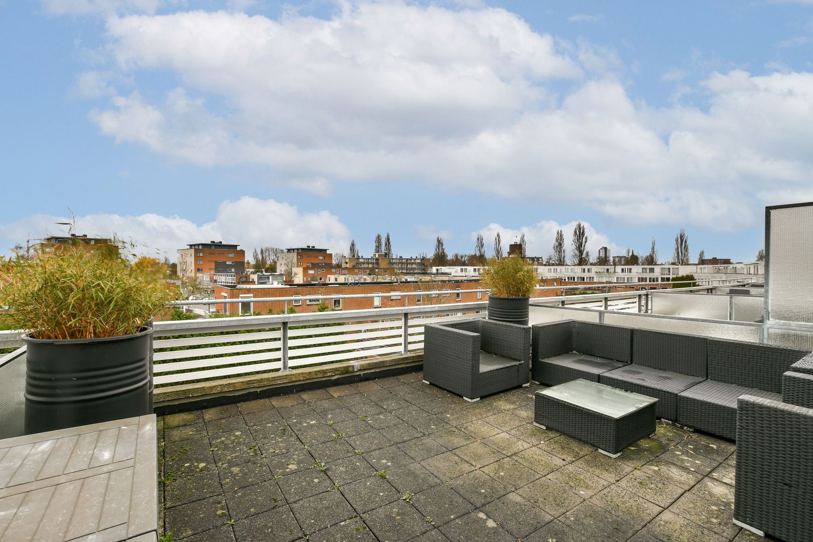 Overloop met toegang tot alle vertrekken en het dakterras. Ruime slaapkamer van meer dan 13 m2 met airconditioning (koelen en verwarmen) en bijzonder schuin weglopend raam. Aan voorzijde is een voorzieningenruimte van ca. 6,5 m2 met schuifkastenwand, wasmachine- en droger aansluiting, CV-combiketel en unit mechanische ventilatie. Het dakterras dat op het zuiden ligt is ca. 25 m2 groot met nieuw kunststof hekwerk. Aan achterzijde zijn op deze verdieping zijn twee elektrische rolluiken aanwezig.