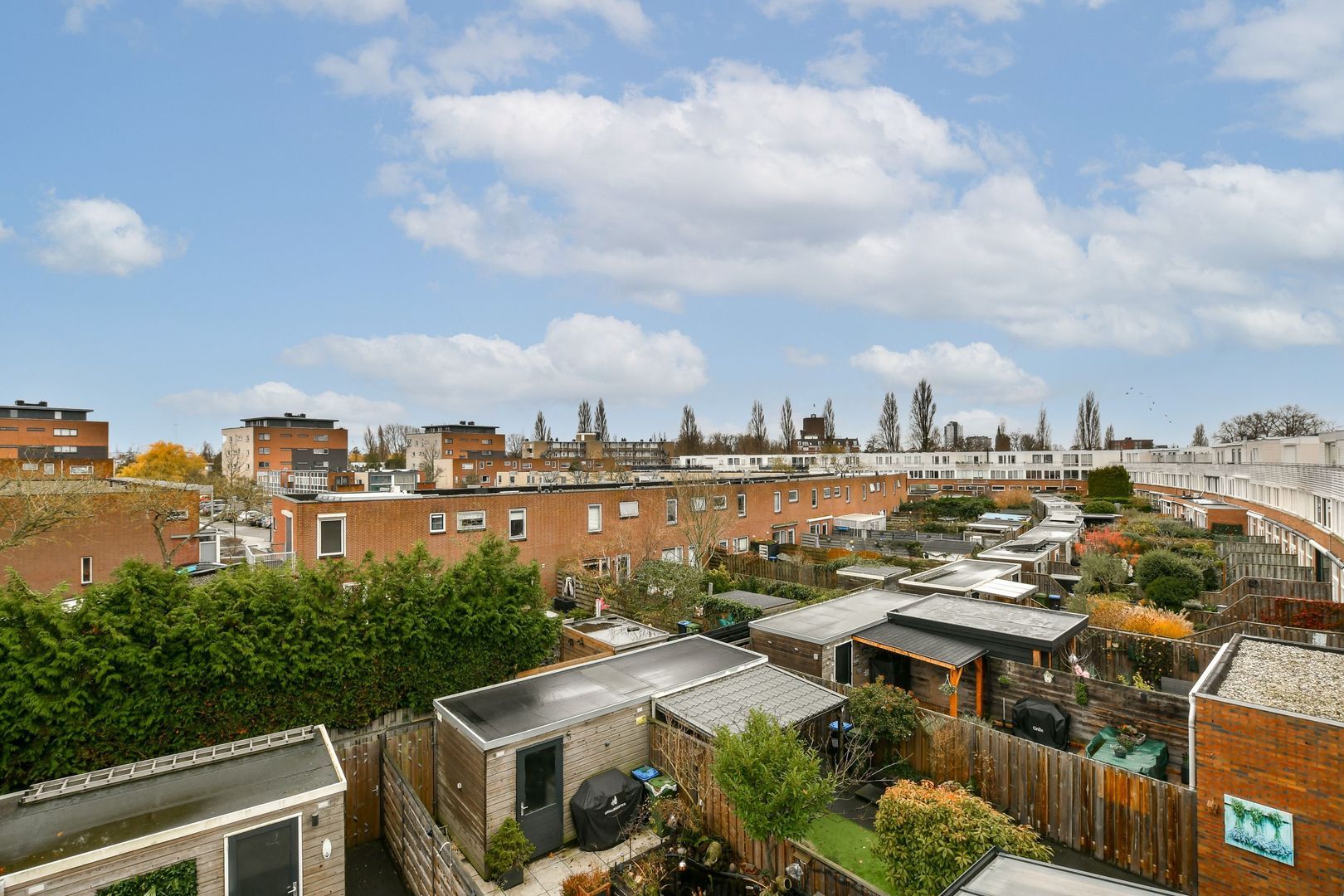 Deze woning heeft naast het dakterras en een kleine voortuin een goed aangelegde achtertuin op het zuiden met een diepte die varieert tussen ca. 8,5 meter en bijna 11 meter. De achtertuin is voorzien van sierbestrating, groenborders, buitenkraan, elektra en een achterom. Achterin de tuin staat de houten berging van ca. 8,5 m2.