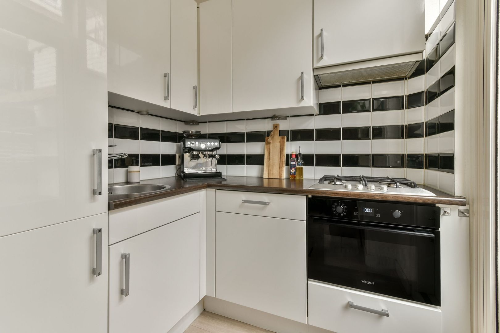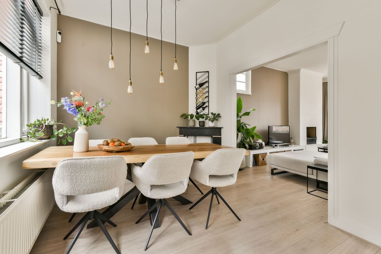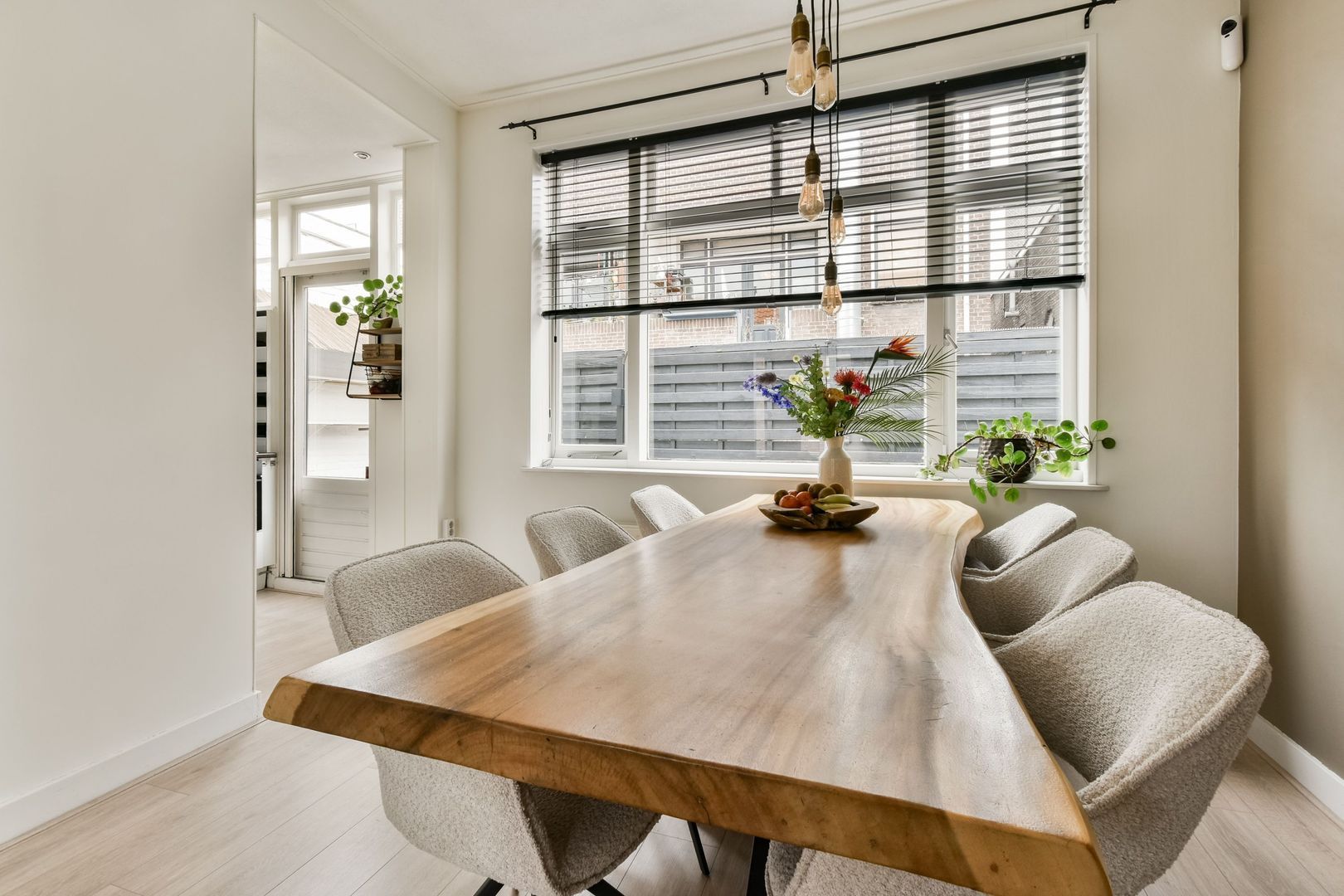 De eetkamer aan achterzijde biedt ruimte voor een grote eetkamertafel en aansluitend aan de eetkamer ligt de half open keuken circa 4 m2 met toegang tot het terras. De keuken is voorzien van een neutraal keukenblok in hoekopstelling 4-pits gaskookplaat met afzuigkap, nieuwe combi-oven, koel-vriescombinatie en vaatwasser. Het zonnige terras ligt op het zuid-westen en is ca. circa 10.5 m2 groot.