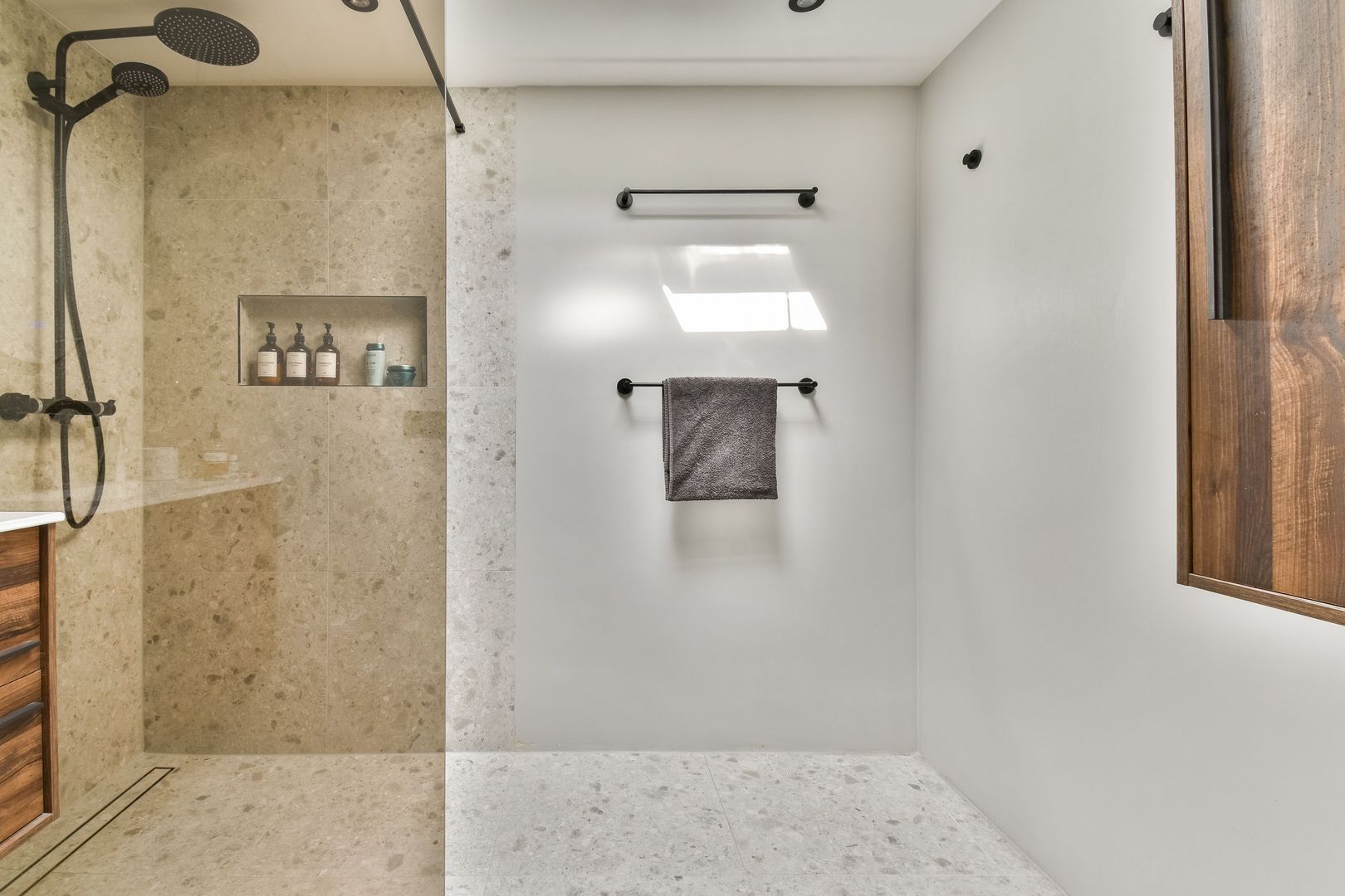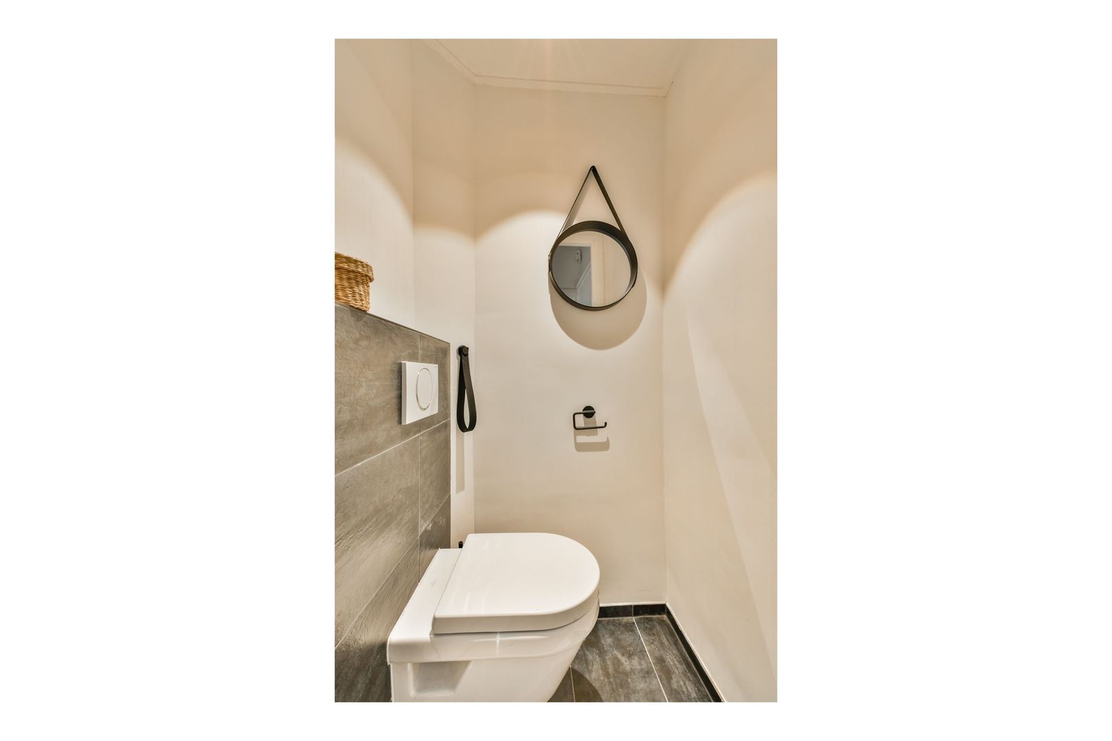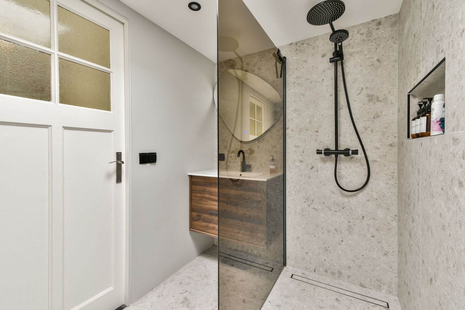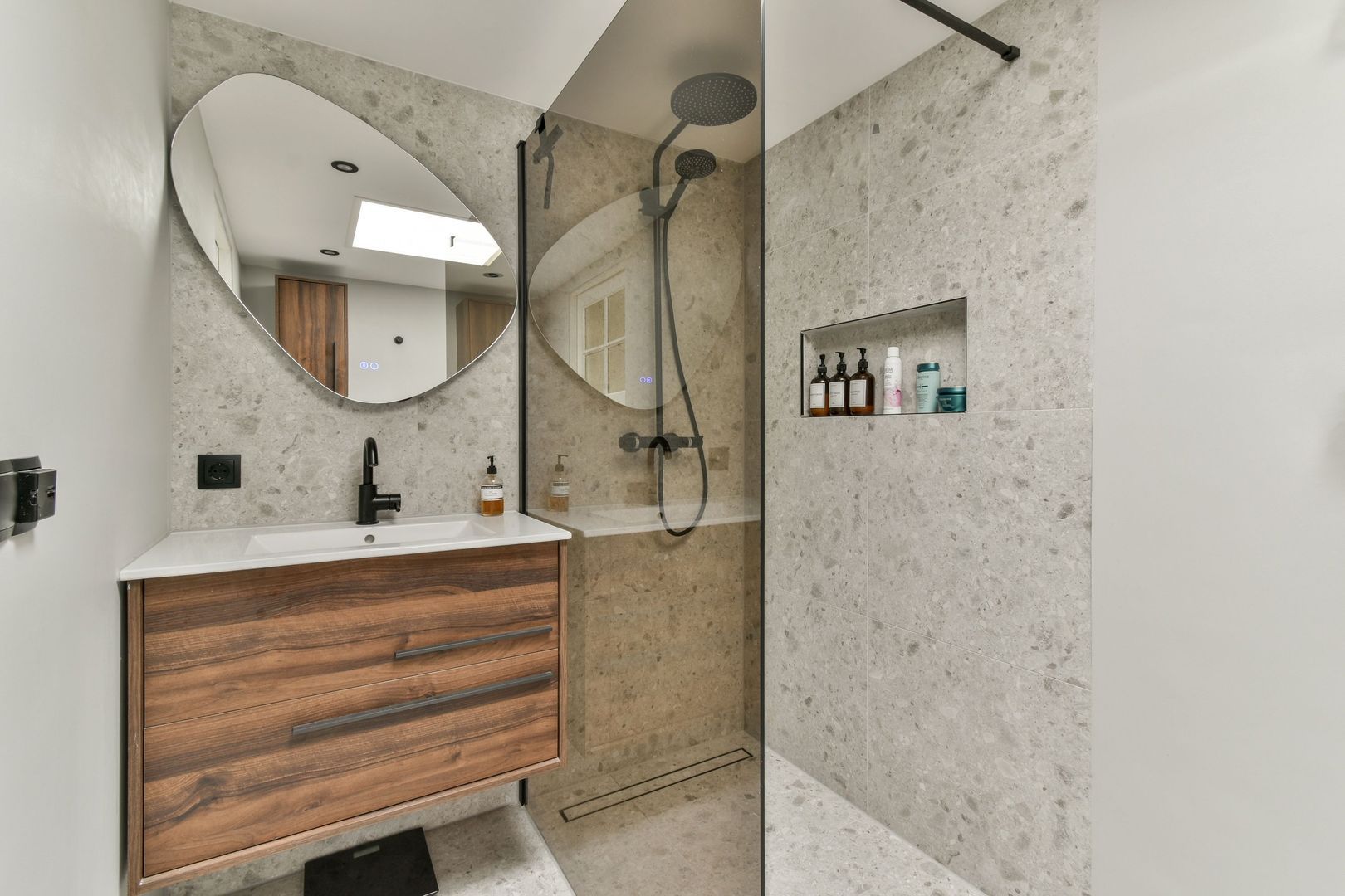 Luxe badkamer uit 2024 van bijna 5 m2. De grotendeels betegelde badkamer is voorzien van een inloopdouche met glazen scherm, regendouche en opberg nis voor douchespullen. Ook is er een modern wastafelmeubel met verwarmde en verlichte spiegel. Er zijn inbouwspots en een lichtkoepel zorgt voor daglicht.