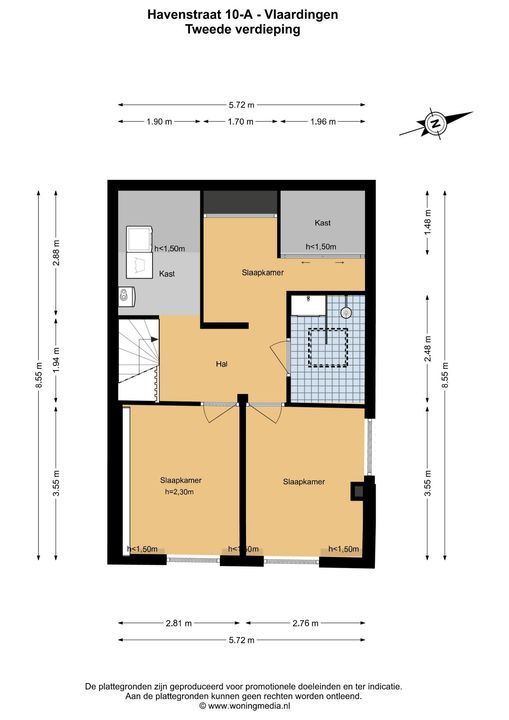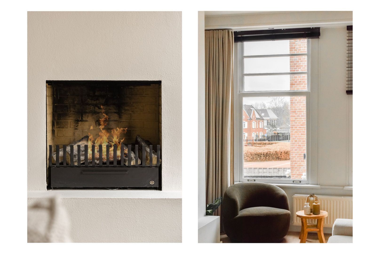 Overloop met trap naar de tweede verdieping. Het toilet is modern en hangend uitgevoerd. De ruimte is gedeeltelijk betegeld. Vanuit de gang is de woonkamer op twee manieren te bereiken. De woonkamer bestaan uit een ruime zitkamer en een aparte eetkamer. De totale ruimte is ongeveer 38 m2. De zitkamer heeft drie hoge ramen een prachtig uitzicht over de Oude Haven richting stadspark ’t Hof. Ook is er een sfeervolle gashaard en zijn er twee ruime en praktische vaste kasten.