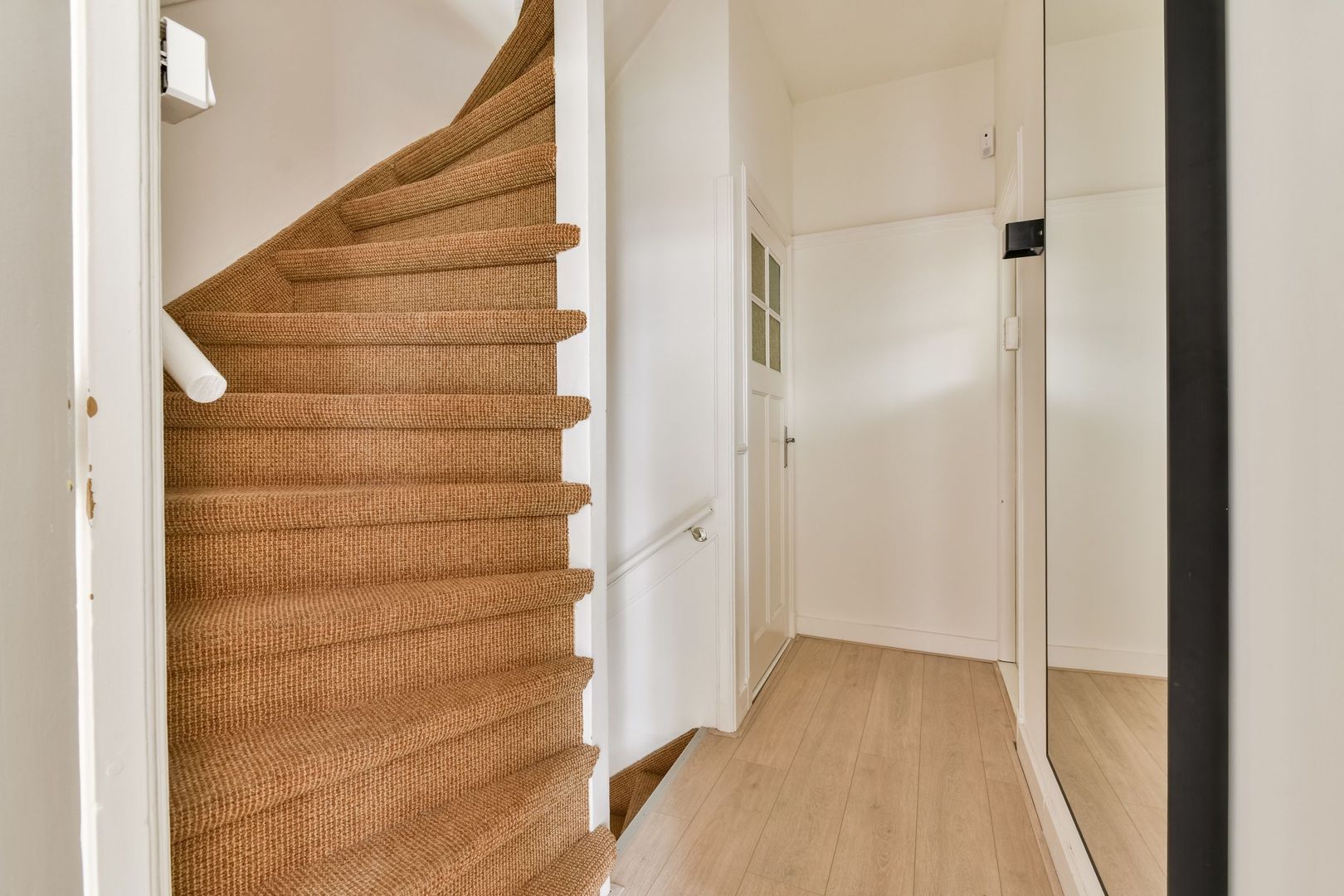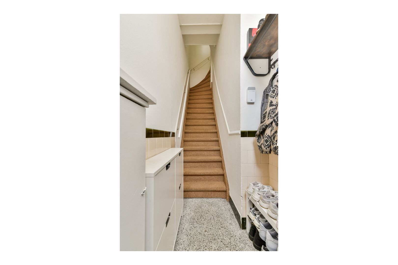 Entree woning, hal met authentieke wandbetegeling en vloer, meterkast en trap naar de eerste verdieping;