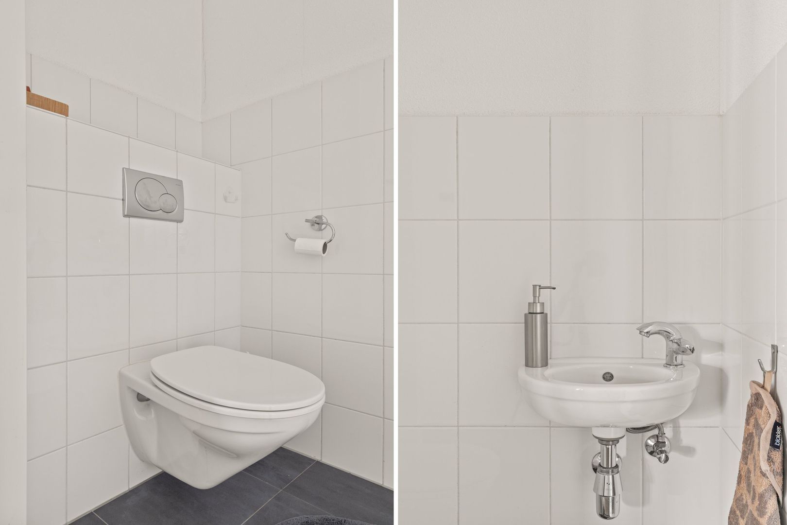 In de gang bevindt zich een modern toilet in wit-antraciet uitvoering, voorzien van een zwevend toilet en fonteintje. Daarnaast is er een inpandige berging van 5 m² met aansluiting voor de wasmachine en opstelling van de CV-ketel.