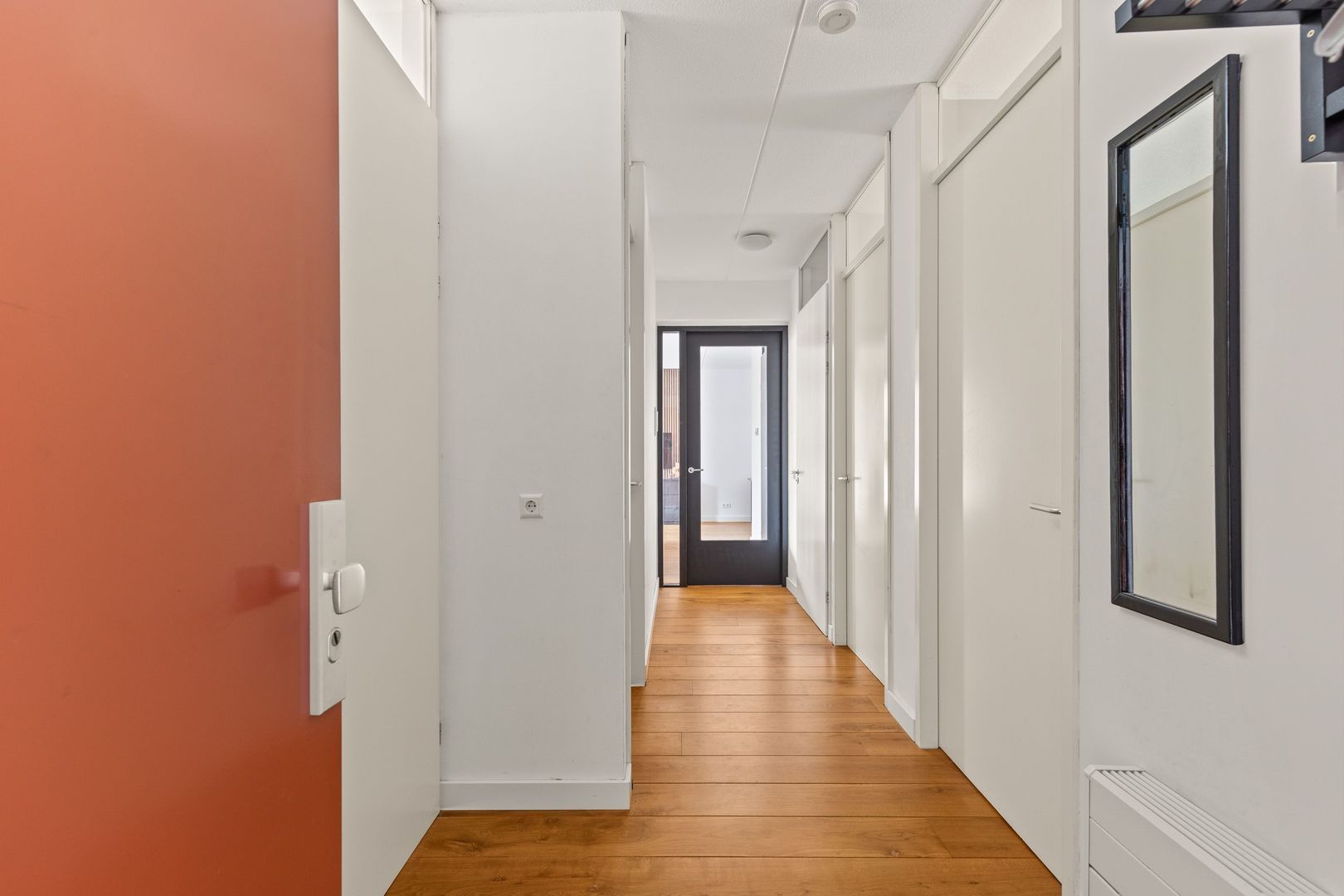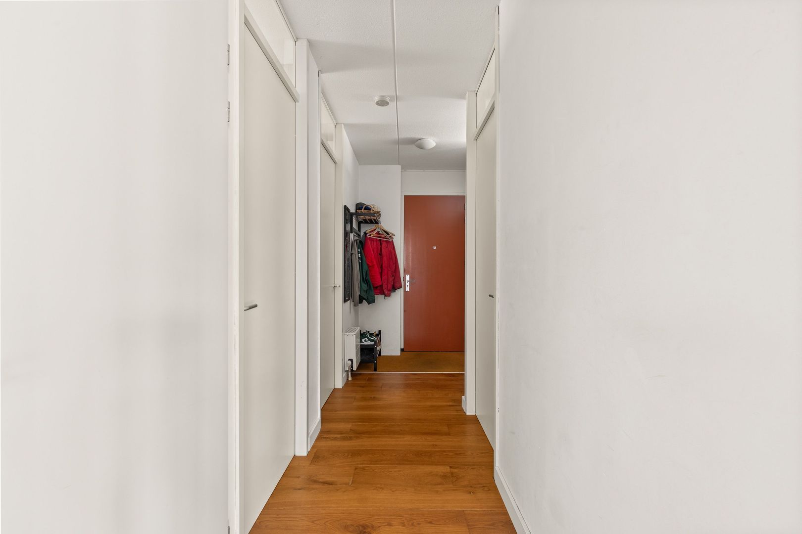 Entree, ruime hal met garderobe en een brede gang naar de woonkamer.