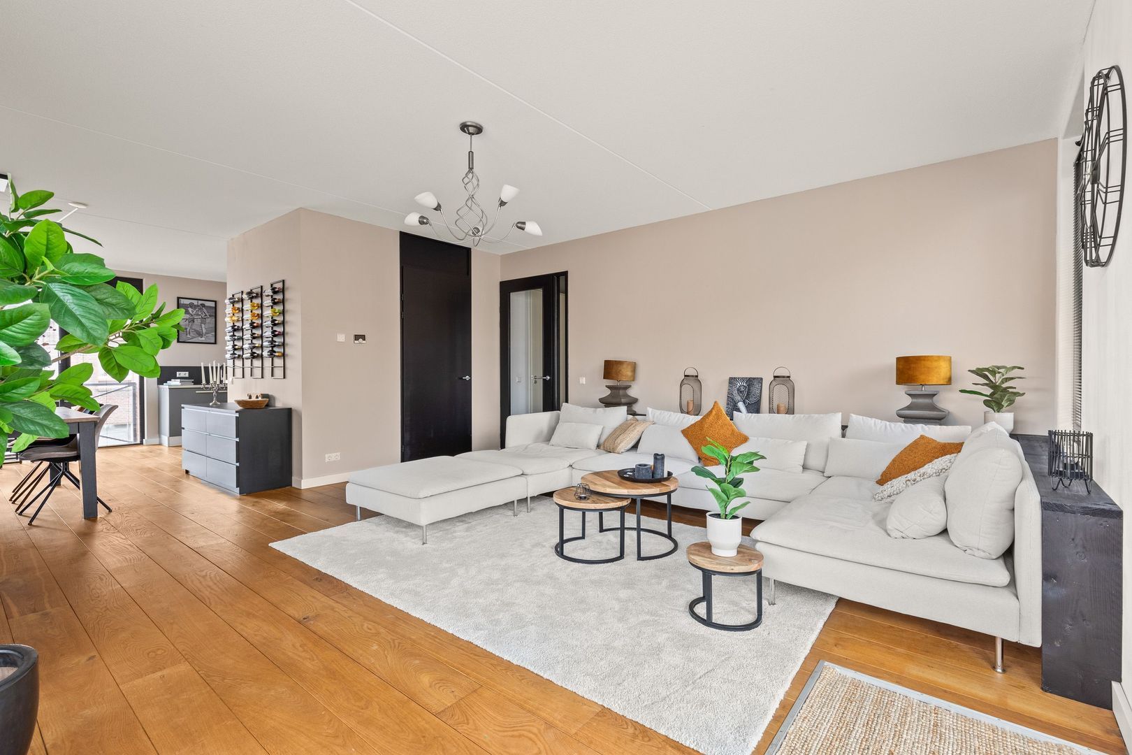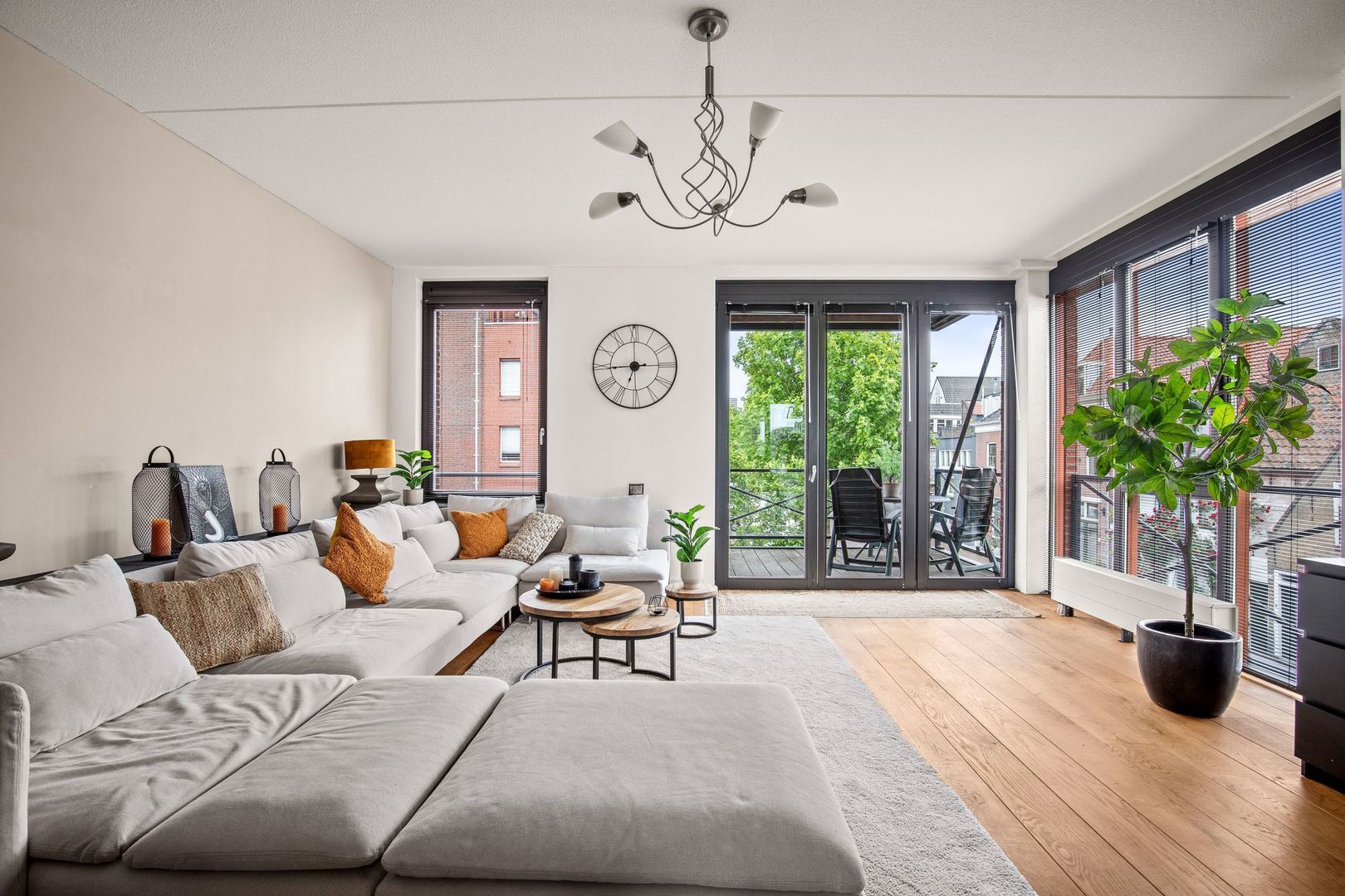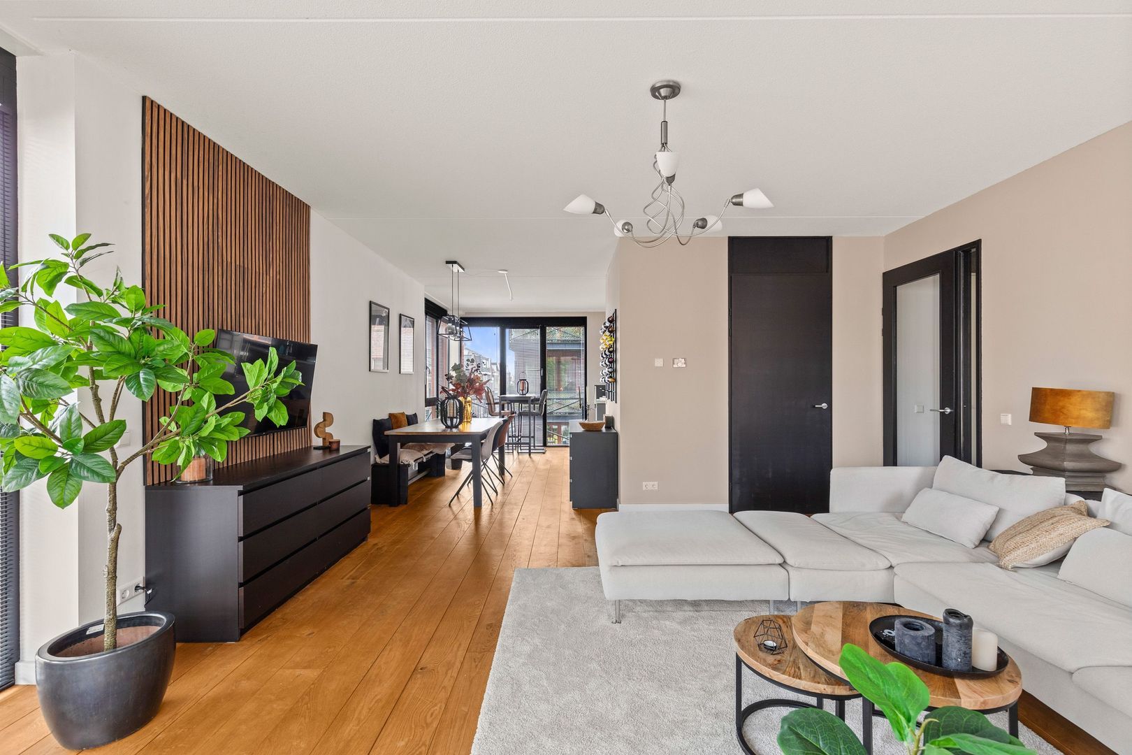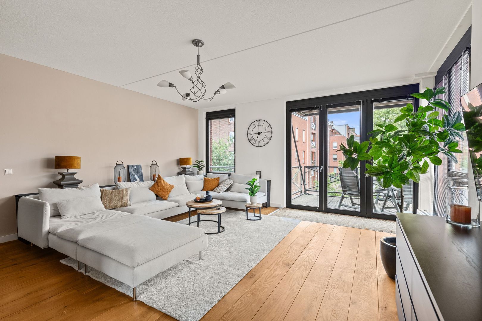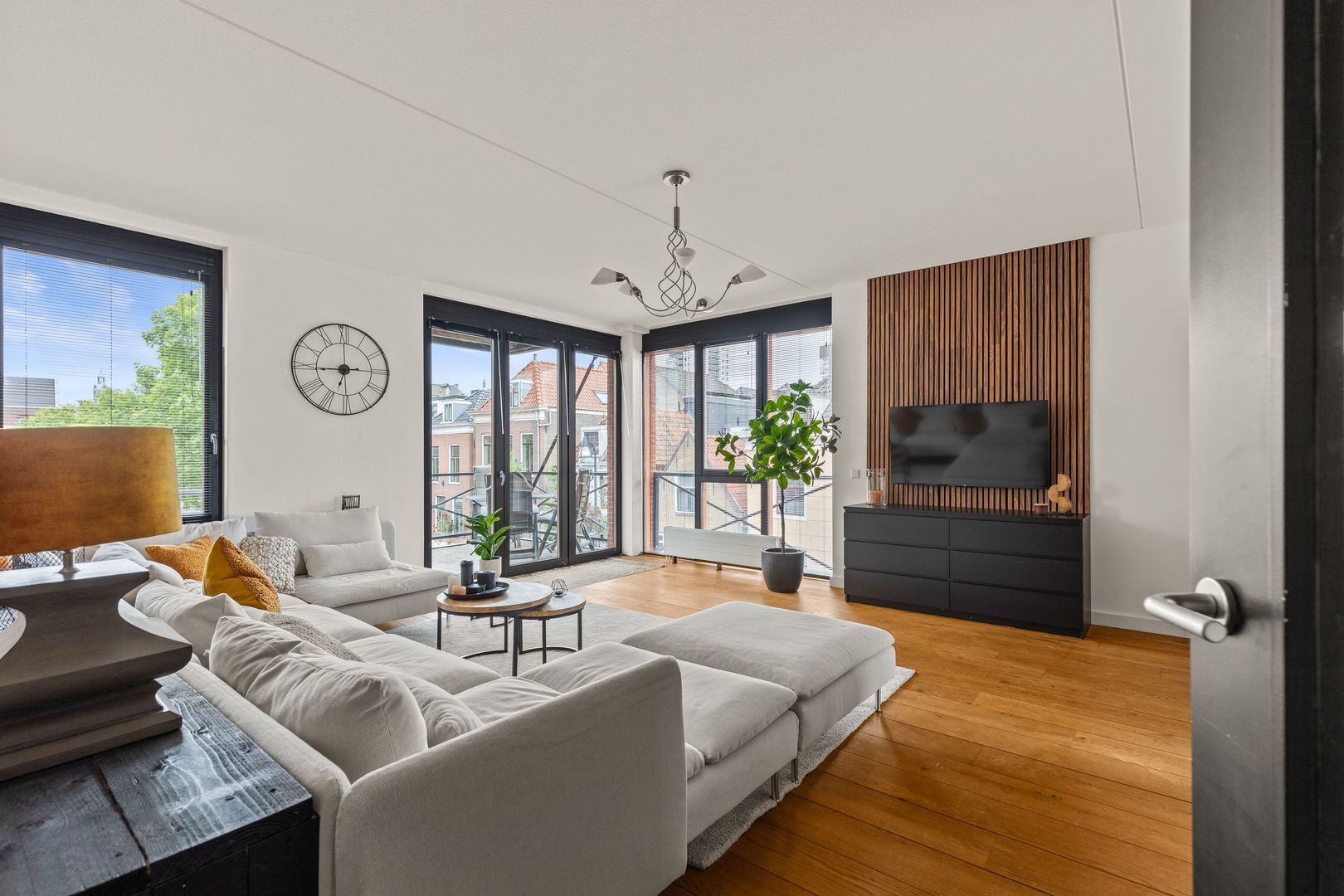 De woonkamer van 50 m2 – inclusief de keuken – heeft aan drie zijden lichtinval dankzij 6 grote panoramische ramen. De ruimte is voorzien van gladgestucte wanden en een mooie eikenhouten vloer die doorloopt naar de andere vertrekken. Via openslaande deuren is het op het zuiden gelegen terras van 8 m2 bereikbaar.
