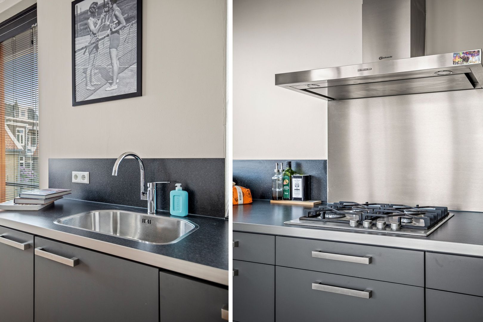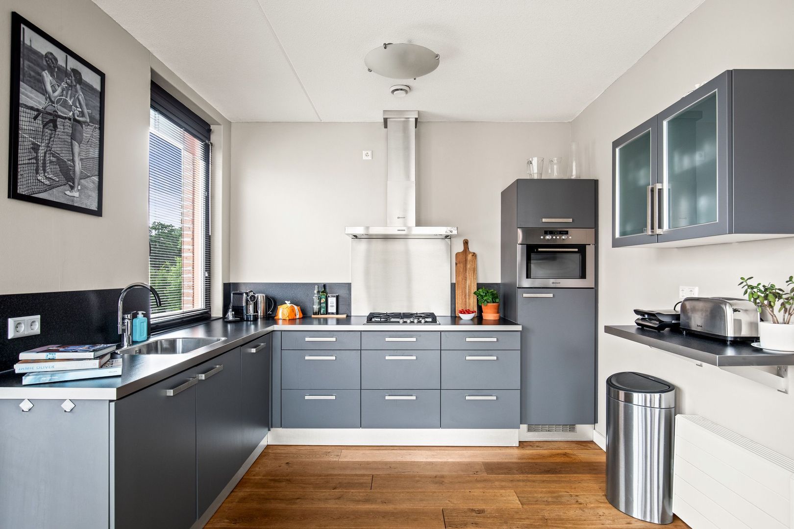 De halfopen Keller-keuken heeft een grijs front, een praktische hoekopstelling en is uitgerust met de volgende inbouwapparatuur: vaatwasser, koel-vriescombinatie, hetelucht-combioven, 4-pits gaskookplaat en een RVS afzuigkap.