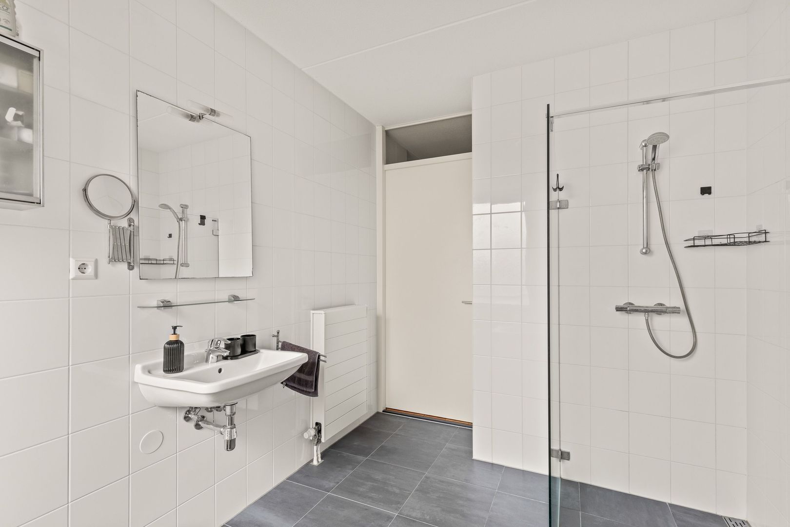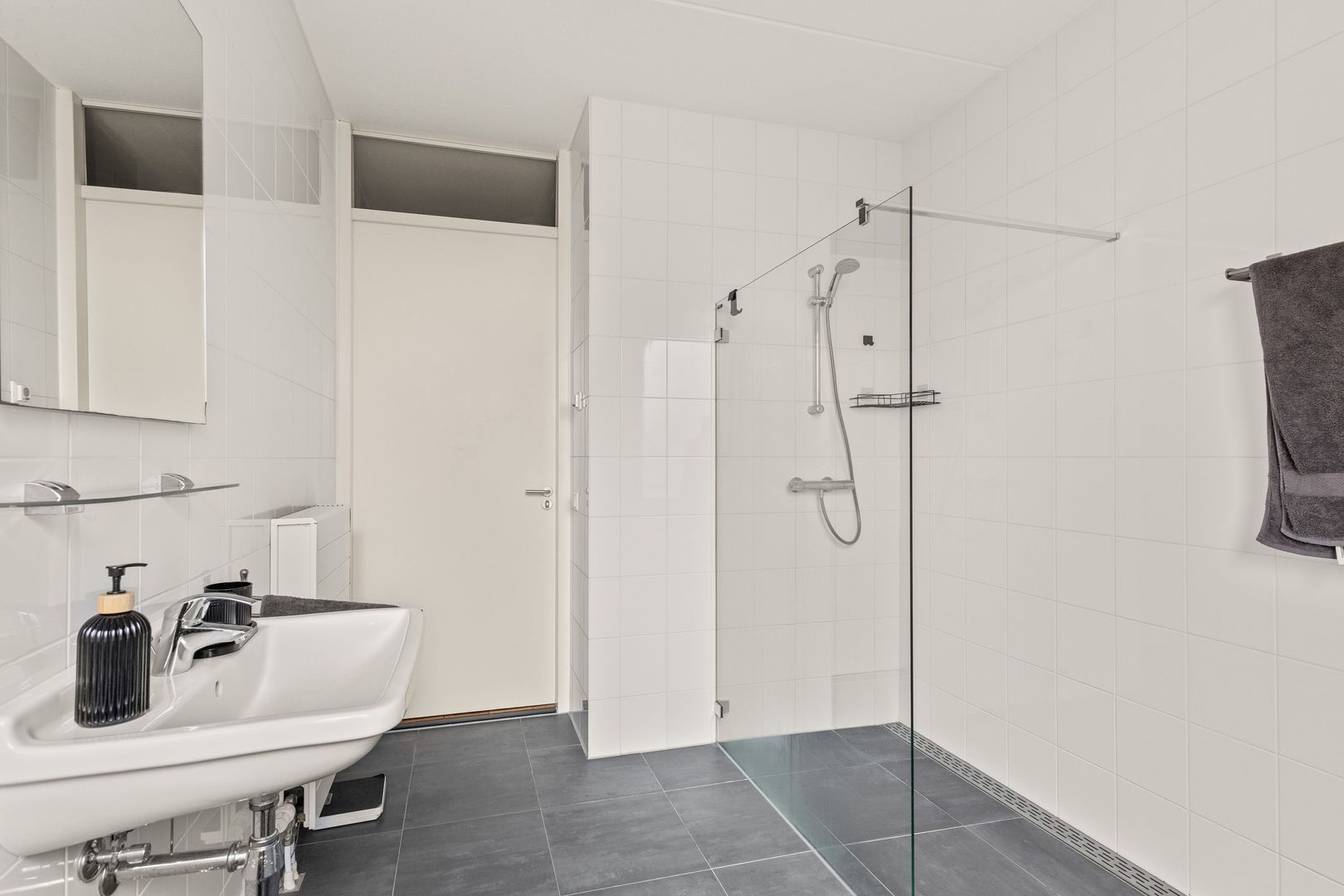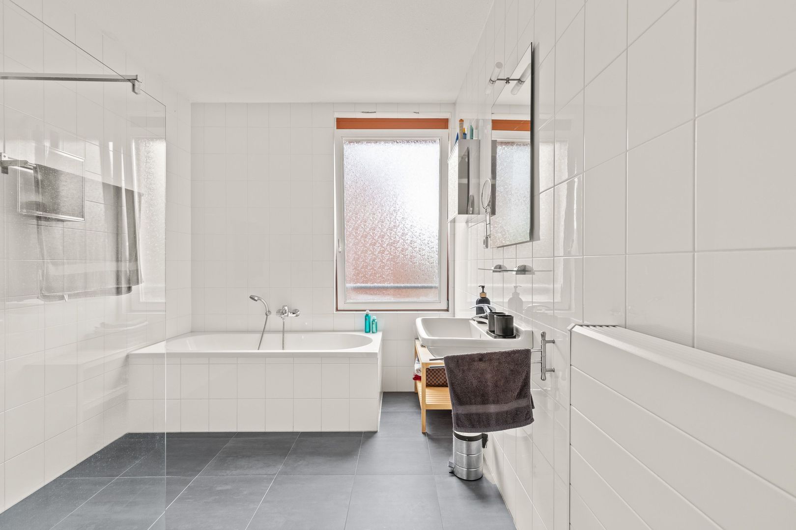 De moderne badkamer is afgewerkt met antracietkleurige vloertegels en witte wandtegels. Voorzien van een comfortabel ligbad, een brede inloopdouche met watergoot, wastafel en een groot raam dat zorgt voor veel daglicht.