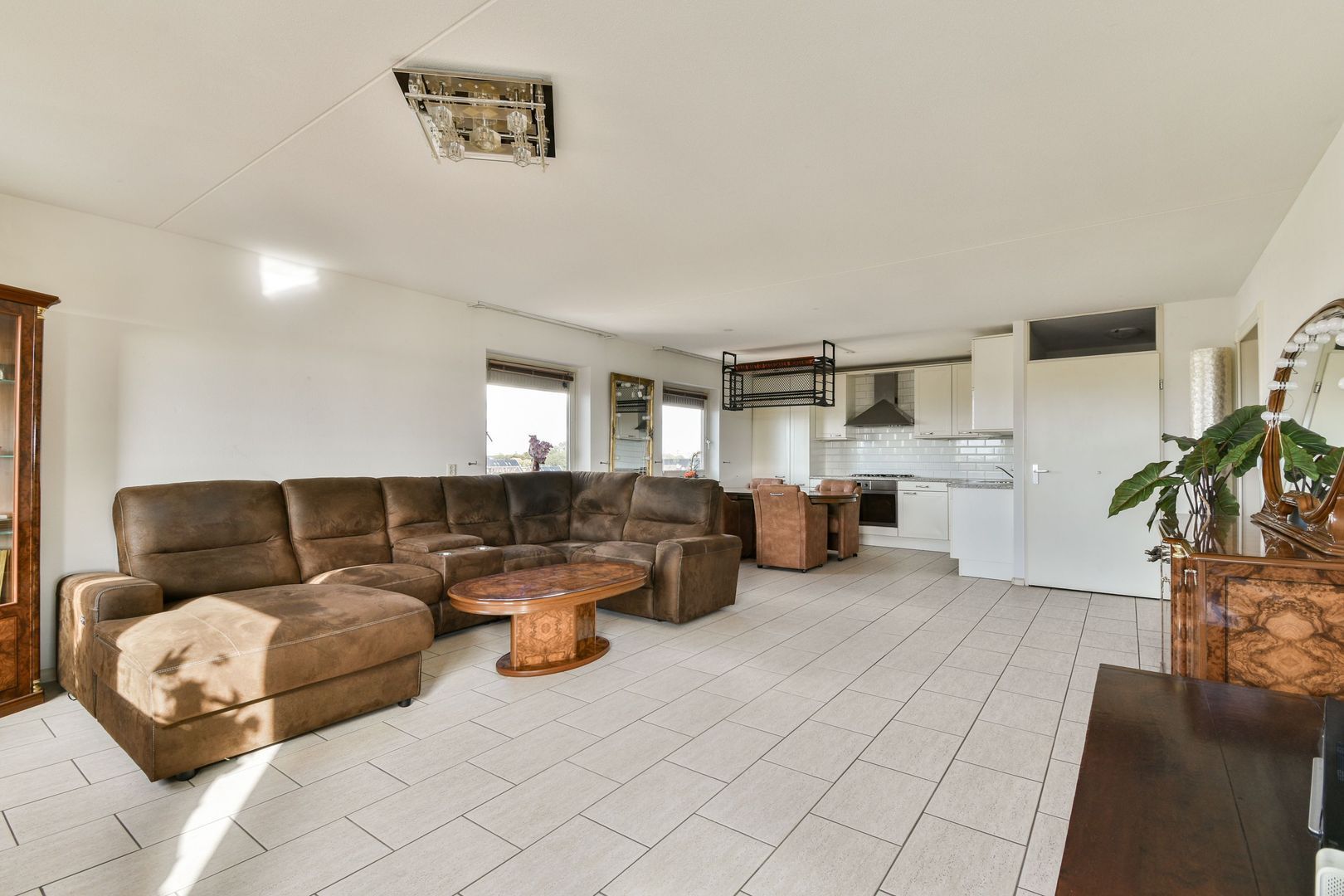 De royale woonkamer met open keuken beslaat maar liefst 48 m² en voelt heerlijk licht en ruim dankzij de grote raampartijen aan twee zijden. De plavuizen vloer, gespachtelde wanden en het nette spuitwerk plafond zorgen voor een verzorgde uitstraling.