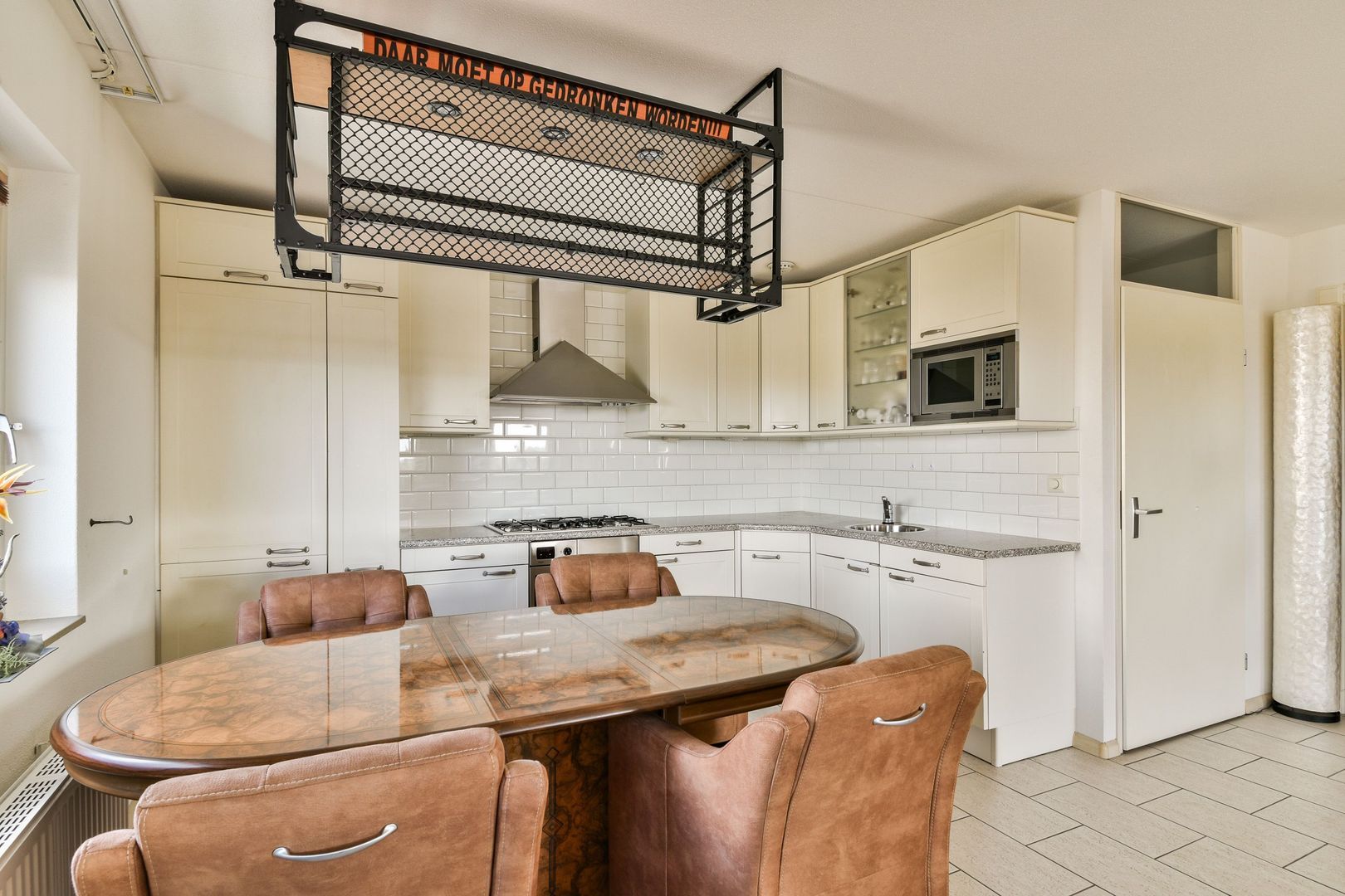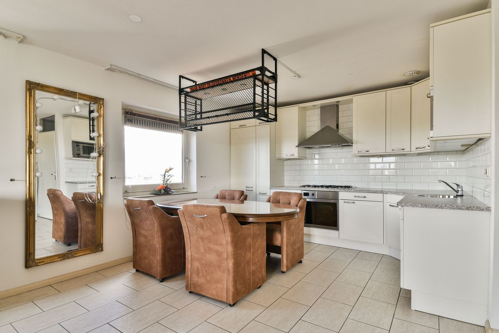 De open keuken heeft een praktische hoekopstelling en is voorzien van diverse inbouwapparatuur, waaronder een koel-/vriescombinatie, 5-pits gaskookplaat, oven en afzuigkap. Direct naast de keuken bevindt zich een ruime provisiekast, ideaal voor extra opbergruimte.