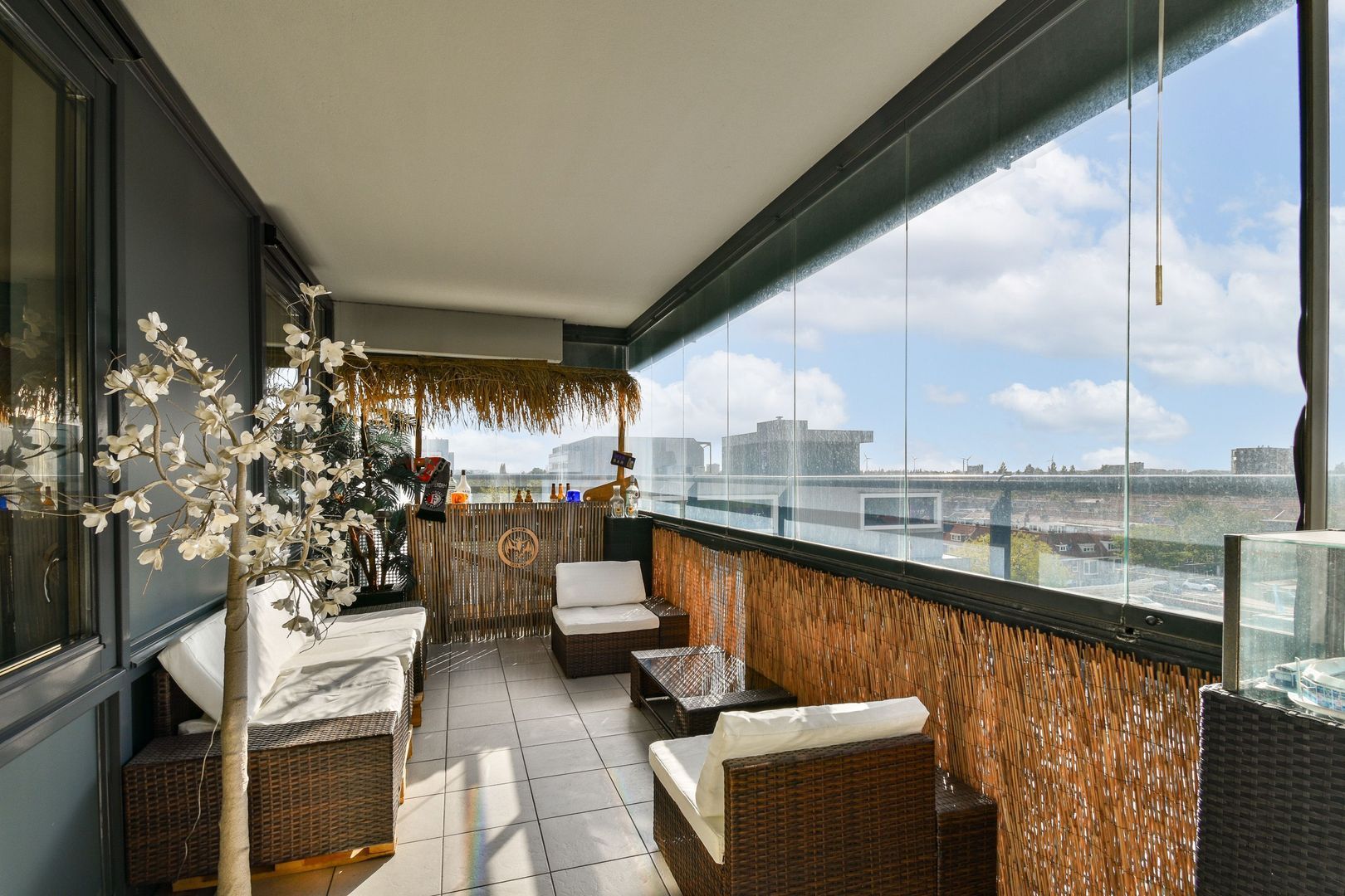 Het ruime balkon van ca. 12 m² ligt op het westen, waardoor u tot in de avond van de zon kunt genieten. Dankzij de glazen schuifpanelen kunt u hier het hele jaar door comfortabel zitten, of u nu van de zon houdt of liever beschut zit.