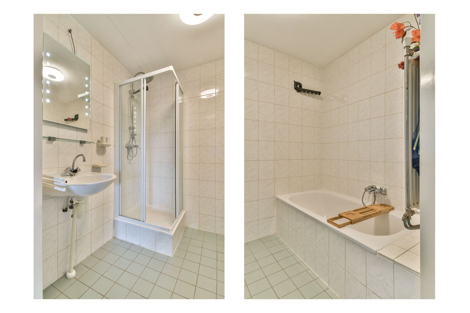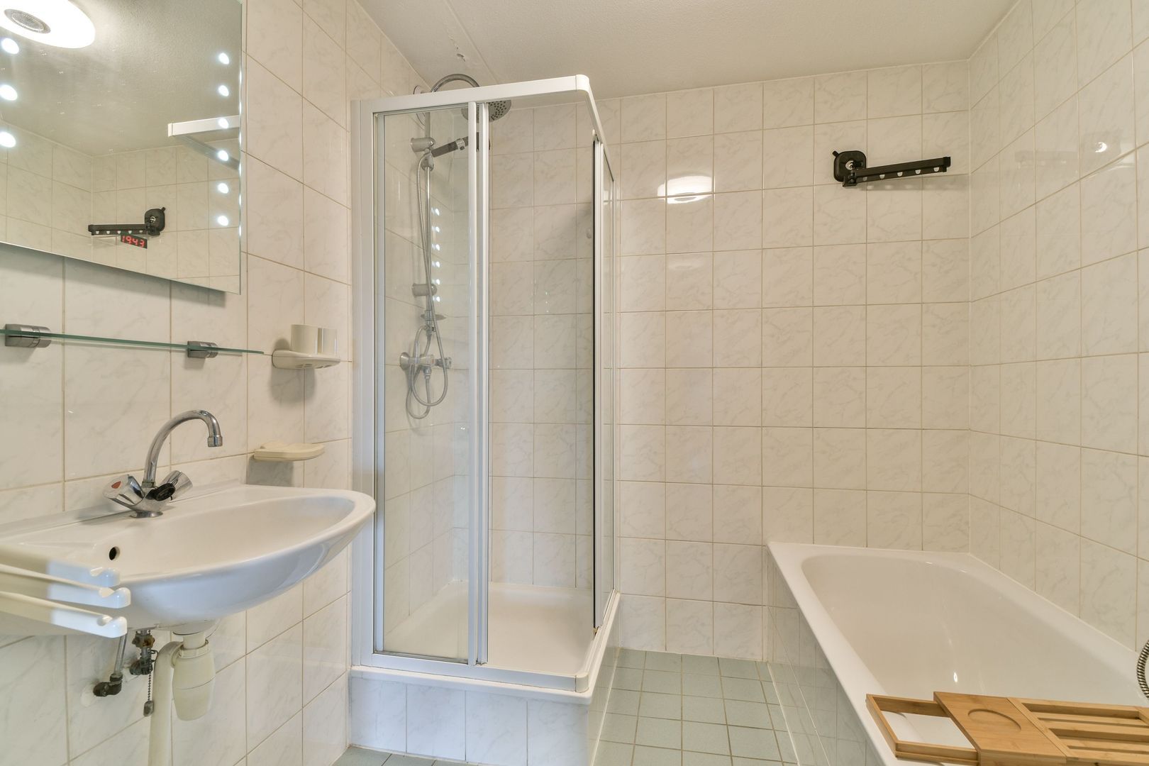 De badkamer is keurig onderhouden en uitgerust met een ligbad, aparte douche en wastafel. Het toilet met fontein is separaat en, net als de badkamer, volledig betegeld.