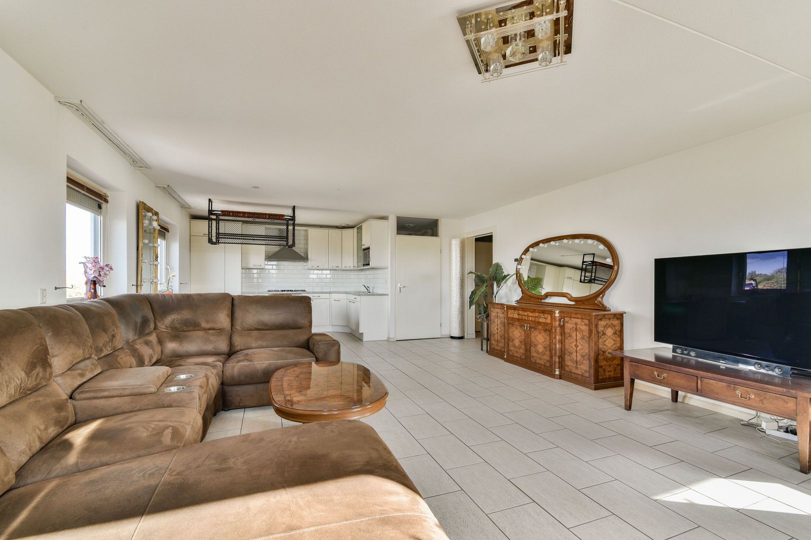 De royale woonkamer met open keuken beslaat maar liefst 48 m² en voelt heerlijk licht en ruim dankzij de grote raampartijen aan twee zijden. De plavuizen vloer, gespachtelde wanden en het nette spuitwerk plafond zorgen voor een verzorgde uitstraling.