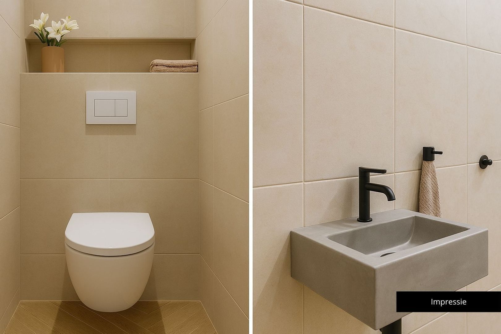 Volledig betegelde badkamer met luxe wastafel en douchehoek. Het toilet is separaat van de badkamer en is in dezelfde stijl betegeld.