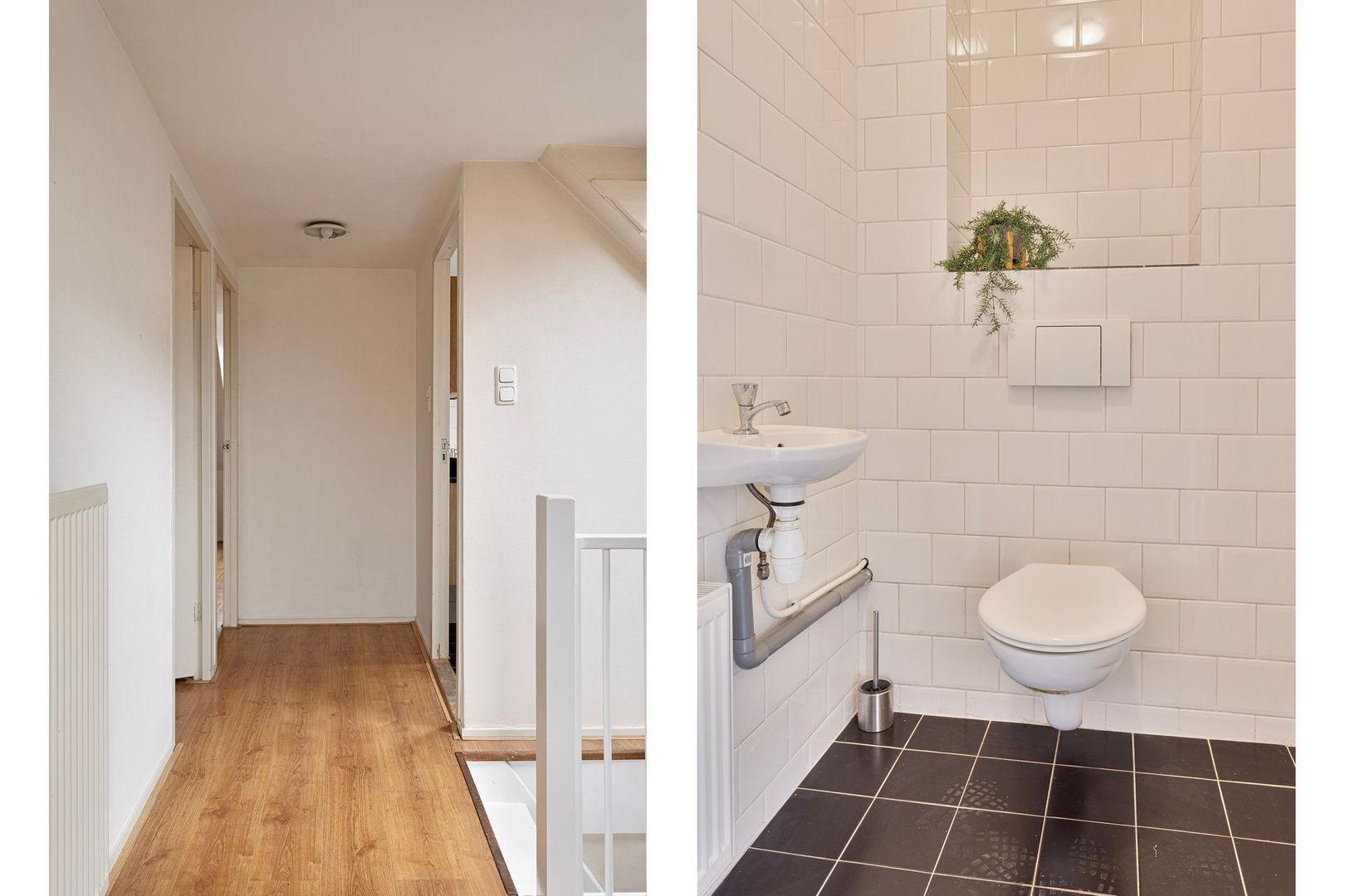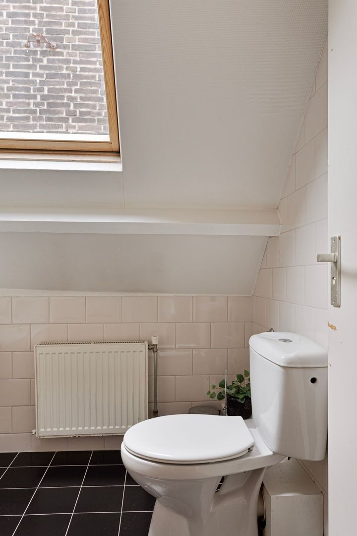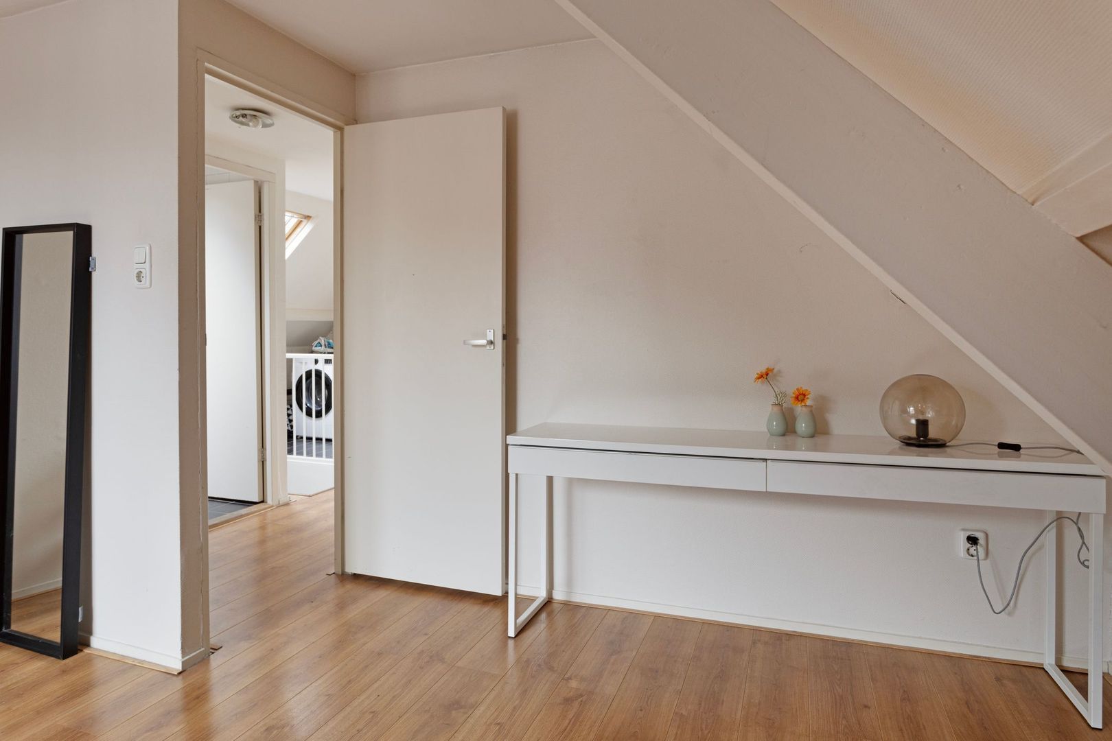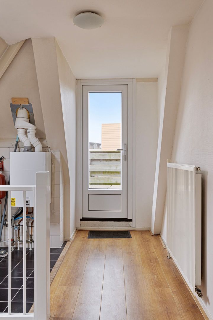 Ruime lichte overloop van ca. 10 m2 met dakraam, gehele verdieping voorzien van zelfde laminaatvloer, natte ruimte met aansluiting wasmachine, CV-opstelling en deur naar het dakterras.
