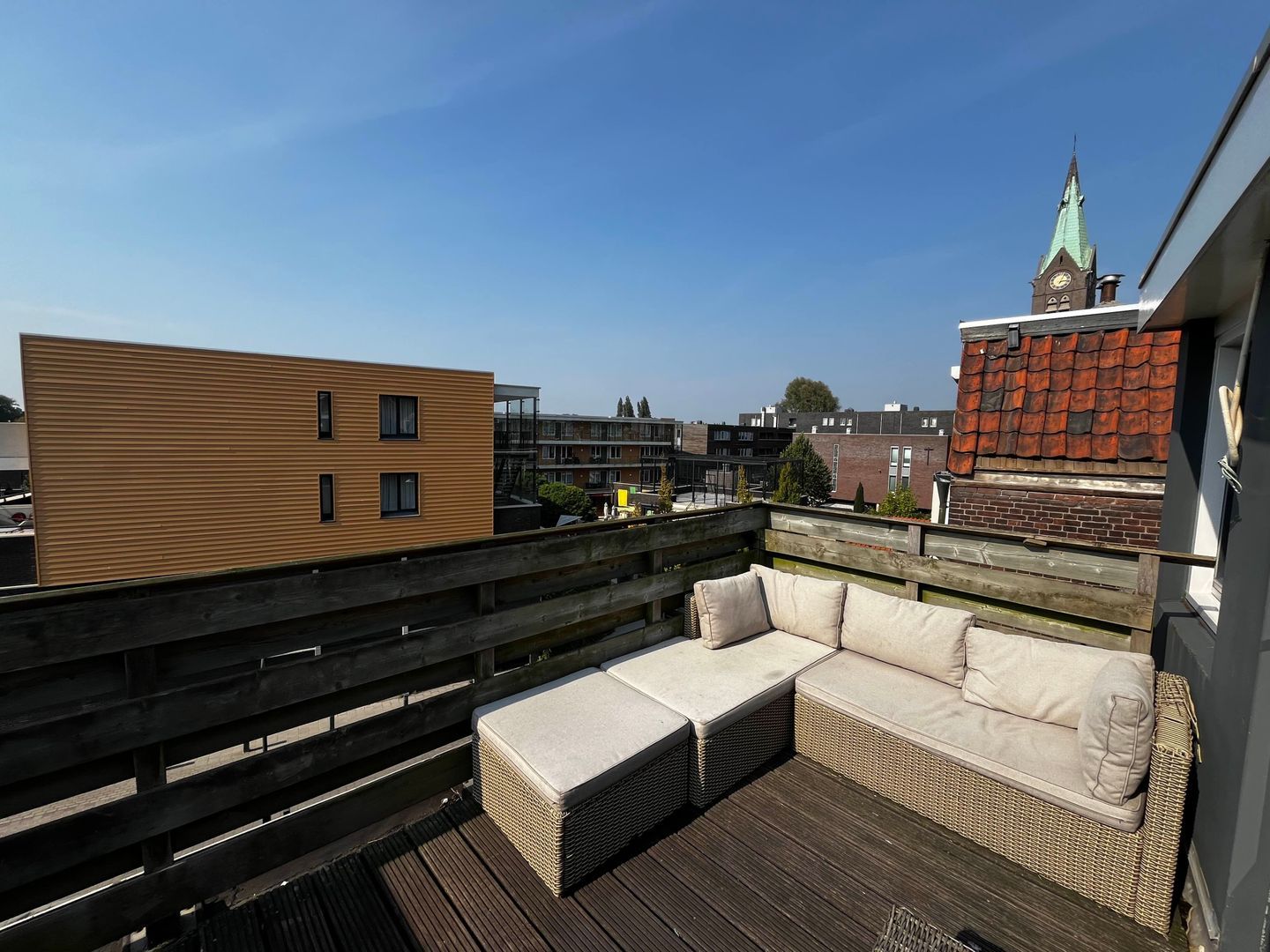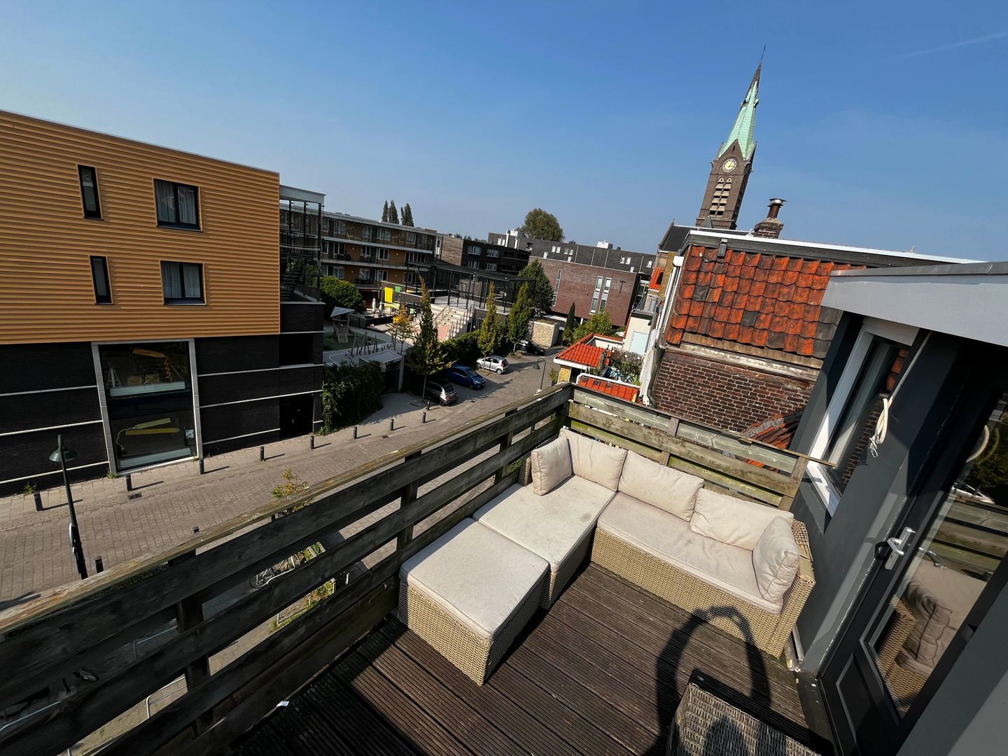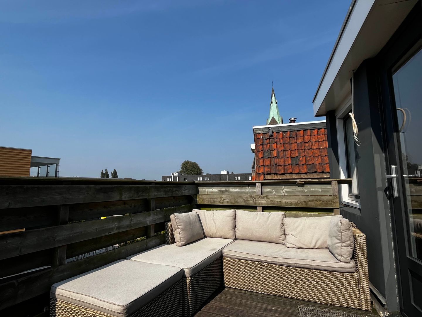 Heerlijk vrij gelegen dakterras van ca. 9 m2 met hardhoutenvlonders en houten hekwerk, de ligging is op het zuidwesten. Door zijn vrije ligging is er vrijwel de hele dag de zon op het terras.