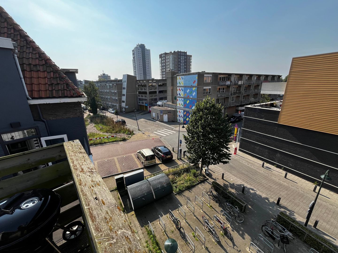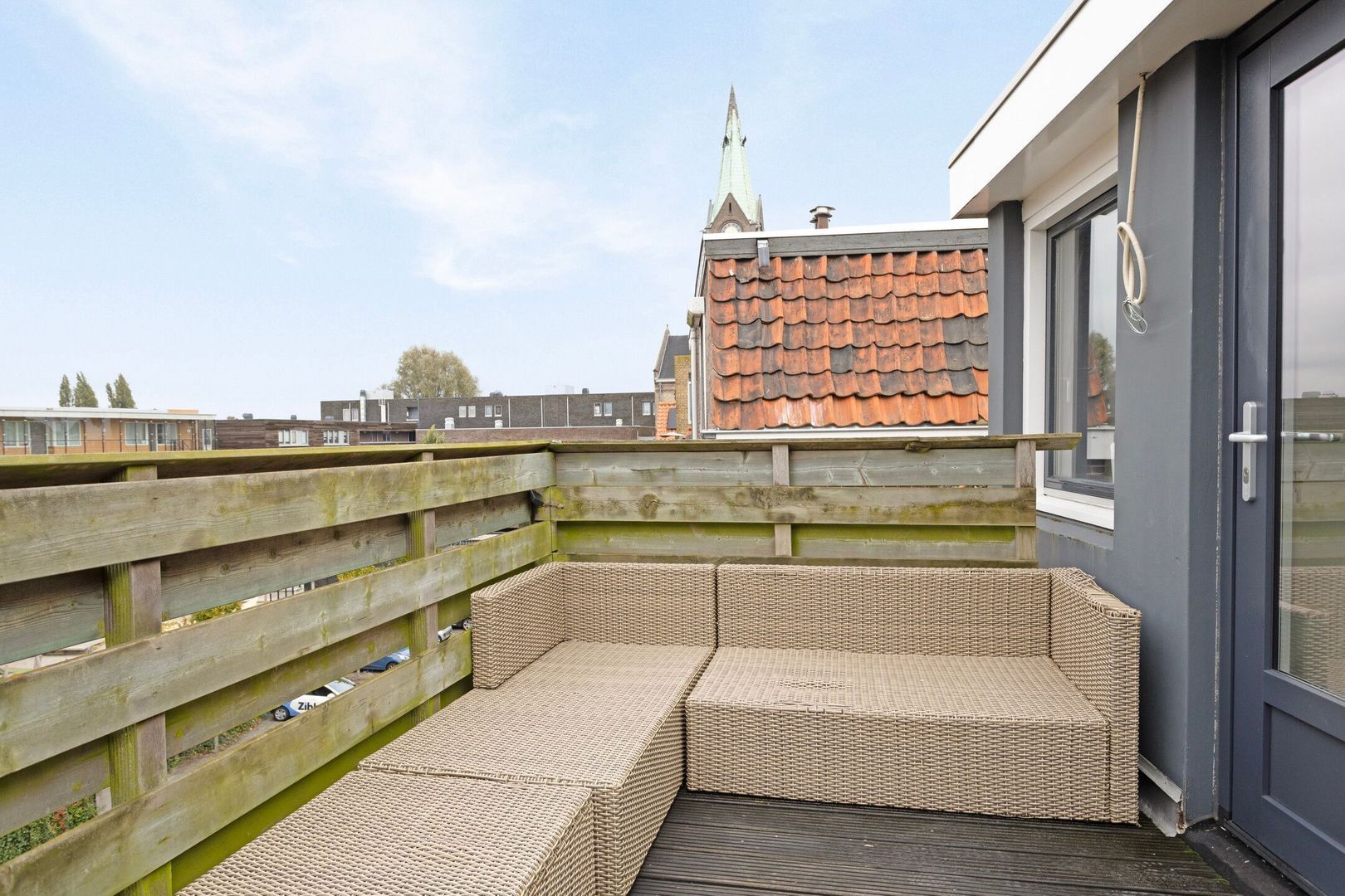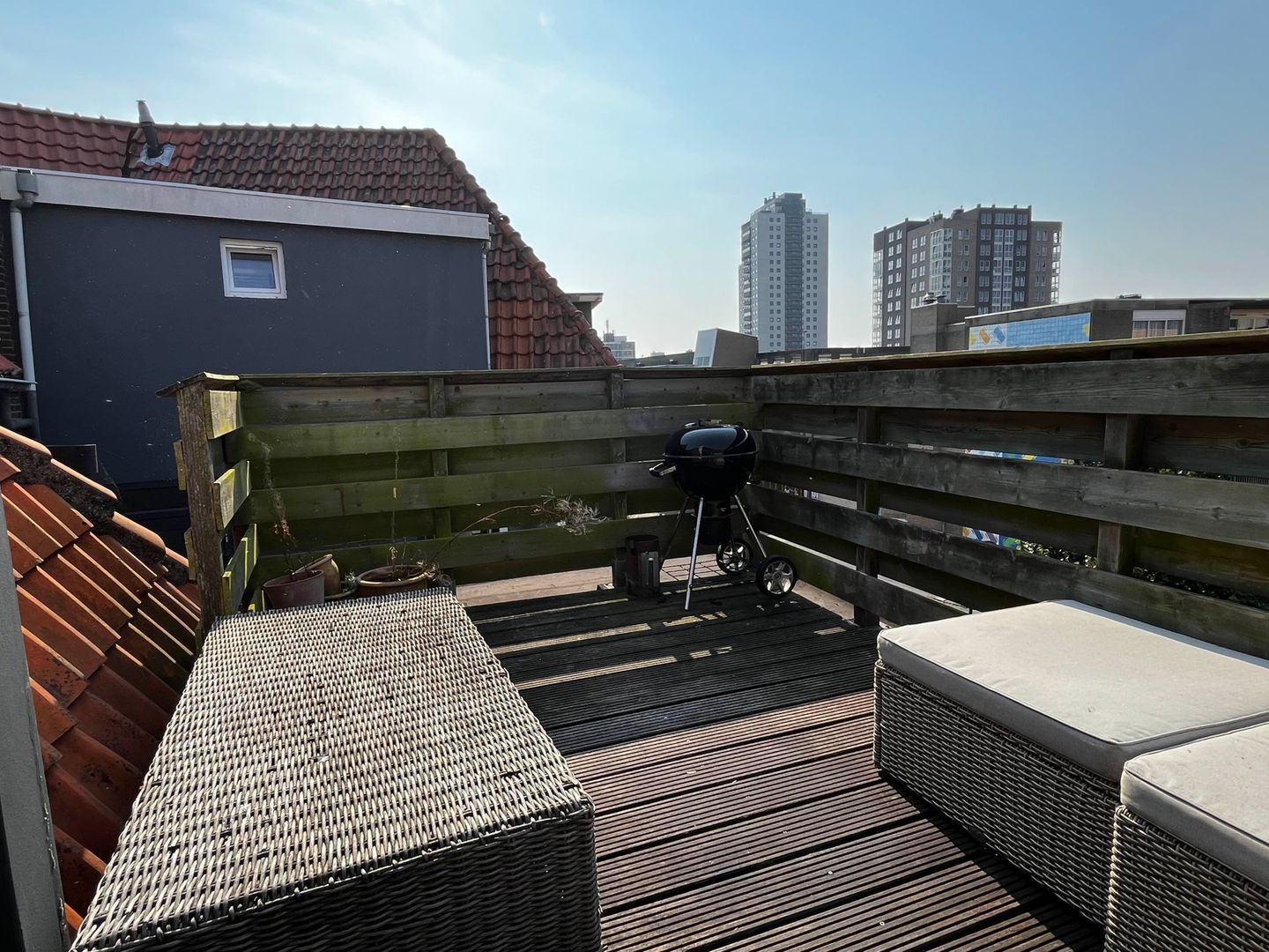 Heerlijk vrij gelegen dakterras van ca. 9 m2 met hardhoutenvlonders en houten hekwerk, de ligging is op het zuidwesten. Door zijn vrije ligging is er vrijwel de hele dag de zon op het terras.