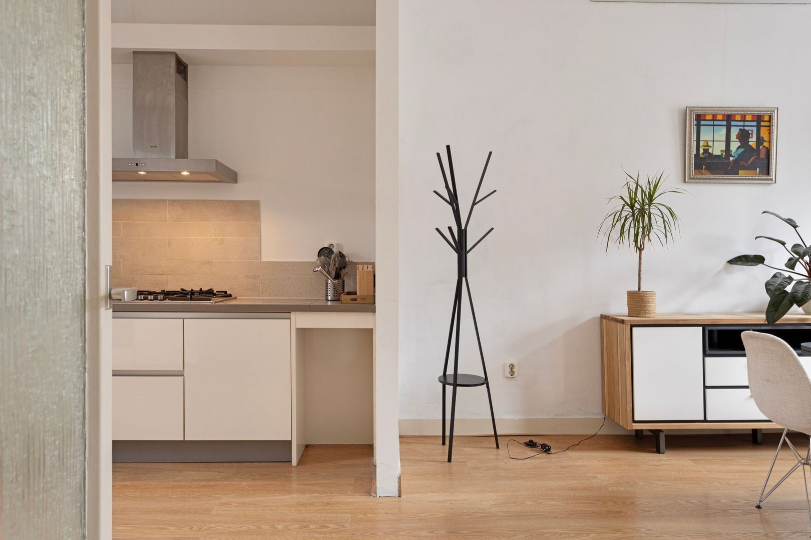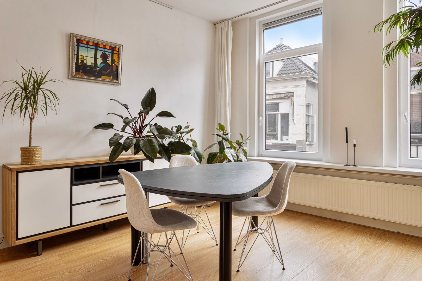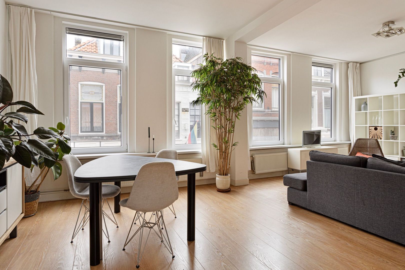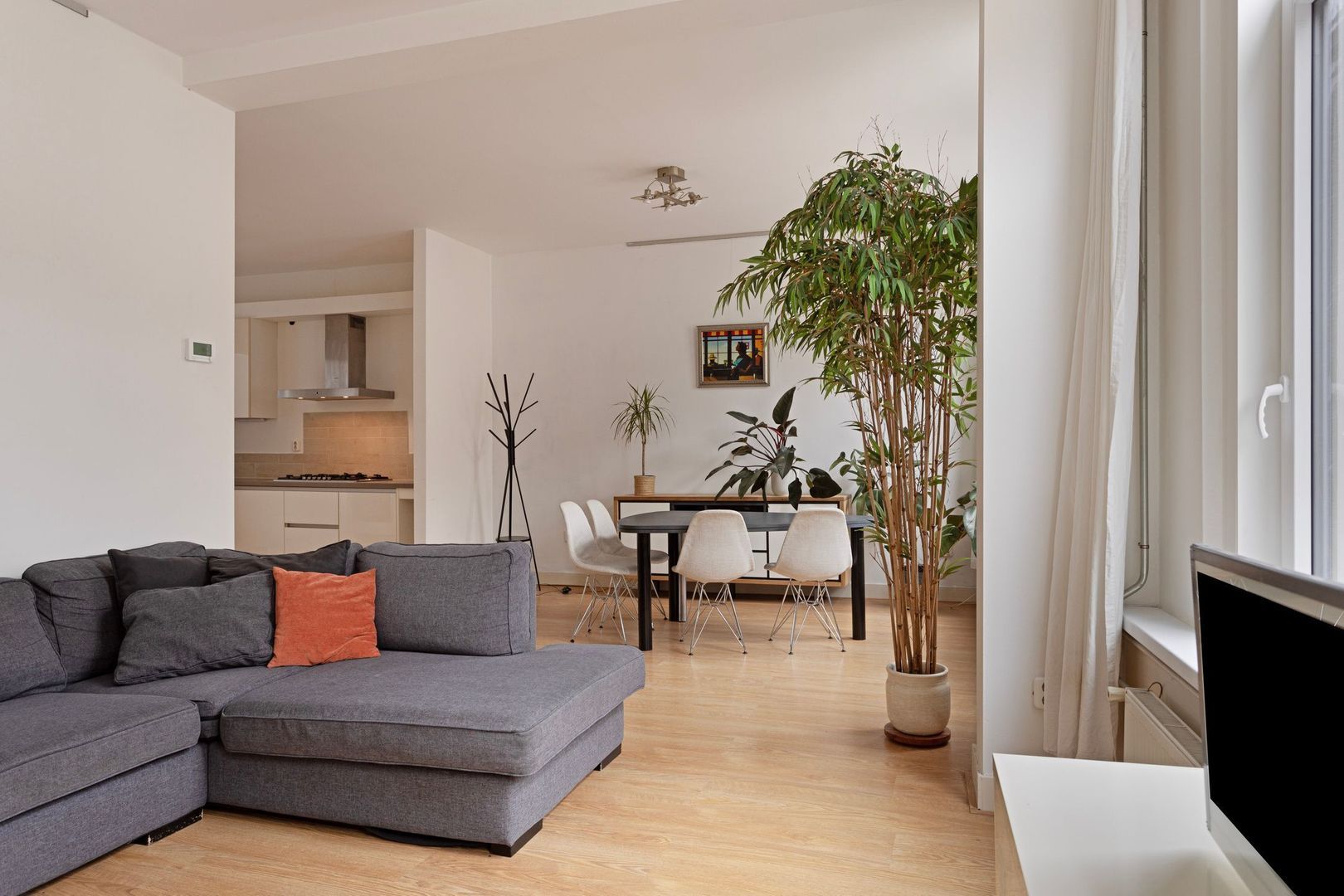 Royale zeer lichte woonkamer met open keuken van ruim 48 m2 met grote panorama draai-/kiepramen, gladde wanden, moderne laminaatvloer, hoog plafond van 287 cm.