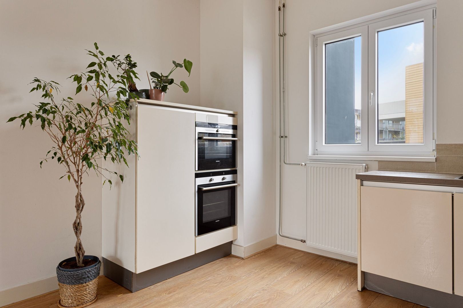 Mooie ruime opgezette keuken met composiet aanrechtblad met betegelde achterwand en de volgende Siemens inbouwapparatuur: RVS afzuigkap, 5-pits gaskookplaat, ruime koelkast, aparte 3-laden vrieskast, vaatwasser (2024), heteluchtoven en aparte magnetron.